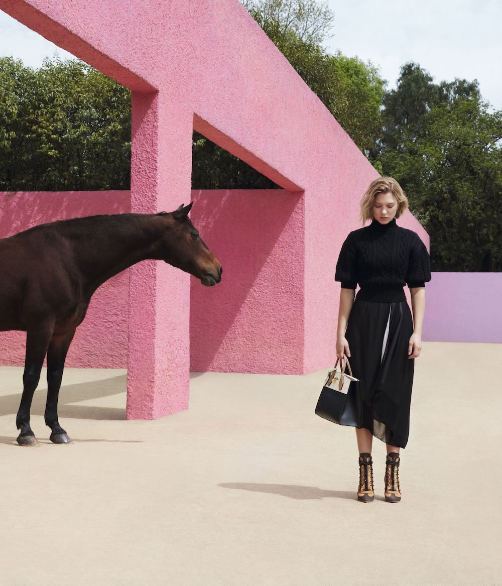In the history of fashion, the horses were part of the wide western or country theme, and in part, this link has remained, as in the SS17 Versace campaign, that is focused around the relationship between models and horses. In recent years, however, the connections that seemed logical have been distorted, preferring to include the animal and all its symbolic meanings in evocative place or in less obvious settings. Just think about the chromatic power of the Louis Vuitton SS16 campaign, with a black horse inserted in a flamboyant pink architecture, creating, together with Lea Seidoux, a very strong scenic effect, as well as with another star like Kendall, who chases a horse in the video for the 70 years of Longchamp. There are many brands and interpretations, Chloè, Loewe, and a beautiful black horse also for the gothic Alexander McQueen style.