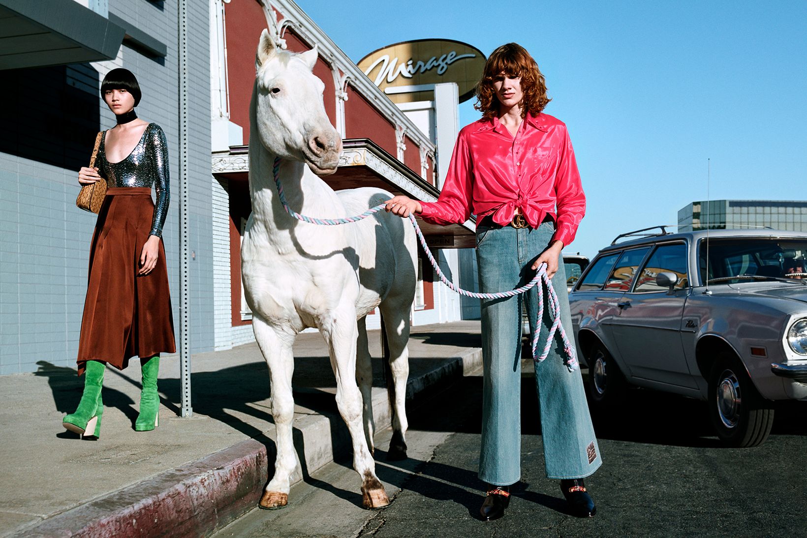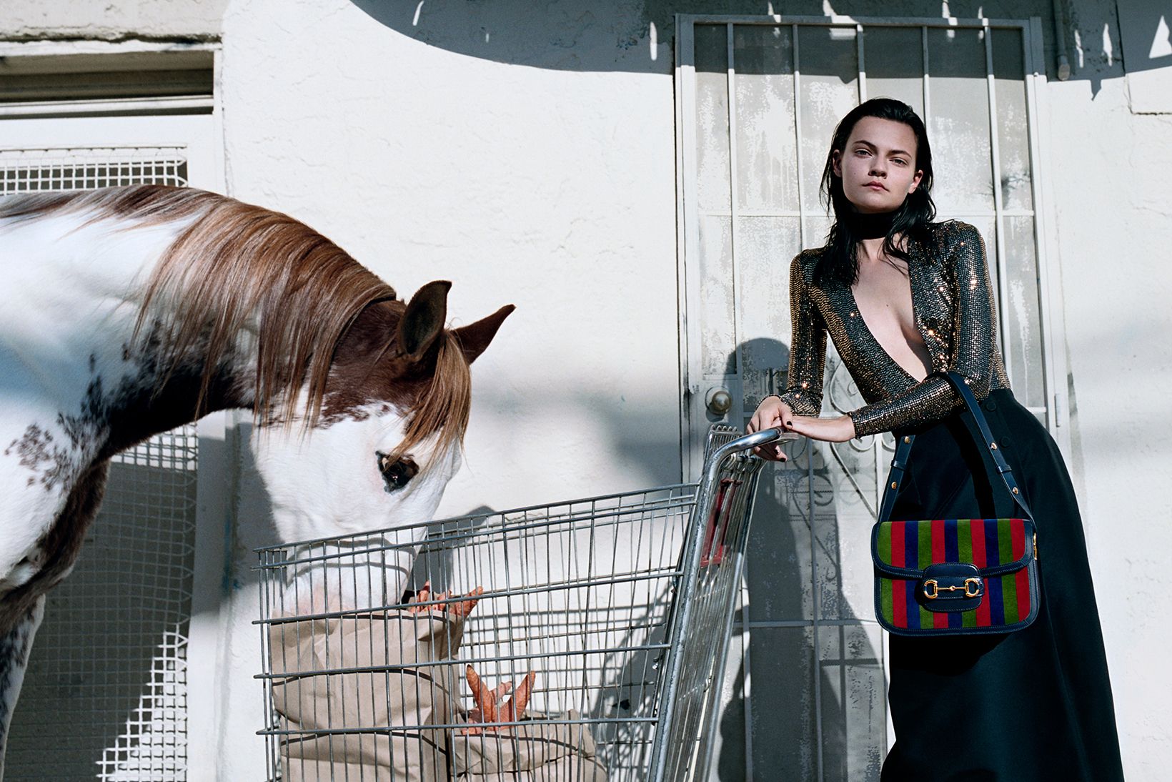 Since two years Gucci has been collaborating, for the realization of his campaigns, with the Spanish illustrator Ignasi Monreal, who drew a black horse - the favourite colour -, placing it in a dystopian landscape, in which the knight with the gold armour looks at his cell phone. Also for its SS20 Retro collection campaign, Gucci has chosen as protagonists a series of real horses, portrayed by director Yorgos Lanthimos in the most different locations of Los Angeles: on the beach, in a hotel, in a pool, even on an aeroplane. The animal returns in front of the lens as the symbol of freedom that was the main topic of the latest show of the Italian fashion house.
