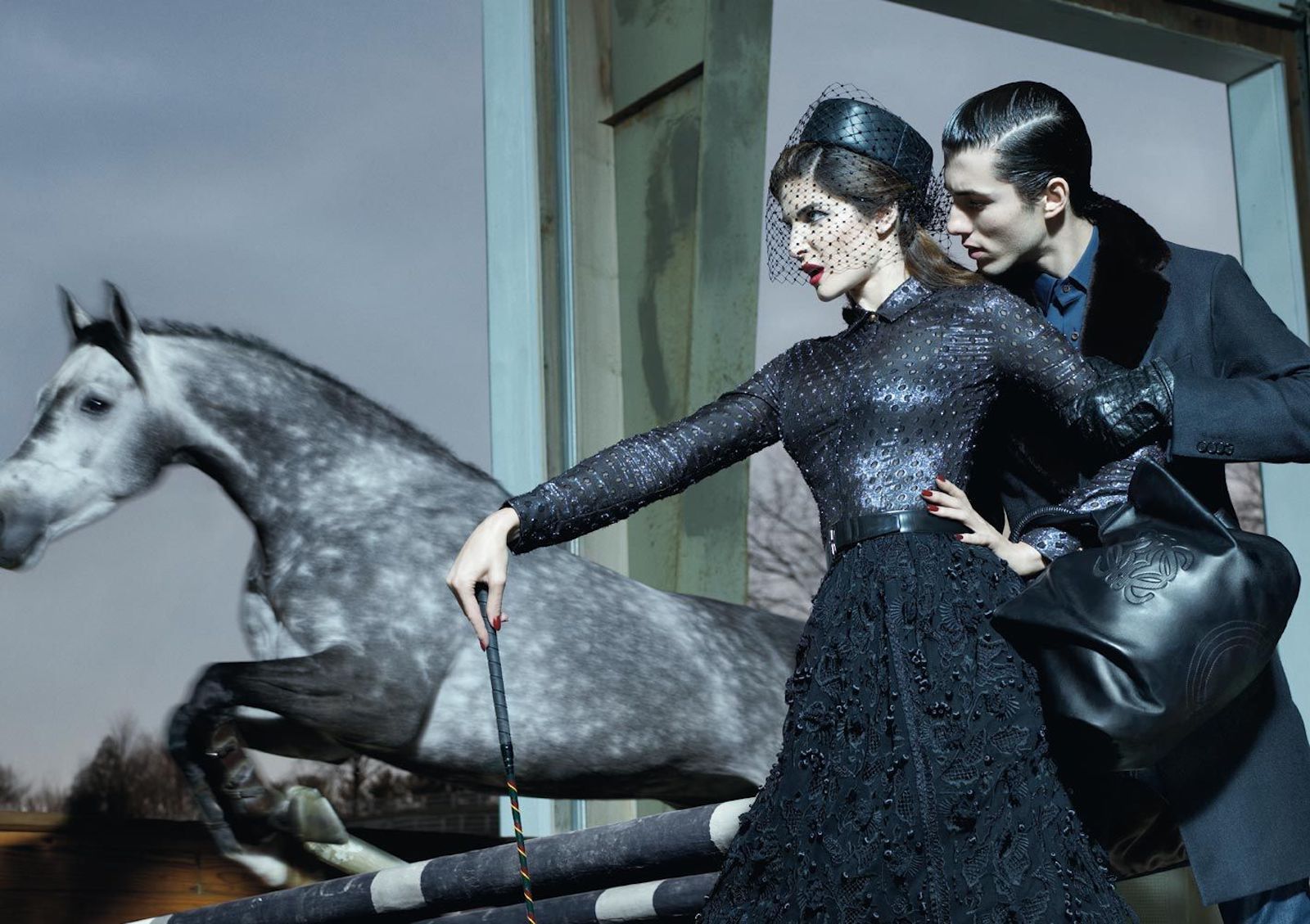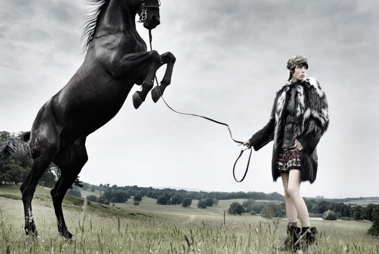 Two of the greatest fashion photographers in recent years such as Oliviero Toscani and Mario Testino are connected by a large number of shots that involve horses. Toscani made them famous in one of his scandalous shots for Benetton, catching the mating moment. Testino used them much more often, above all for foreign editorials, rarely Testino uses static horses, usually, his horses are photographed dynamic, in a simple trotting walk, galloping or even during a jump. Symbolism, silhouette and power, the best way to describe both fashion and horses.