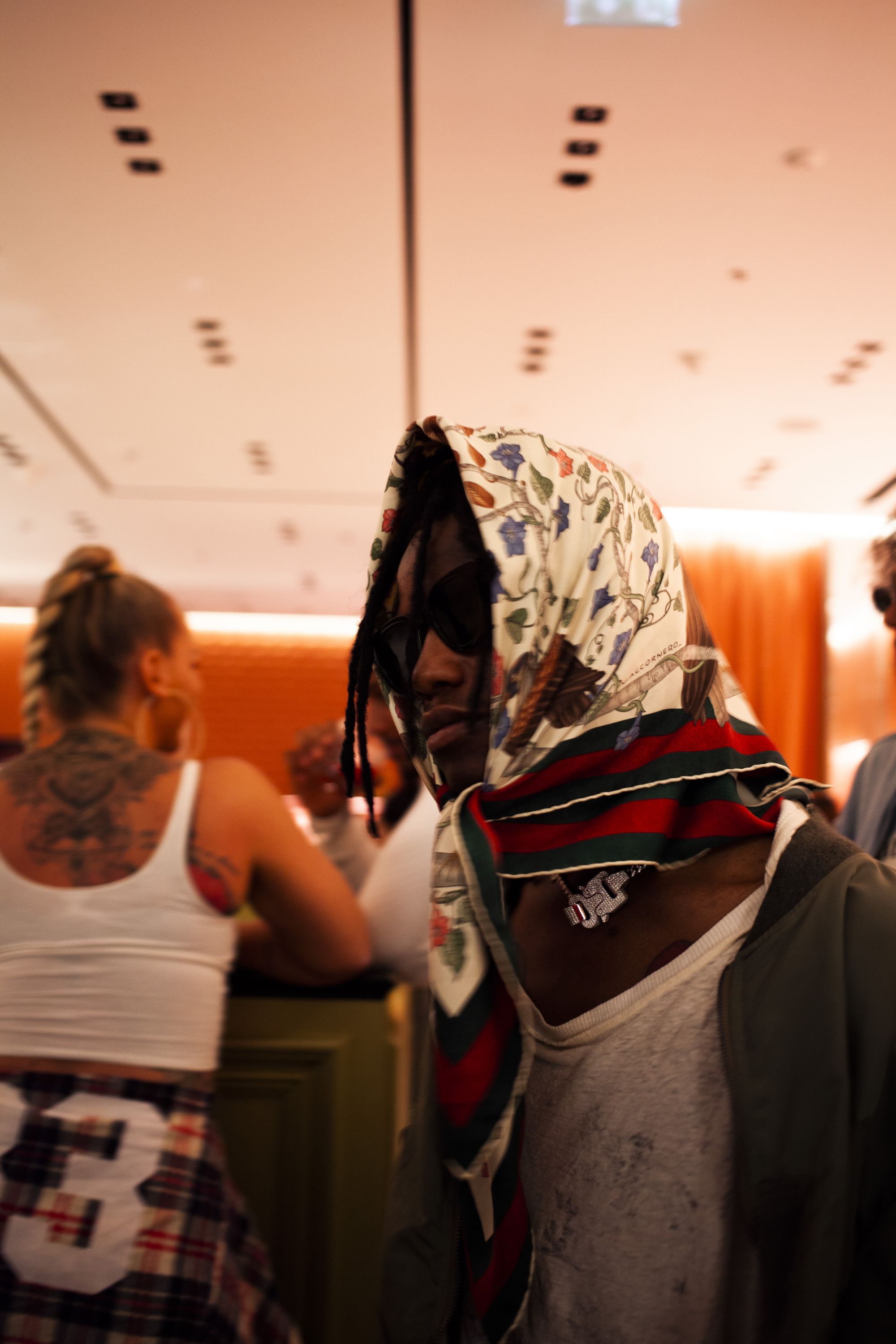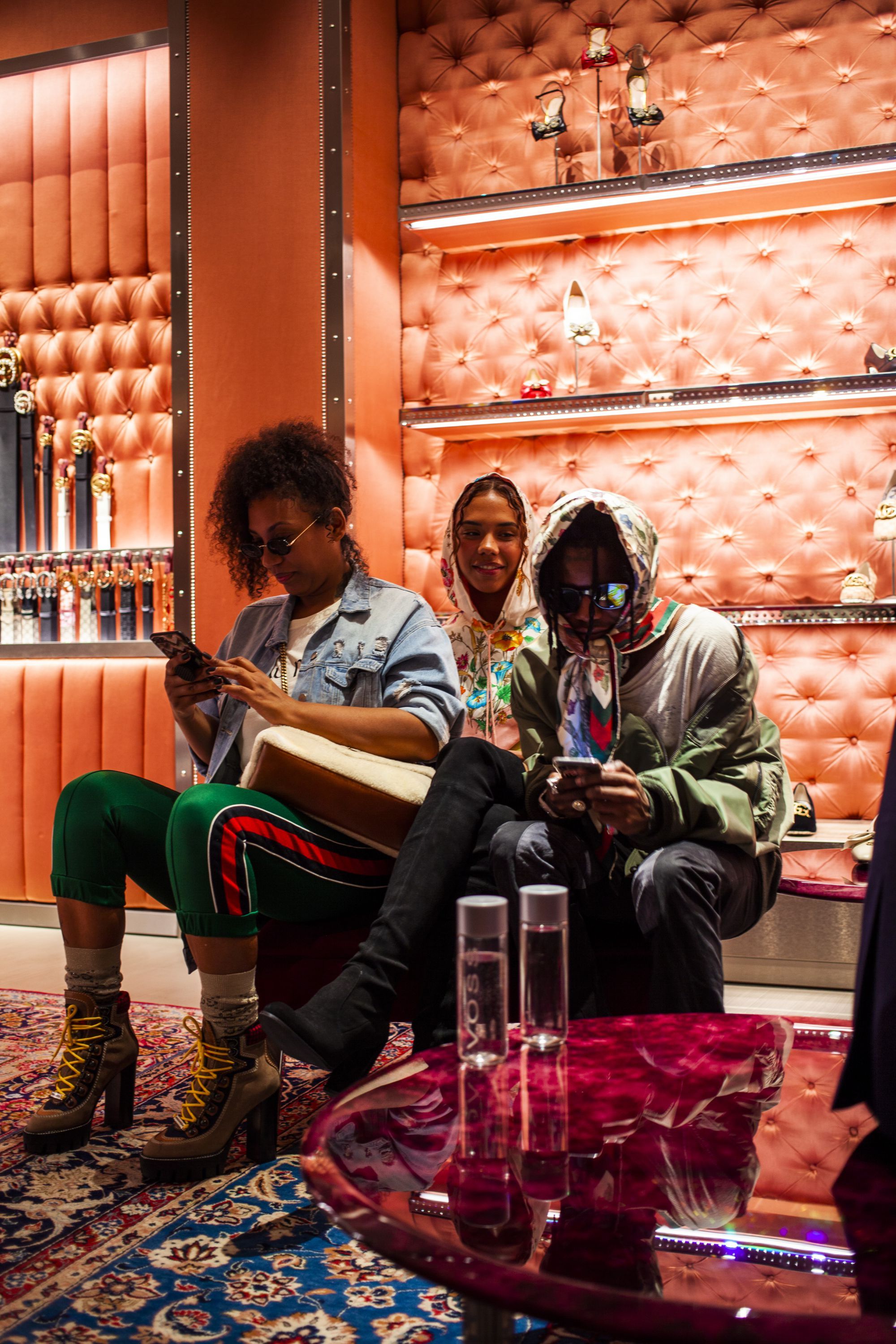 To start, we had the chance to visit the Gucci store inside the Dubai Mall, a real city within the city of Dubai. For the occasion, Gucci had reserved its invitations to special guests from all over the world. A trap DJ set, and cool kids animated the new store, but if this was not enough, the arrival of a surprise guest further animated the situation. Covered by a Gucci headscarf - of course - were the inseparable Ian Connor (also with a scarf), and A$AP Rocky quietly wandered around the store, taking a look at the items on display.