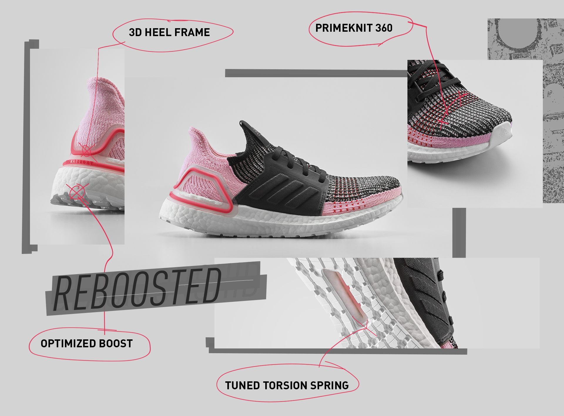 The pre-research phase for the UB19 has been immense, gathering real-life practical information on how to push a running shoe further, gathering data from thousands of runners in the field. The result streamlined the design process from 17 pieces down to 4 key elements, the Tuned Torsion Spring System, the Boost sole, the 3D Heel frame, and finally the prime knit 360 upper. The Torsion Spring is the main player, introduced in 1988, the adidas Torsion system is a thermoplastic arch support designed to allow the forefoot and rearfoot to move independently and adapt to running surfaces without straining the foot through excess motion, allowing the midfoot to naturally adjust to the ground and offering high levels of support and stability which are suitable for a range of sports.