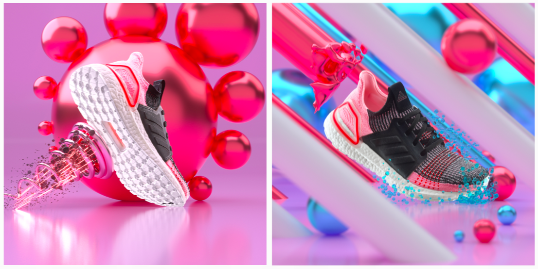 Sneaker features:Optimized BOOSTPrimeknit 360The first artwork’s about the Primeknit feature is all about being comfy so I imagined what’s comfortable for me and apparently, that’s being surrounded by squishy iridescent pink bean bags in a womb-like situation. You know your boy’s favorite color is pink but it would be holographic if that was a color.I’ve been playing some Rocket League, the hot wheels soccer car game, and when your car goes super fast you get those colorful trail boosts. The Bat Orchid’s Optimized Boost feature is all about ultraboosting your foot while you run so the connection was already in my mind: iridescent plasma boost for your feet.