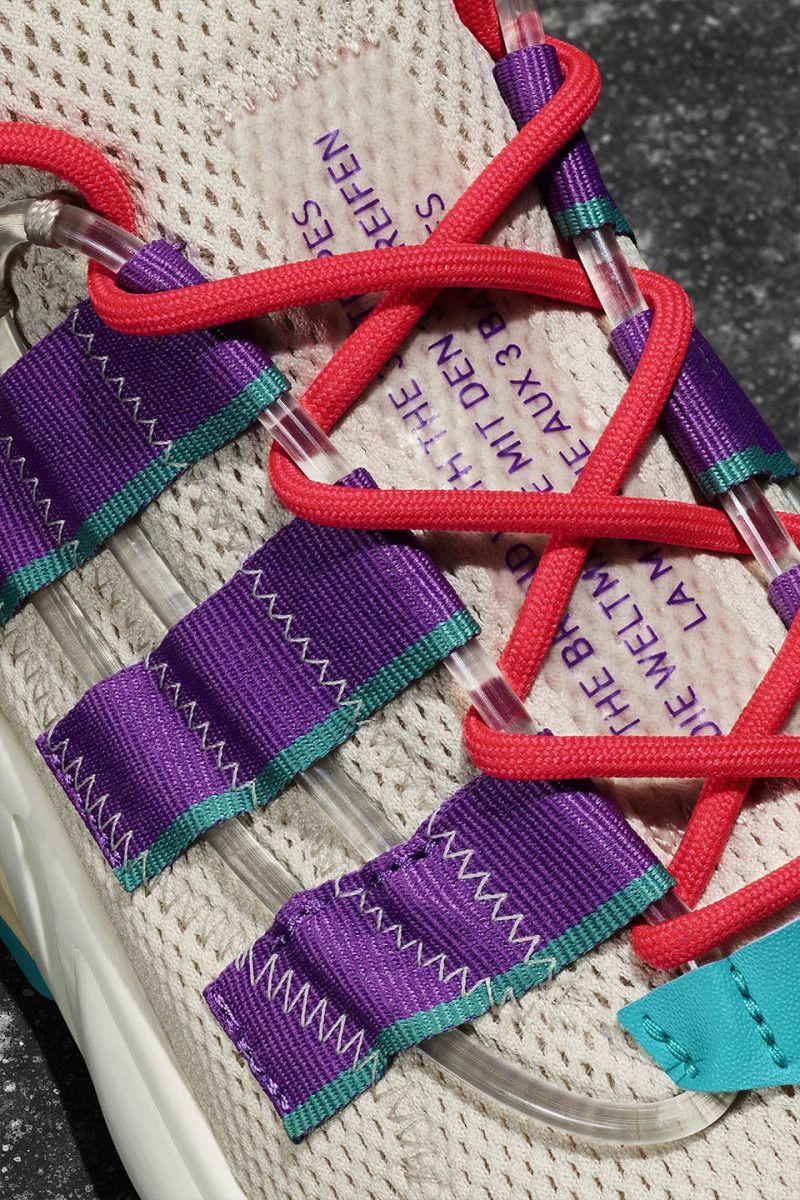 Now we finally have all the details on the new adidas Originals sneaker, called Lexicon Future. The shoe is characterised by an adiPRENE midsole, that gets chunkier the closer it gets to the heel, the upper is in mesh, adorned by the classic lateral Three Stripes, and it features a lacing system with transparent inserts. The sneaker is available in two colorways, brown/purple/red or white/blue/black, like the one sported by Hill.