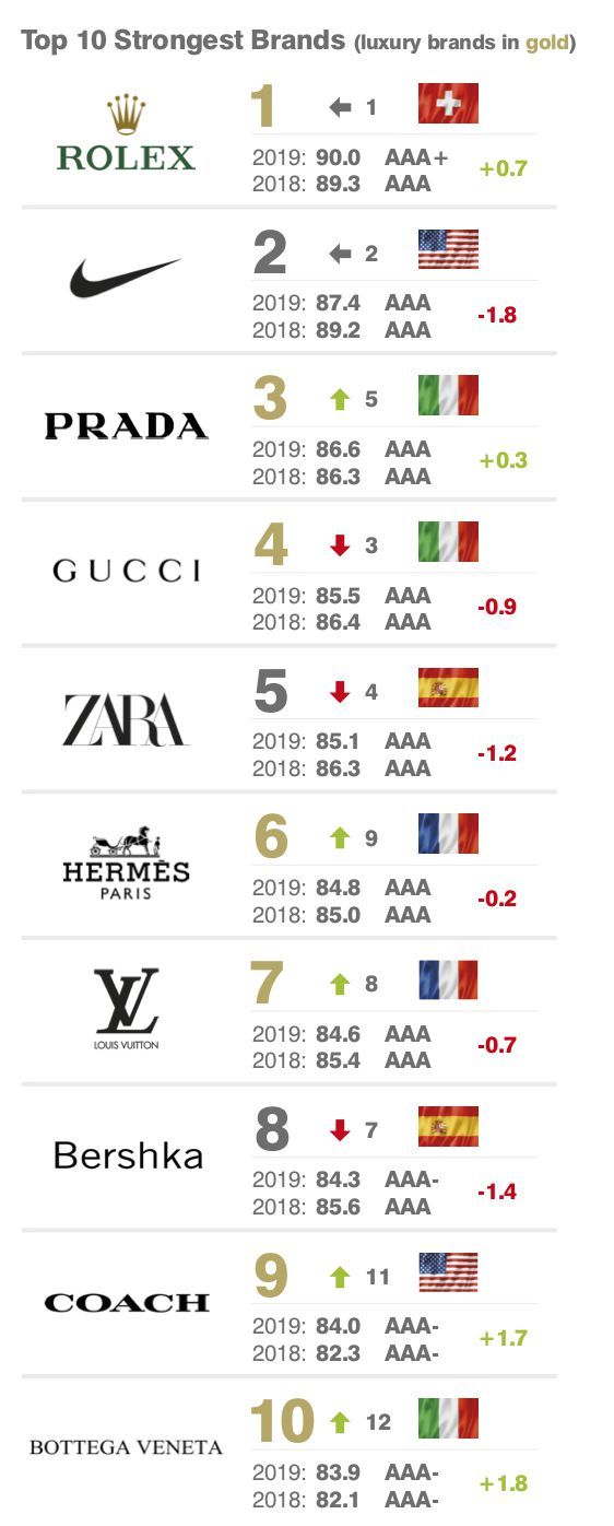 Alongside side the overall brand value, Brand Finance also determines the relative strength of brands through a balanced scorecard of metrics evaluating marketing investment, stakeholder equity, and business performance. Along with the level of revenues, brand strength is a crucial driver of brand value. There we see Rolex take the first place spot as the worlds strongest brand, which may come as a surprise to some, followed by Nike, Prada, Gucci, and Zara.