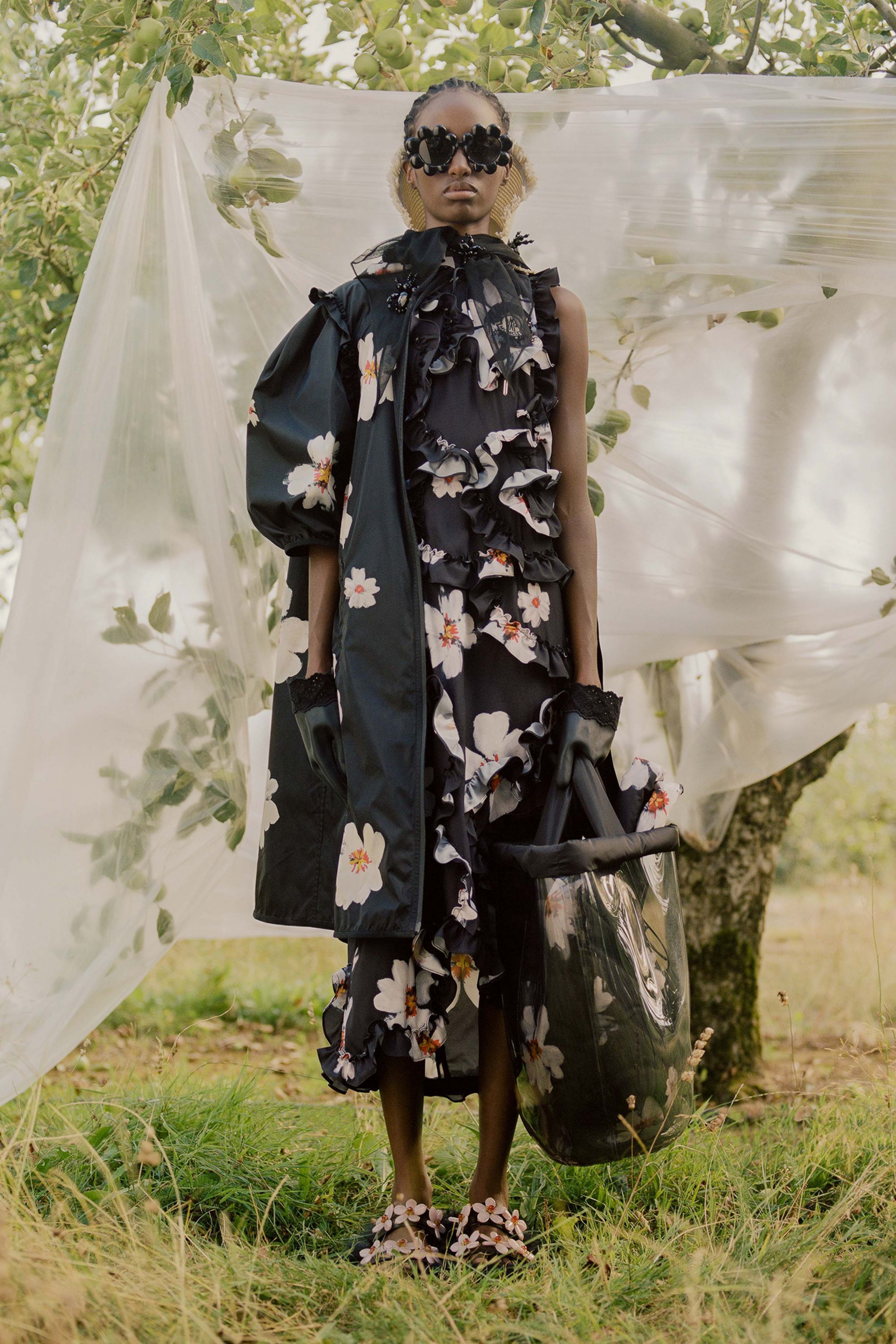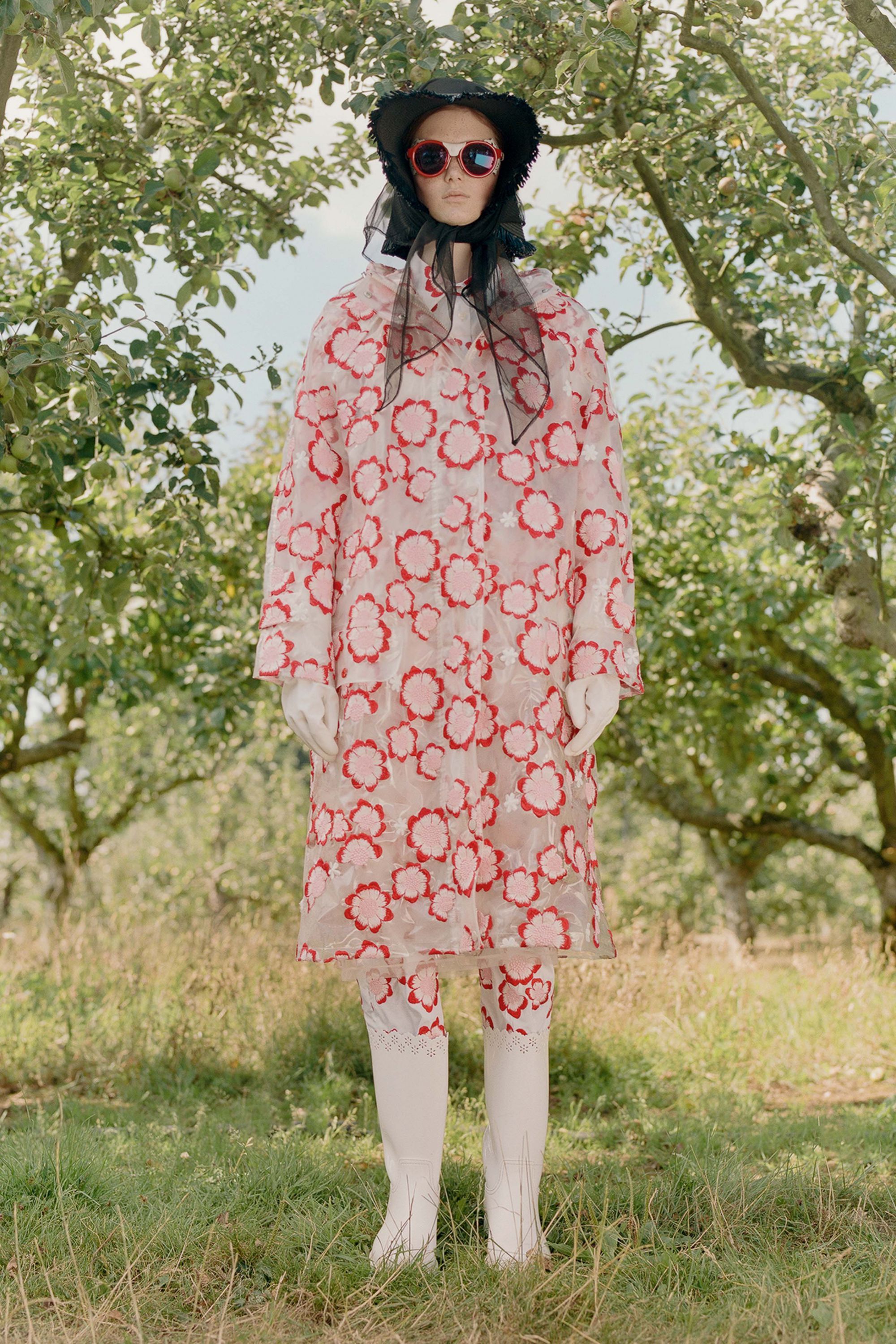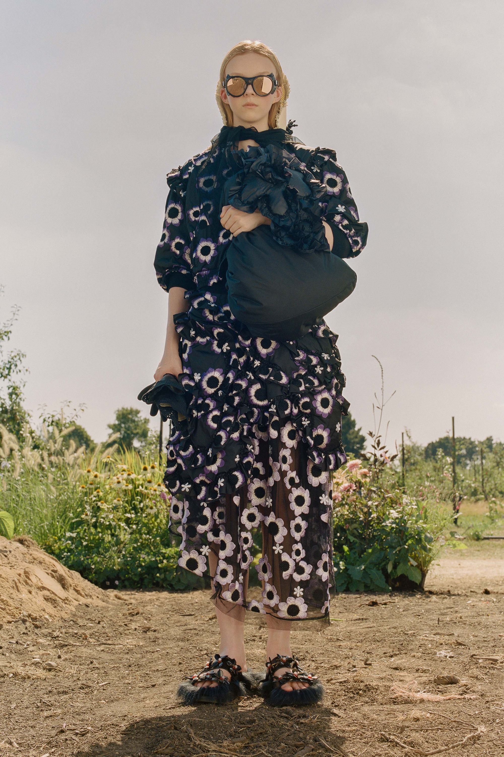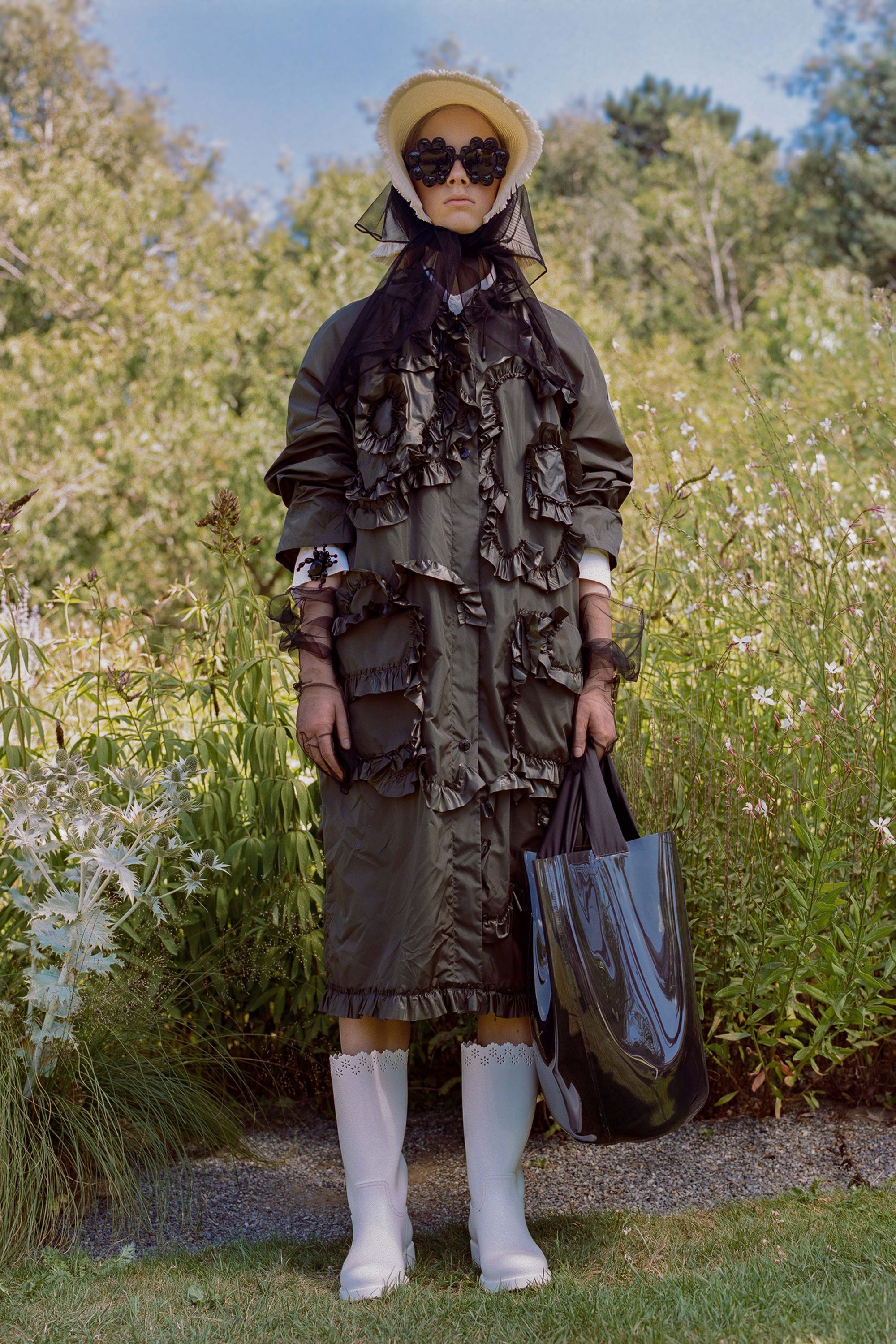 Dropping today we see Simone Rocha’s turn once again to present another unique collection of female silhouettes. The collection 4 MONCLER SIMONE ROCHA is inspired by the world of gardens and gardening and reinterprets the Heritage of Moncler through sophisticated imagery and is decidedly feminine. By working with super lightweight nylon, dolmias and taffetas, but also with PVC and tulle, Rocha creates romantic and ethereal silhouettes embellishing them with buds, flounces and embroidery. Her take on the classic Moncler down jacket is played around with several layers of ruffles, beads, sequins, prints, floral applications, and handmade embroideries, with the trench enriched with voluminous sleeves or made from PVC. The embroidered boots and gardening gloves give the whole range a quirky touch, functionality and femininity mingle and blend like the palette of blacks and neutral tones accented with sudden flashes of red.