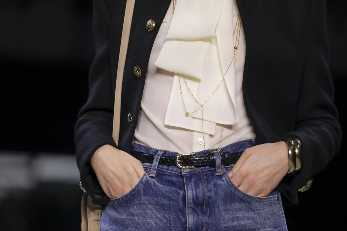 The designer has presented a collection that does not seem to be interested in current trends but, canceling the timelines, wants to talk to its first big love, the Parisian girl with boots, blazers and aviator glasses, that lives the everyday life being herself, going beyond fashion because she is the law. The guests in front-row were waiting for its super-short and cocktail dresses but, here again the breakthrough and a completely new way of being. Autumn nuances in its thousand shades, from light beige to mustard, to rust and leather. Pleated skirts below the knee, supported by thin leather straps and matched with gray sweaters and "good girl" shirts. Flakes, voilants and exposed collars, blazers, long coats, college style bomber jackets and skinny washed denim that we had not seen on the catwalk for several seasons.