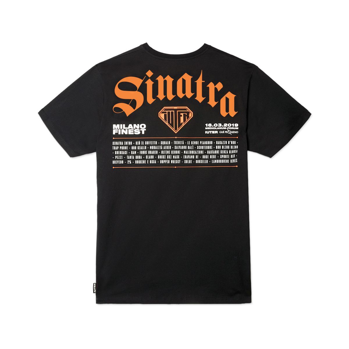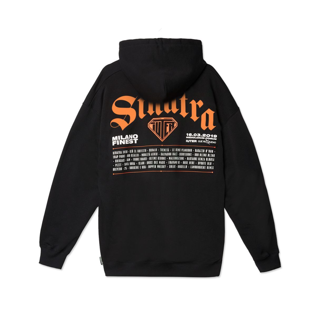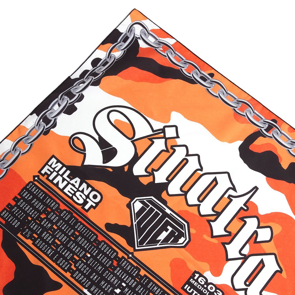 The small Swarovski crystals are applied also on the black hoodie, enriched also by the setlist of the Milanese concert, as well as on the T-shirt. The bandana is characterised by a camo pattern in orange nuances, also decored by the title tracks of the gig. Completing the capsule, sweatpants in different colorways with the Iuter crystal writing with pairing jackets, along with a boxer-style robe with the Sinatra writing on the back.