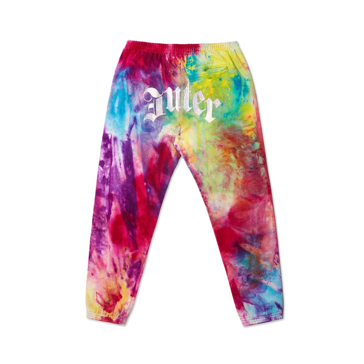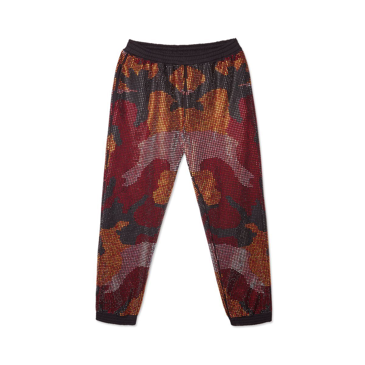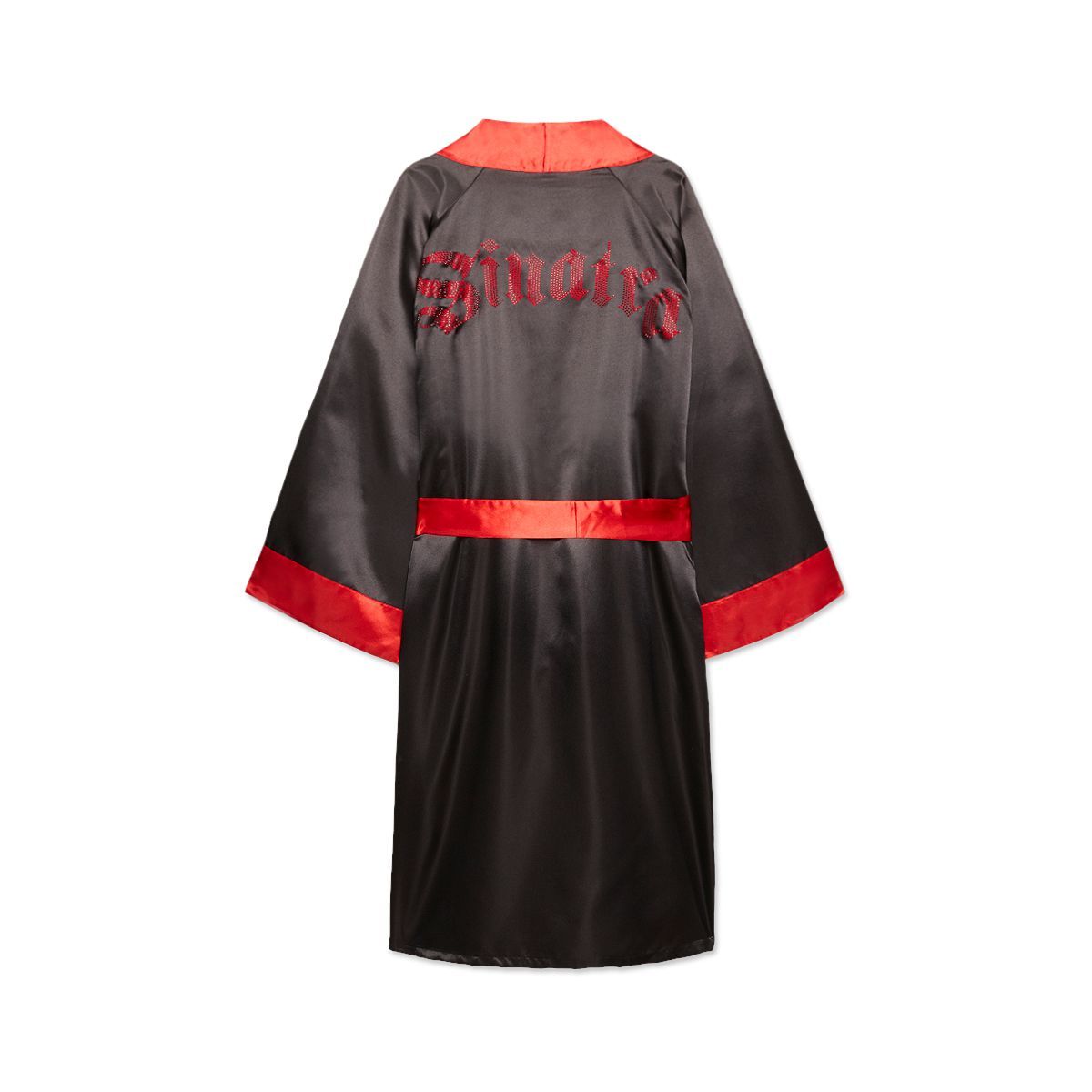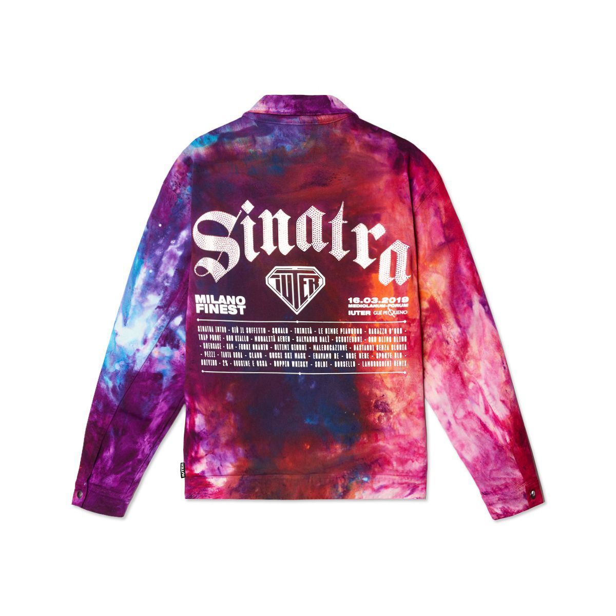 The small Swarovski crystals are applied also on the black hoodie, enriched also by the setlist of the Milanese concert, as well as on the T-shirt. The bandana is characterised by a camo pattern in orange nuances, also decored by the title tracks of the gig. Completing the capsule, sweatpants in different colorways with the Iuter crystal writing with pairing jackets, along with a boxer-style robe with the Sinatra writing on the back.