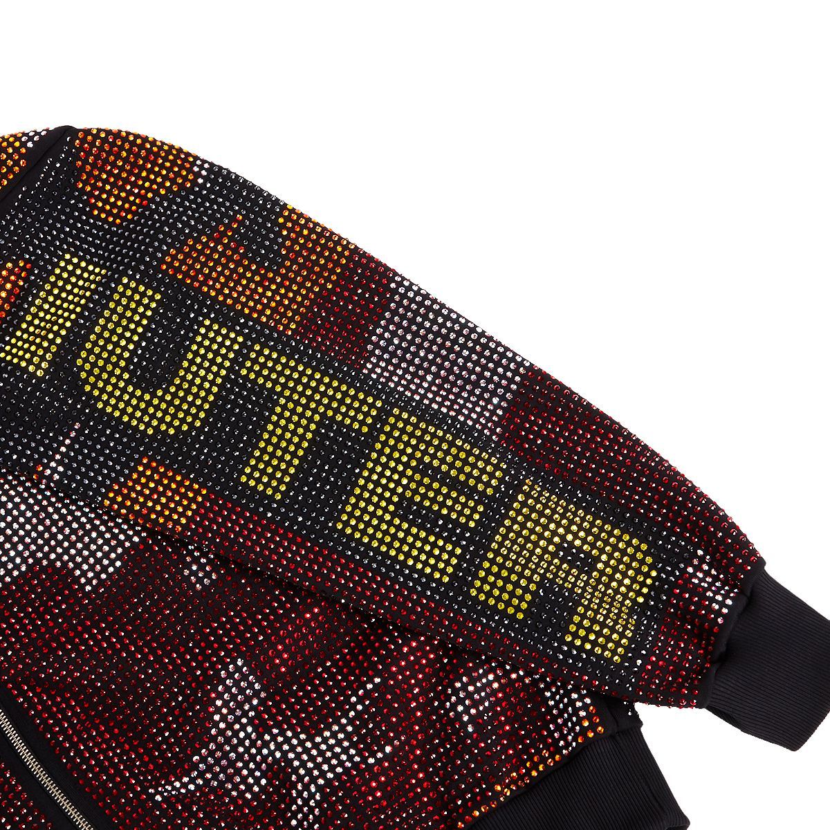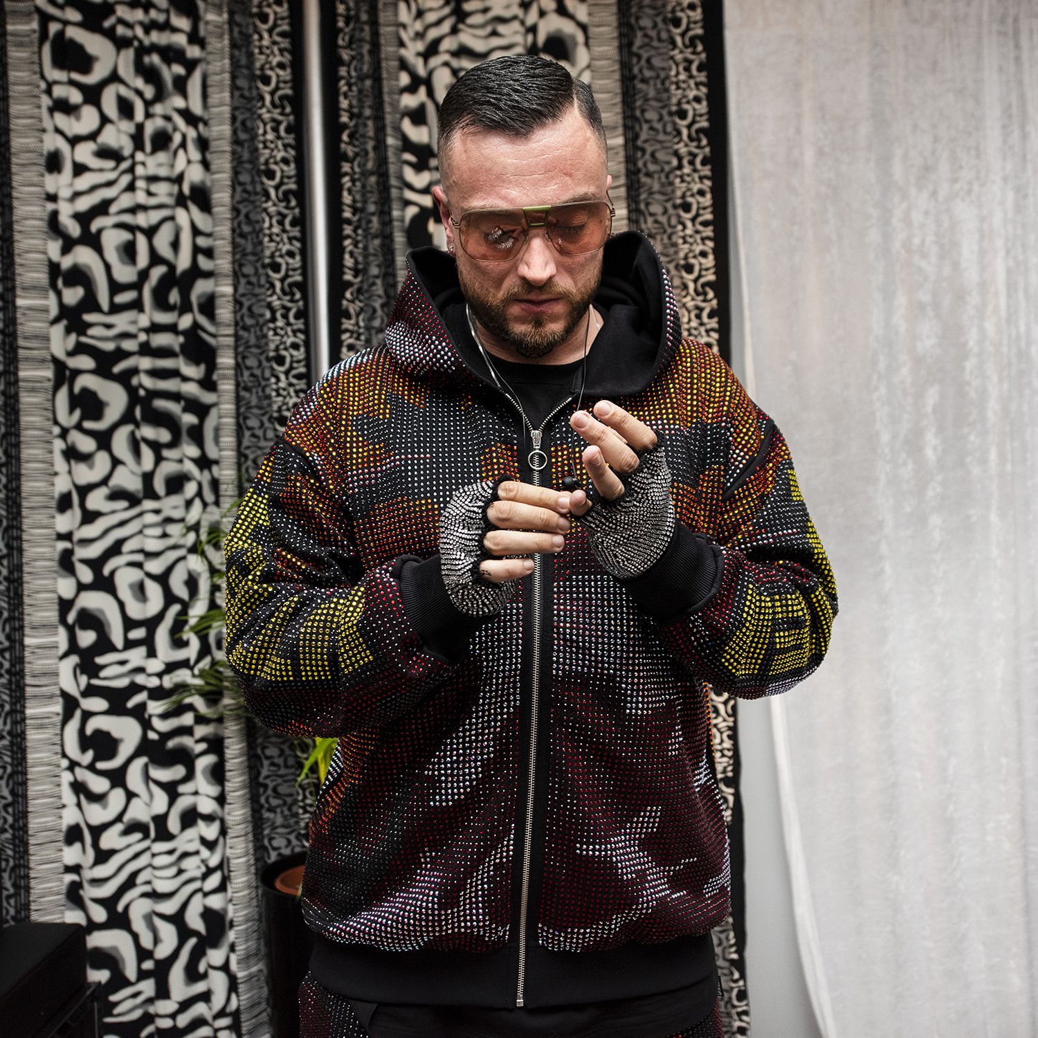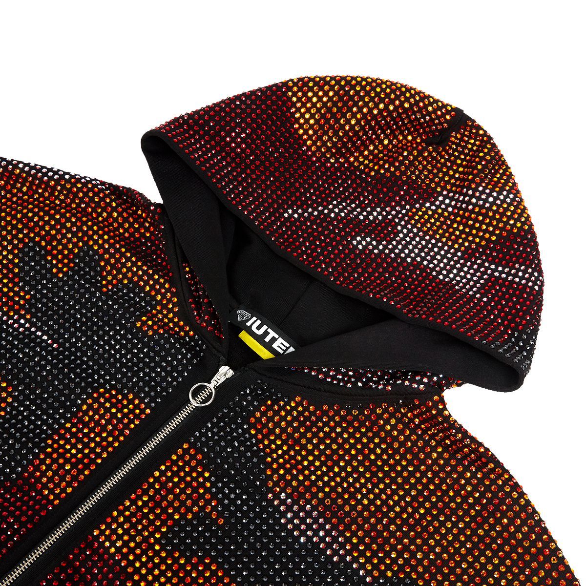 For this special occasion, IUTER has decided to give life to a special capsule collection, consisting of a hoodie, a T-shirt and a bandana. The stand-out item of the capsule is definitely the tracksuit designed in collaboration with Swarovski enriched by more than 75k crystals in different nuances shaping a camo pattern and the Iuter writing. More than 50 hours of work allowed the creation of a dualistic item, almost contradictory: the pattern that par excellence is designed to hide and blend in is now at the centre of the attention thanks to the shiny rhinestones.