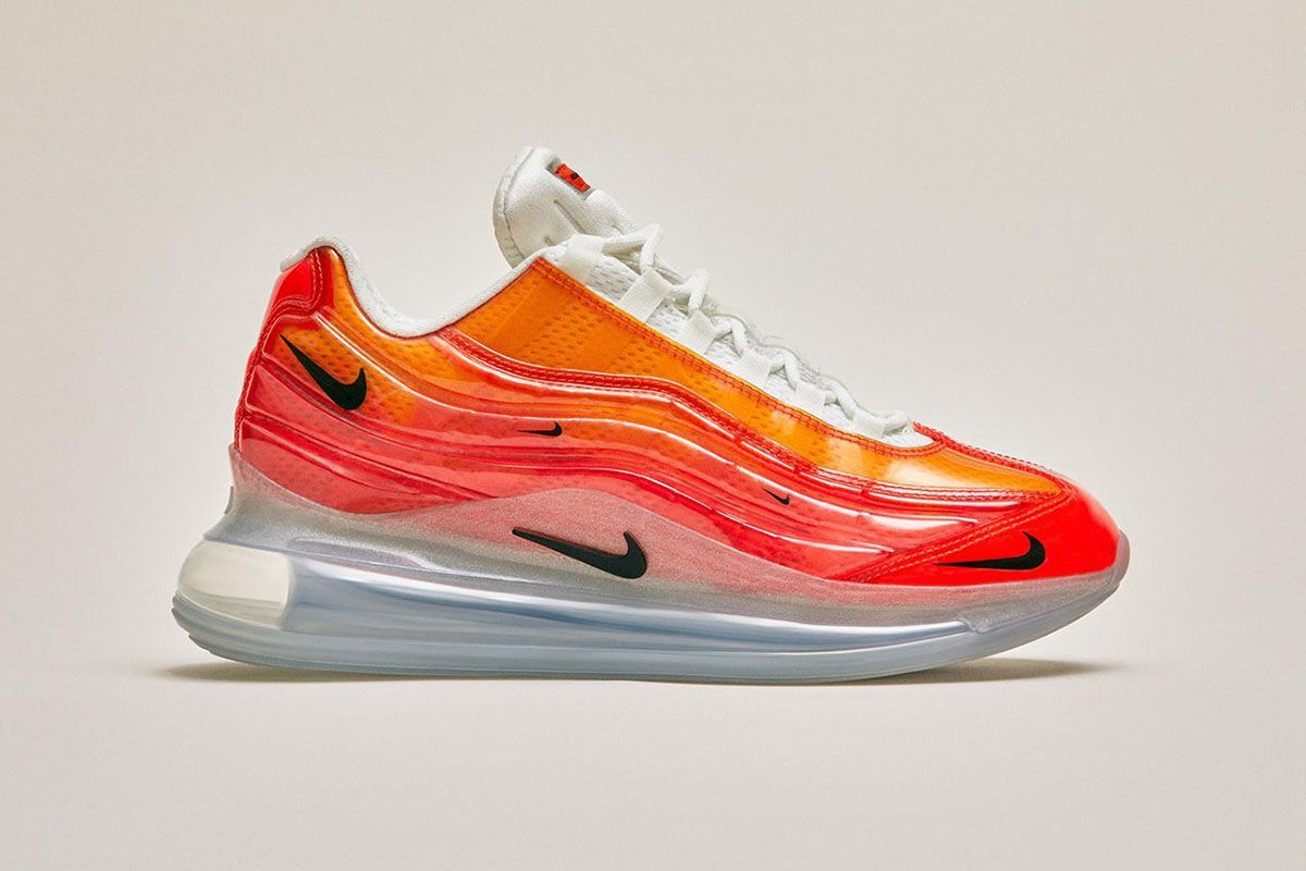 The first is a sneaker that combines the characteristics of the latest Nike-born, the Air Max 720, with the highest Air unit ever with the silhouette of another iconic Nike sneaker, the Air Max 95. Orange upper, white tongue and laces and several mini Swoosh are the hallmarks of this Air Max 720/95 born from the American artist, designer and DJ Heron Preston. The shoe will be released on April 15th and can be customized thanks to Nike by you.