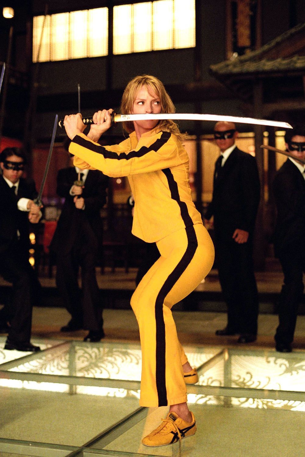 The Bride's total yellow suit was produced by Mooto, a Korean sporting goods brand and is inspired by the one worn by Bruce Lee in Game of Death, a film left unfinished due to the actor's death on July 20, 1973. Black Mamba shoes are the Onitsuka Tiger Tai Chi model with interesting detail on the sole: the word "Fuck U".