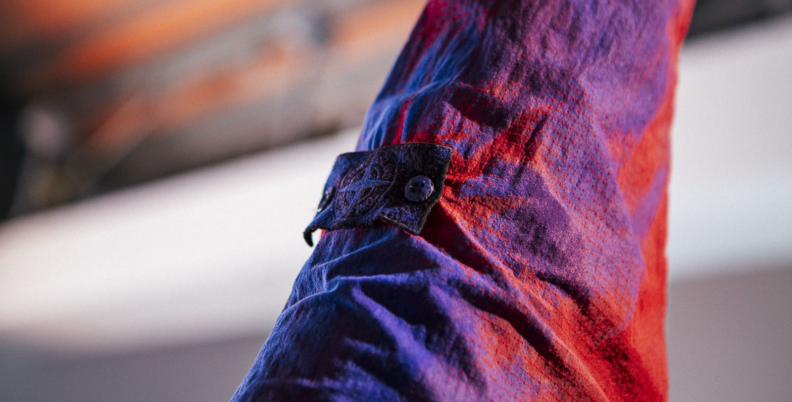 The nylon fabric has a grid inside is (the ripstop) so it's not a flat Nylon metal textile, consisting of three strands of yarn, one black, one grey, and one white. After the glue is applied, inside the machine a magnetic field is created, which attracts the flock fibres to then stick onto the garment. We then double dye, and for this occasion we chose Red and Blue, but what I find interesting is if you only do it in single color, then the result is a much a more subtle shading, meaning that within the post dyeing process such vast amounts of different things can be achieved.