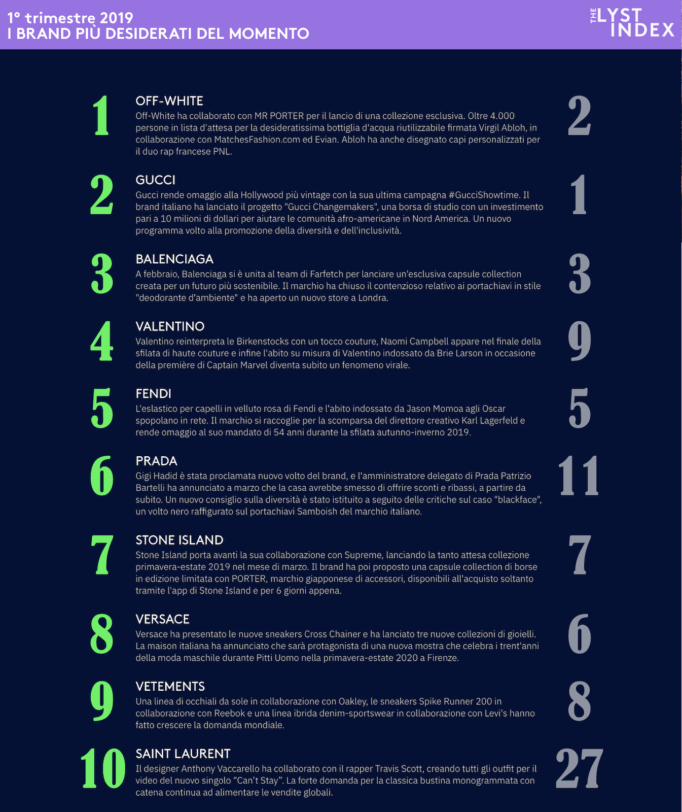 The top ten on the list opens with Saint Laurent, growing after its collaboration with Travis Scott, followed surprisingly by Vetements, who despite a clear crisis of identity still manages to meet the taste of many customers. Versace and Stone Island occupy the following positions in a Made in Italy trio composed of Prada, Fendi and Valentino, respectively in sixth, fifth and fourth position.
