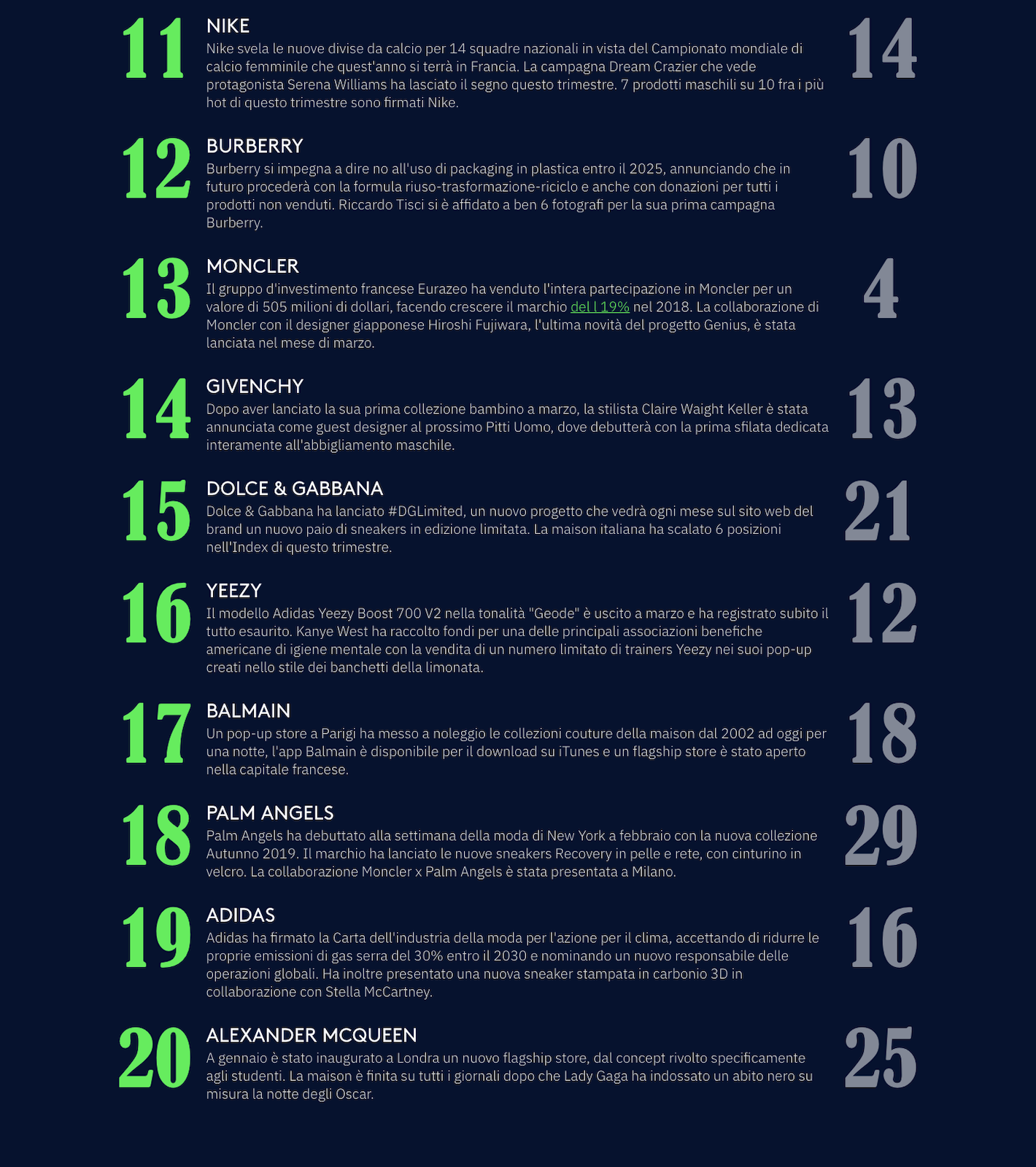 The last place in the ranking is occupied by Alexander McQueen, also thanks to the dress worn by Lady Gaga at the night of the Oscars, surprisingly preceded by adidas, surprisingly distant from the top positions. As you move up the ranks, streetwear is alternate and other high fashion brands, such as Balmain, Givenchy, and Burberry, are just below the eleventh place occupied by Nike. The activities of the swoosh in this quarter were not particularly significant, with the exception of the launch of all the kits for the Women's World Cup. Another surprise in the standings is the incredible growth (19%) of the brand Moncler , relaunched by the Genius project, previewed during the last Milan Design Week.