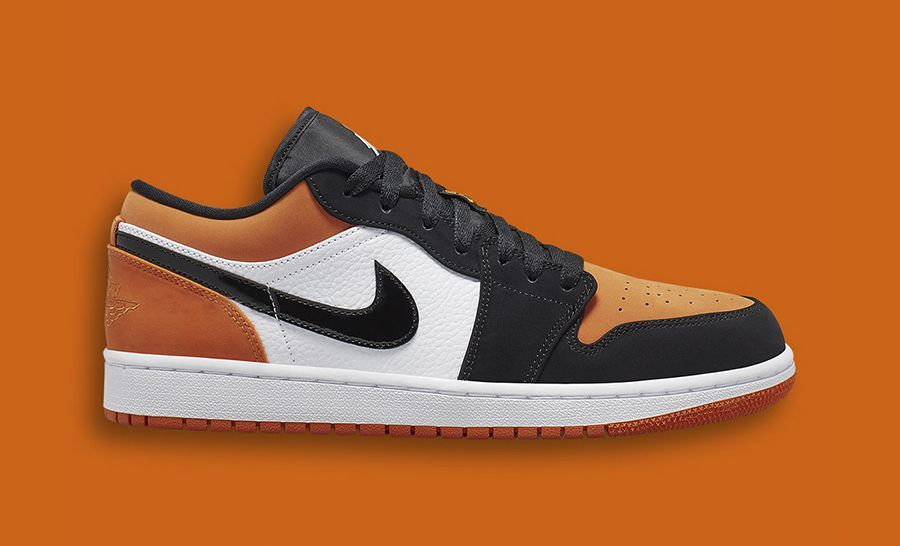 "Shattered Backboard" colorway, instead, it's another tribute to the Shattered saga. For this low-cut version, the Jordan 1 will be tinged with orange for the sole, the toe and the panels, while details in black nubuck, white textured leather and patent Swoosh will complete the design.