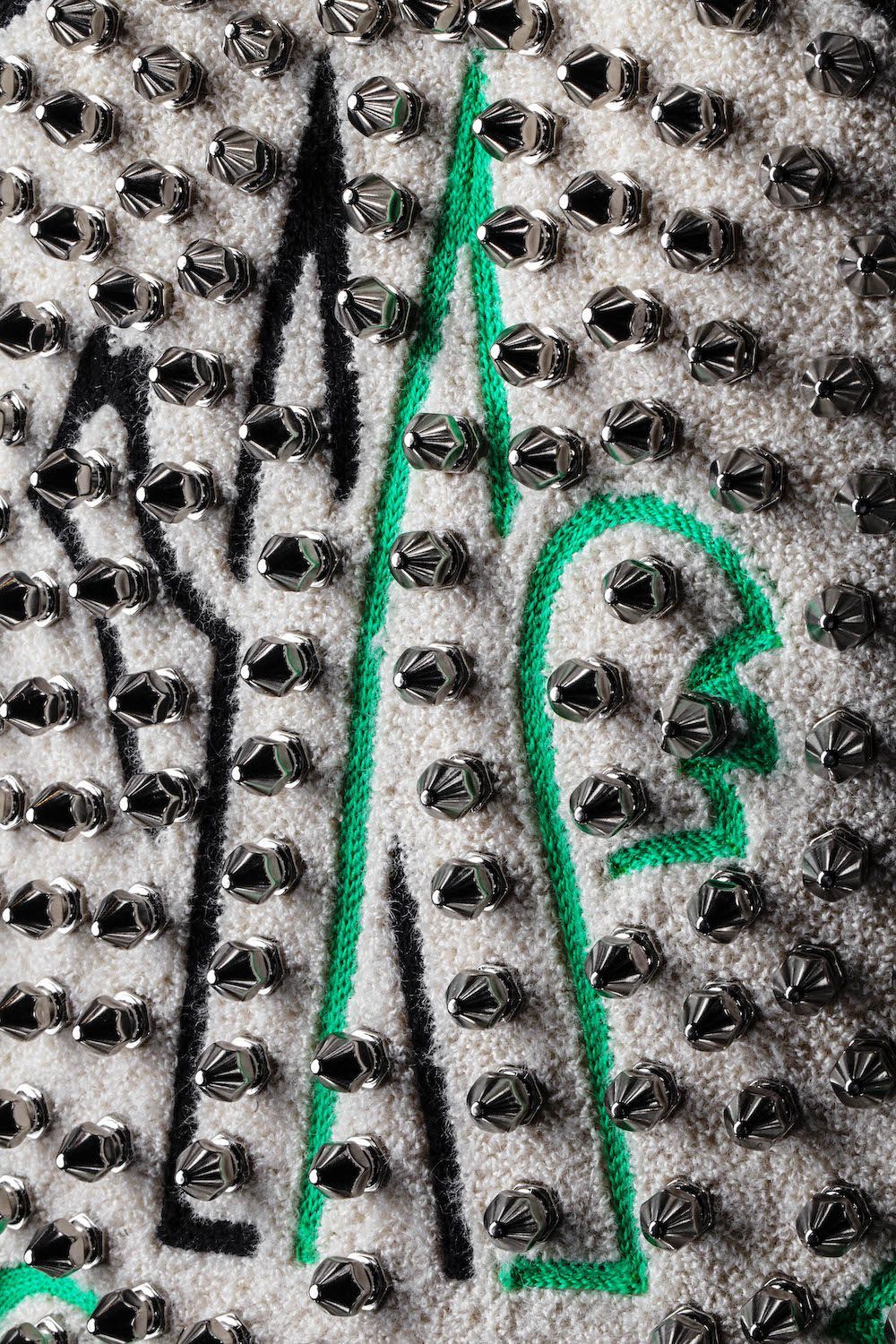 Ragazzi took inspiration from the metallic look of metalized paper, which he later turned into something completely new. The designer has used laminated nylon with a mirrored effect to revisit the timeless Moncler duvet jacket, playing with its proportions, as well as on the pants, which recall the rave style. Ragazzi has used the collage technique to create all over prints and graphics , which he later sprayed, as graffiti, the brand's name Palm Angels on T-shirts and vests that play with the idea of vandalizing the purity of art. The claim of the season is Mind Control, while studs are applied on many items of the collection, in perfect punk style. Zippers are applied both on the front and on the back of the outerwear so that they can be used in many different ways. Varsity jackets, striped sweaters, hoodies and long scarves are apart of this collection as well. The Moncler logo, in a colourful version, stands out among the accessories.