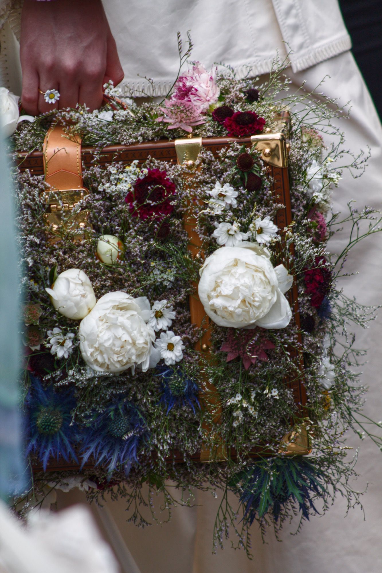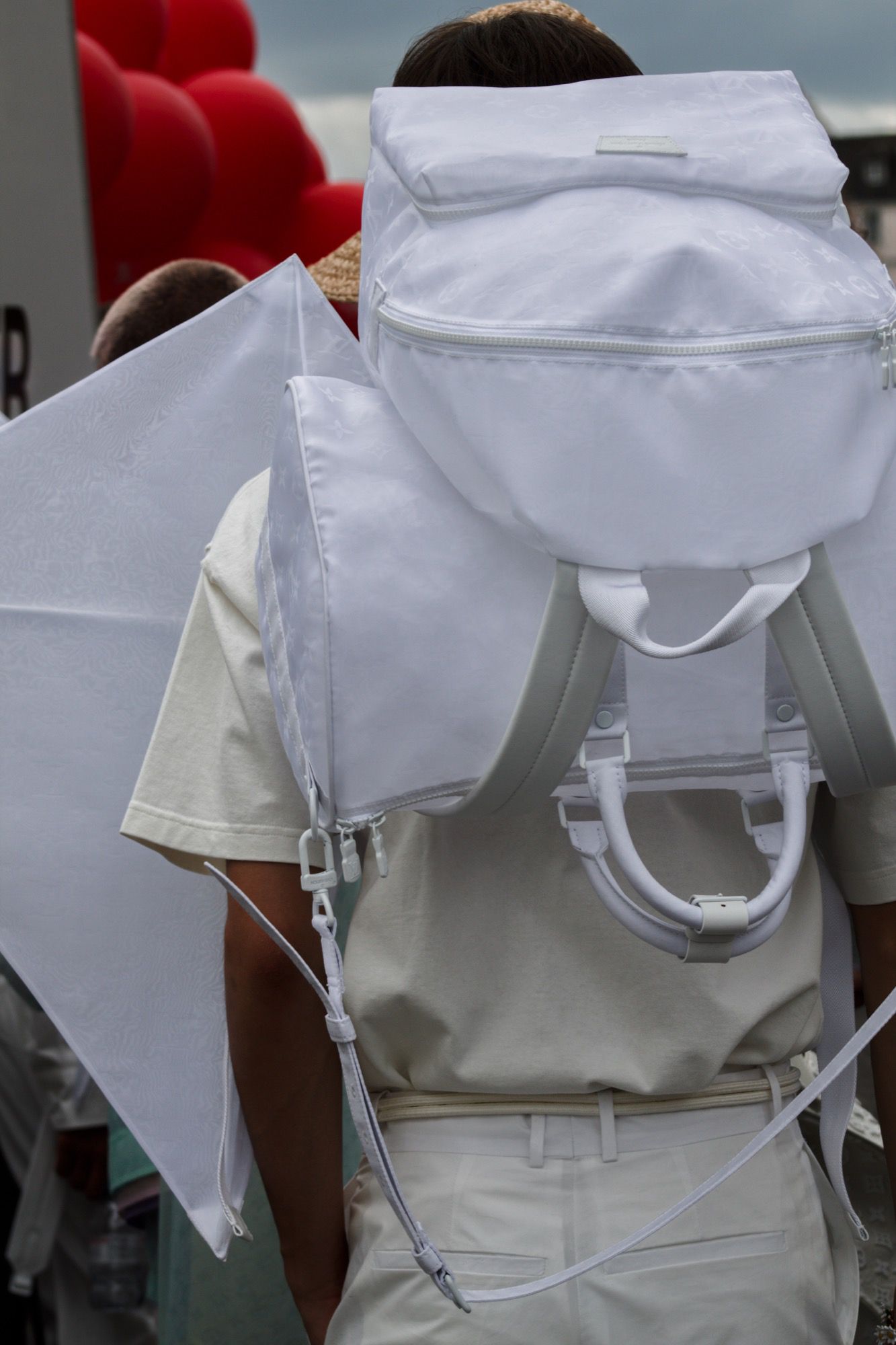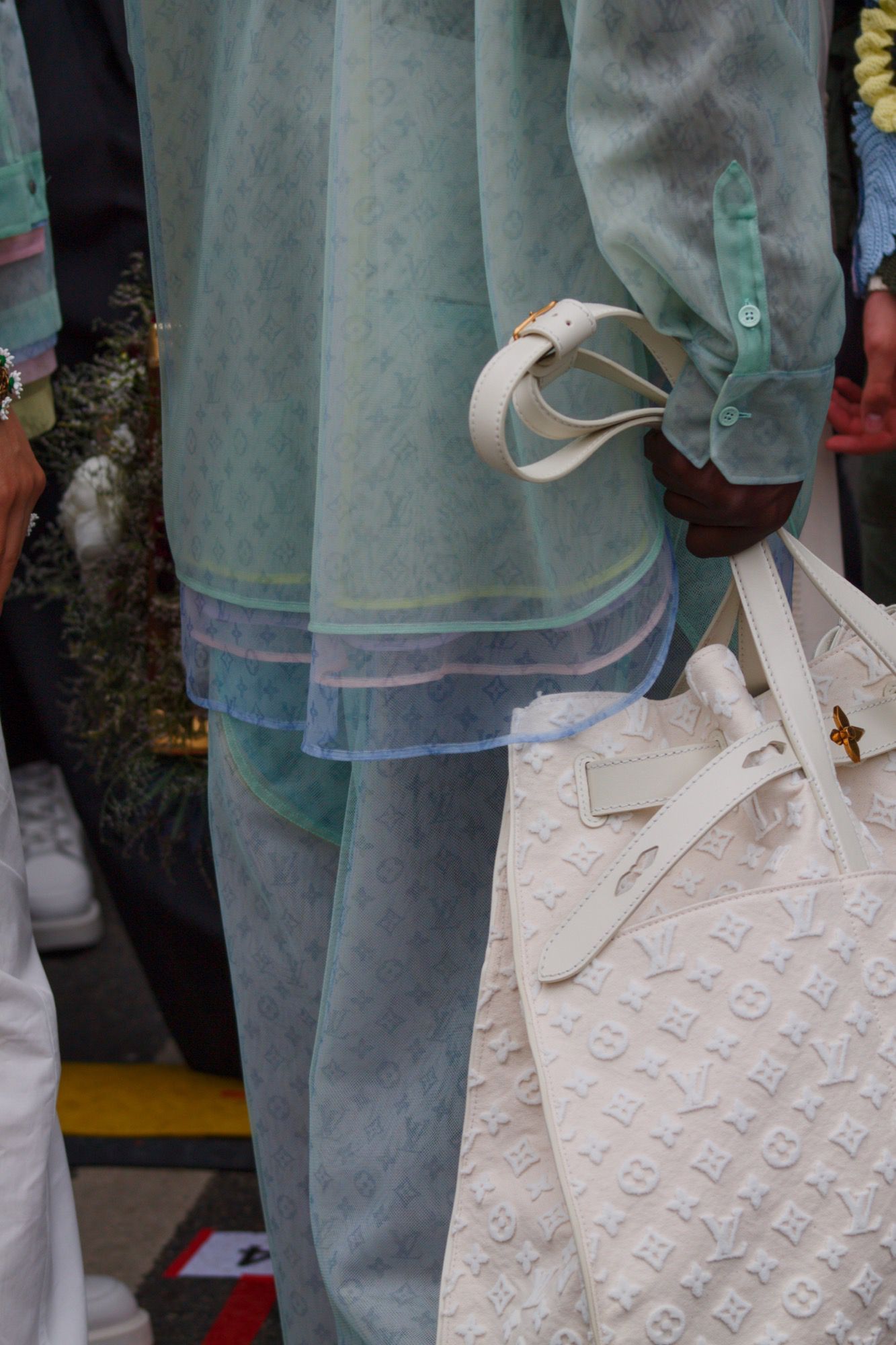 Flowers are the real protagonists of Louis Vuitton's SS20 collection. They bloom on clothes and accessories, creating pieces destined to become cult like the harness made famous by Timothée Chalamet that now looks like a beautiful flowery branch that embraces the body. Completing the bucolic-street look are straw hats, Cuban-inspired jewellery and bags that look like gardening baskets filled with wildflowers. Future top sellers will be, in addition to fanny packs and backpacks, the new monogram bags, characterized by rigid geometric shapes and pleated constructions; while the series of ultra-thin nylon bags, inflated before appearing on the catwalk, and the sets of bags and kites that seem to be a fashion homage to Craig Green, remain imprinted in the mind. Concerning shoes, colour-blocked sneakers alternate with cool and colourful LV versions of patent leather rain boots.