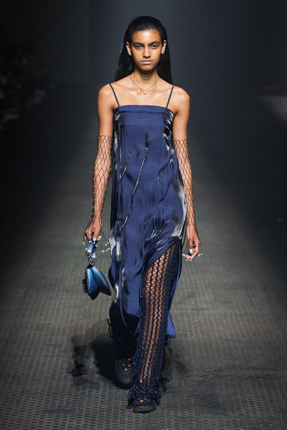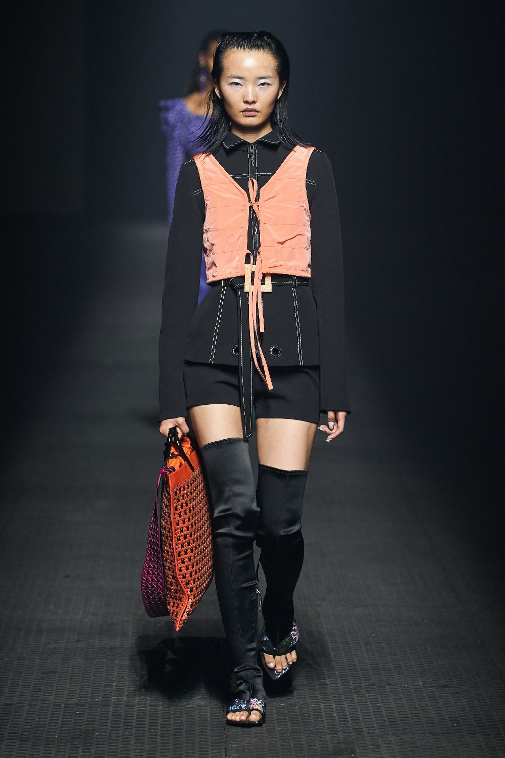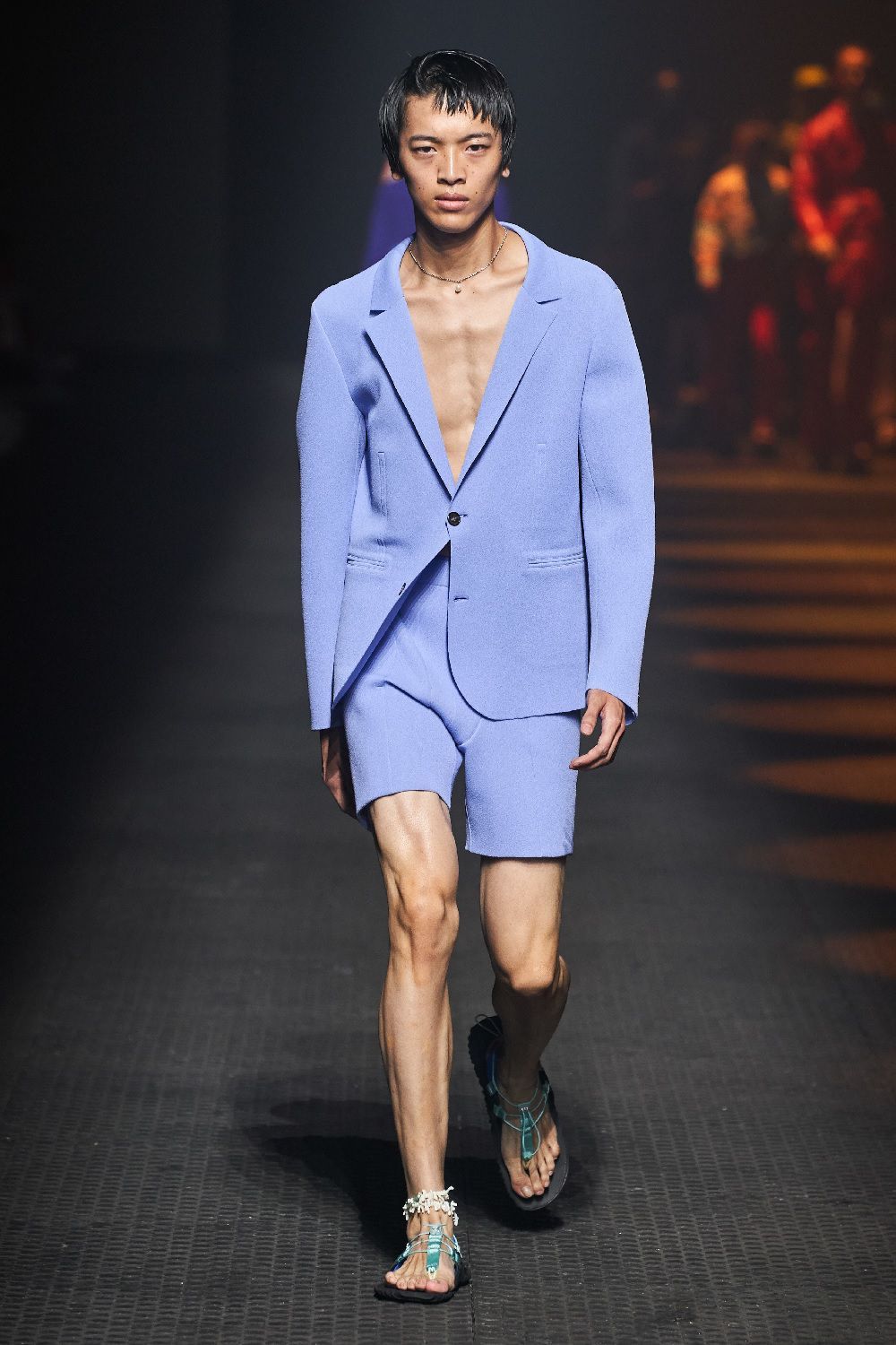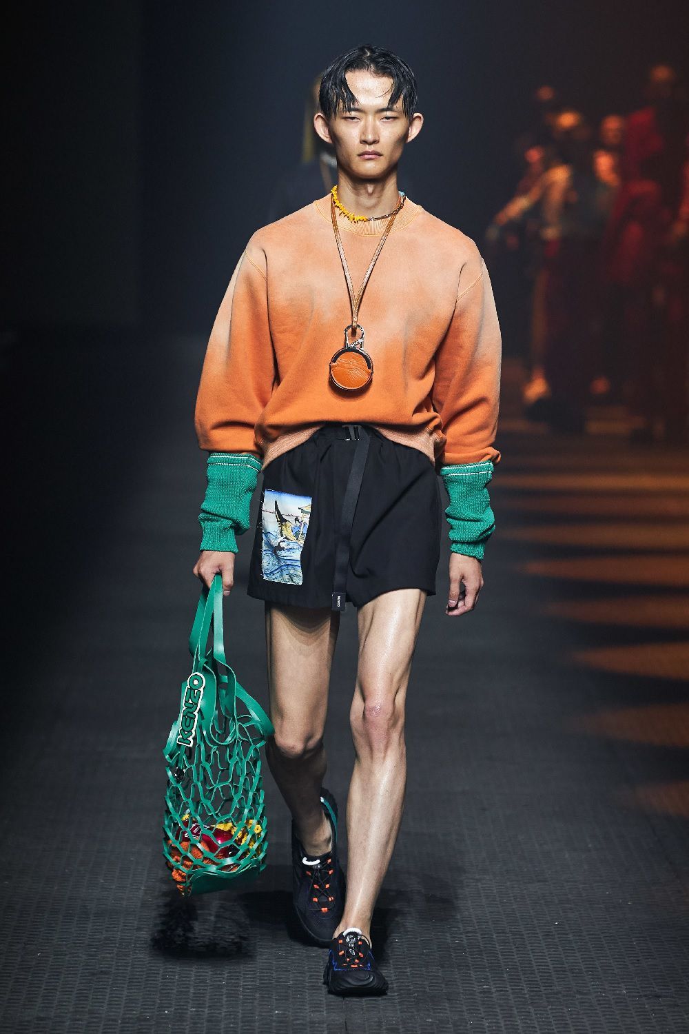 Sports Palace of Bercy. Last day of Paris Fashion Week. On the catwalk the farewell of Humberto Leon and Carol Lim to Kenzo. In a half-lighted room the garments of the final collection inspired by the Ama, the Japanese divers portrayed also by Hokusai, who explore the ocean floor in search of submerged molluscs and treasures, alternate. The models wear wet looks completed with crumpled jersey tops and dresses; neoprene suits in orange, purple or black; athletic pieces reinterpreted in lurex; transparent crepe dresses with prints of shrimps, sirens and lilies; blouses that look like irregularly pleated dresses; long dresses embellished with sequins and pearls; rubberized outerwear made special by nautical motifs and sea urchins; cotton sweatshirts combined with tailored jackets.