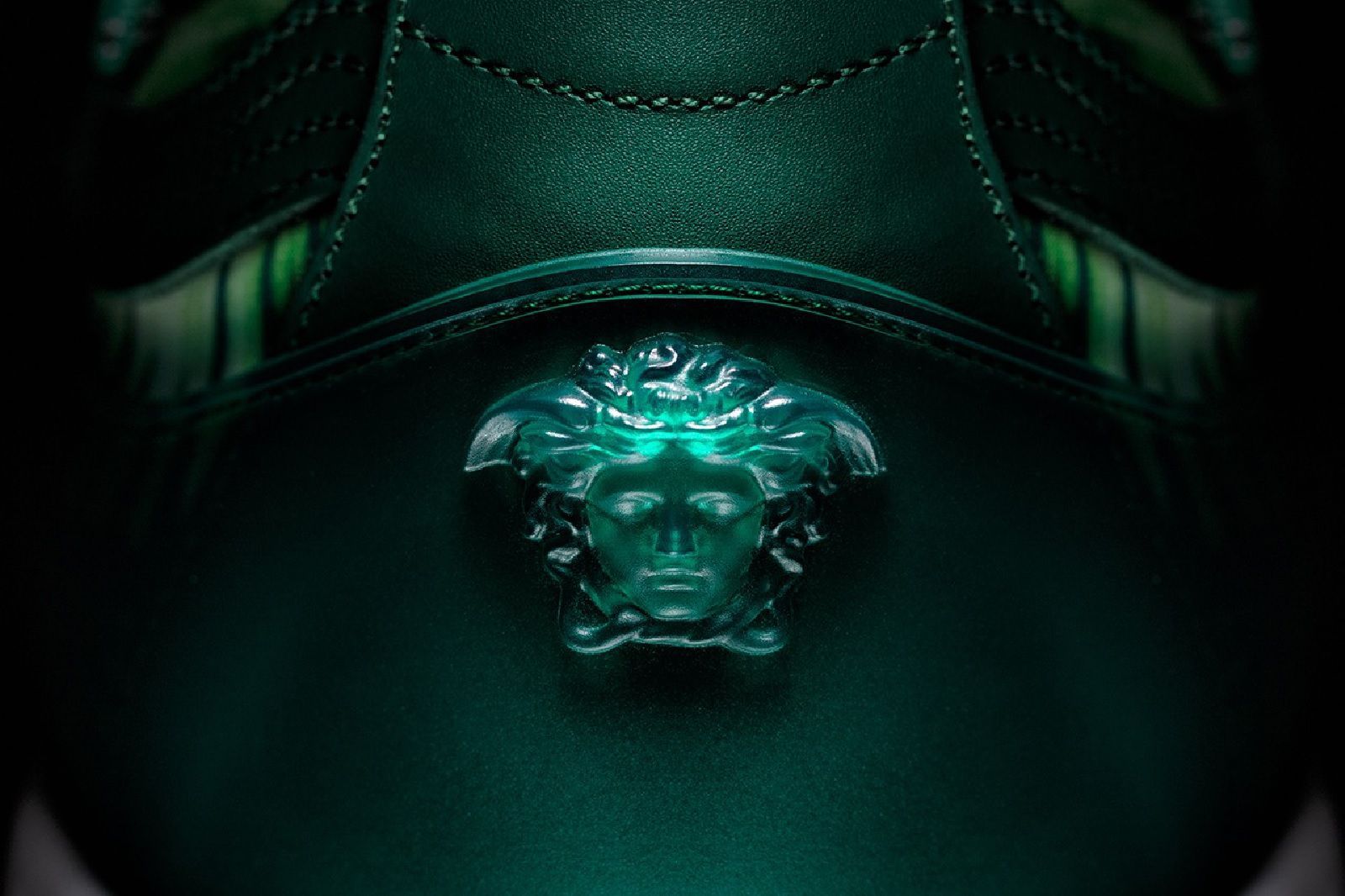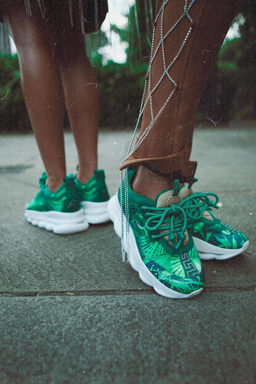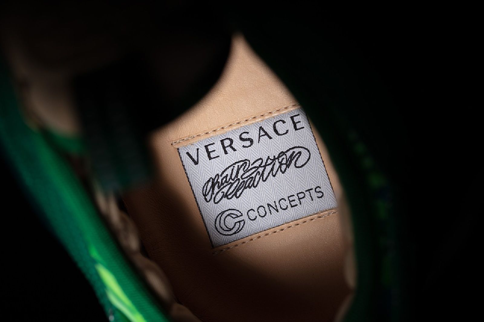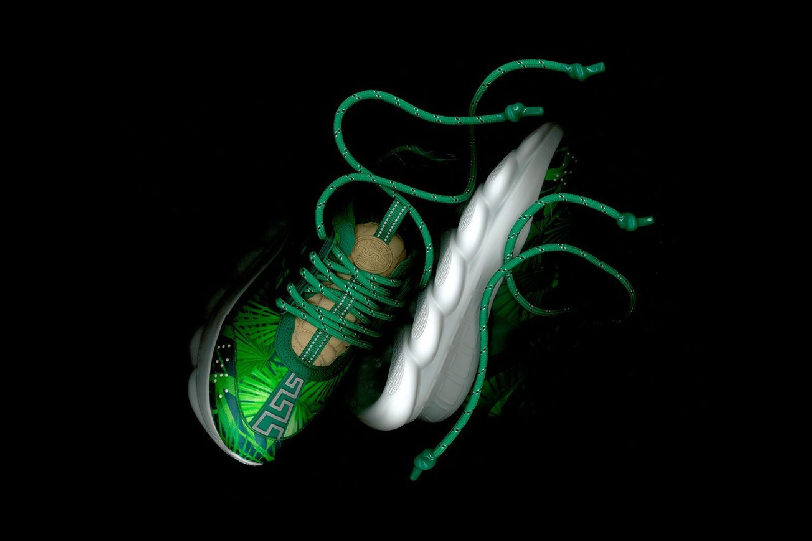 Concepts joins forces with Versace to create a new version of the sneaker Chain Reaction. The streetwear retailer looks back on Maison's history and finds inspiration in of its most iconic dress: the emerald green Jungle-dress in silk chiffon worn by Jennifer Lopez at the 2000 Grammy Awards.