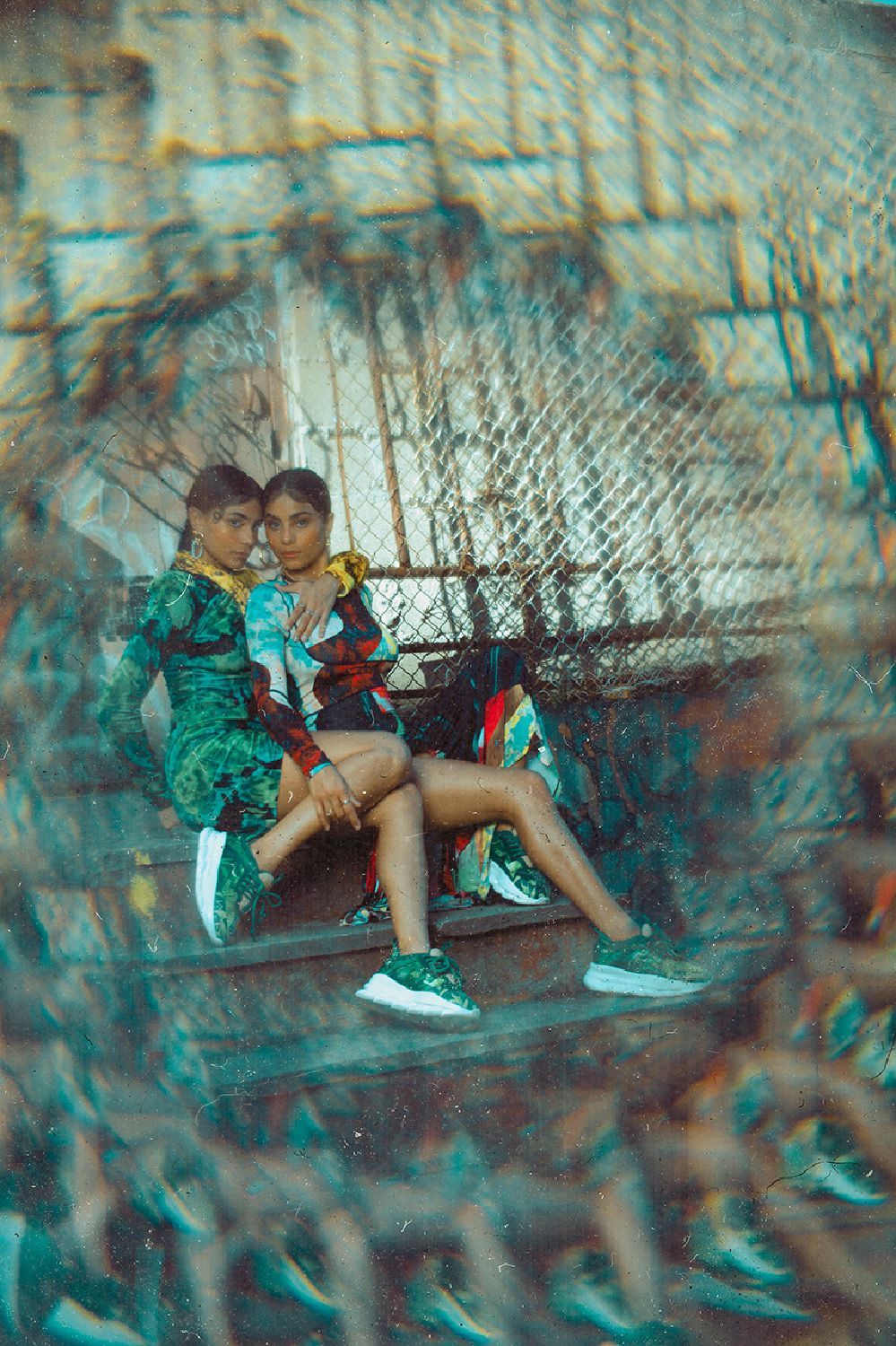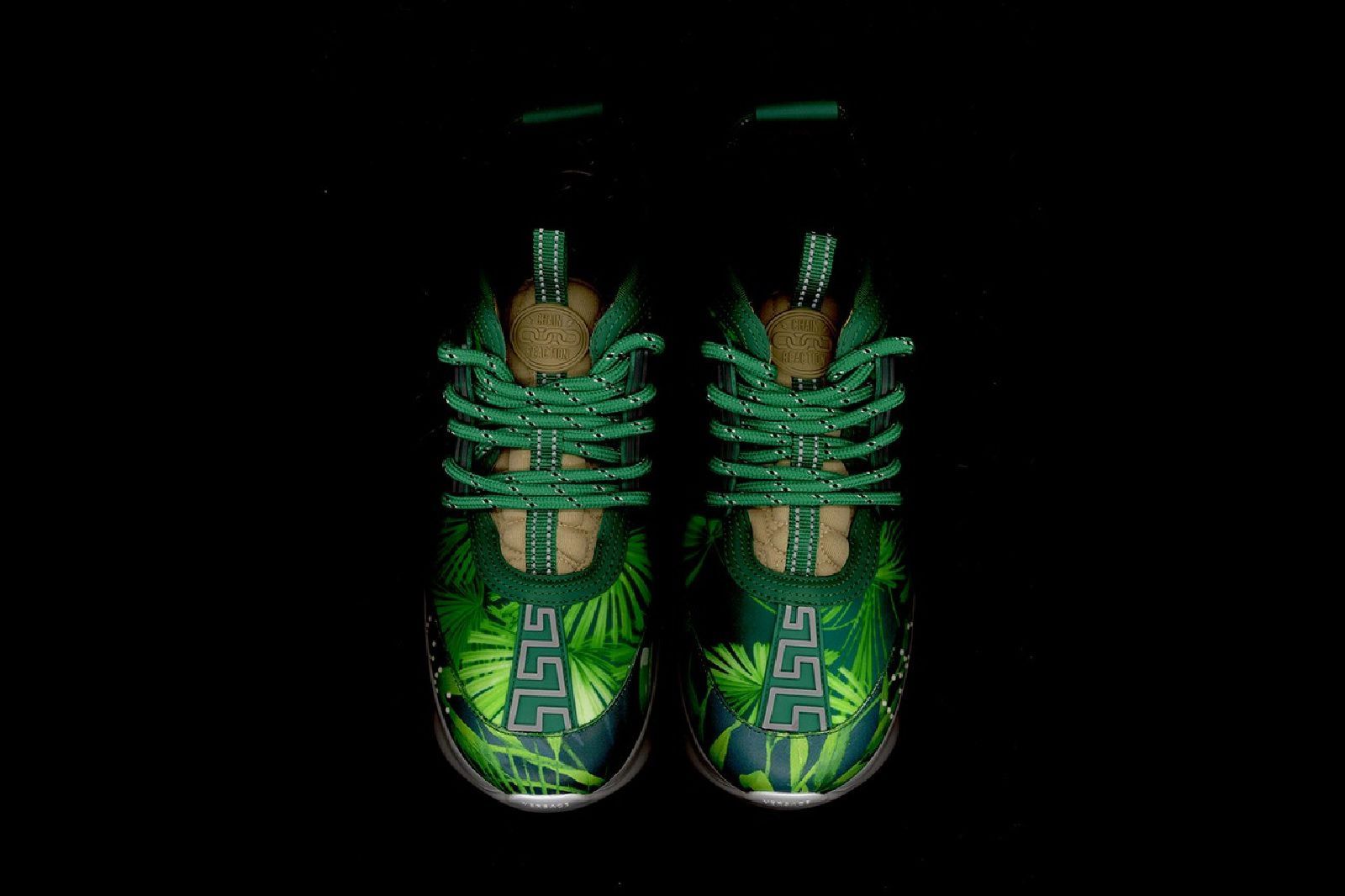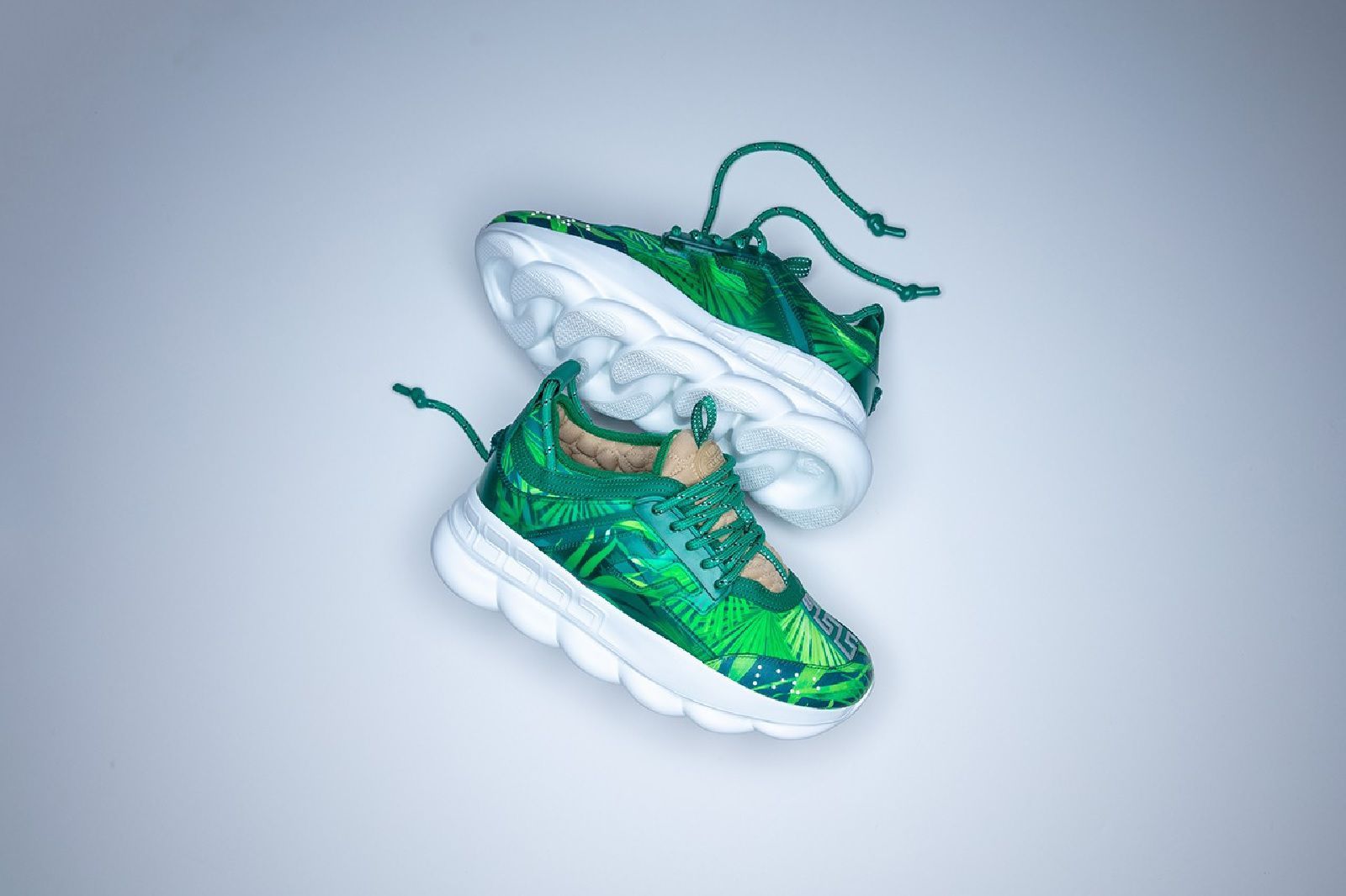 The print of that garment now becomes the protagonist of the shoe's nylon upper. The characteristic chain link on the white sole completes the look of the sneaker along with calfskin trim, mesh inserts, Chain Reaction logo on the rubber tongue, green rope laces and a green Medusa head on the rear.