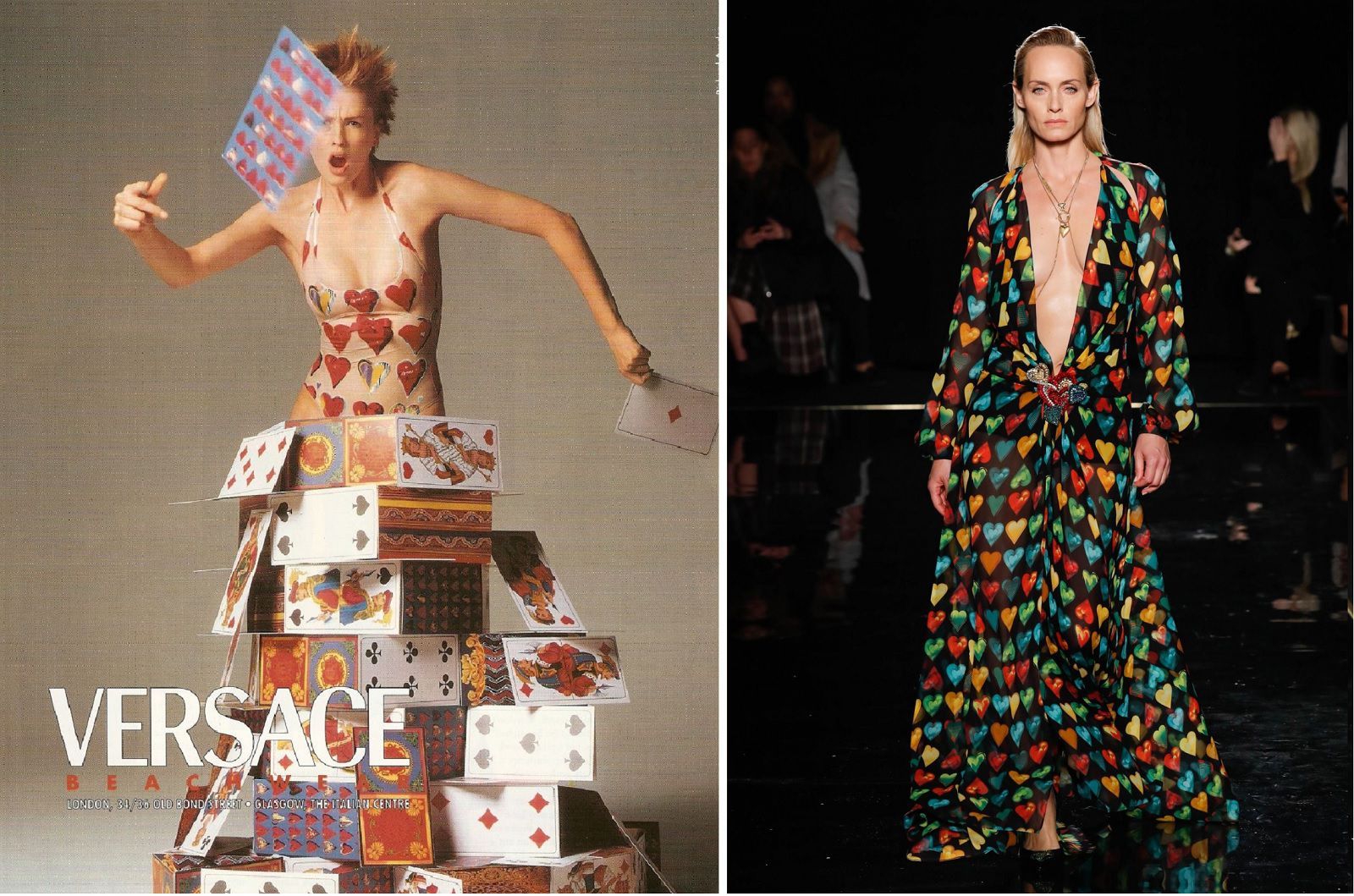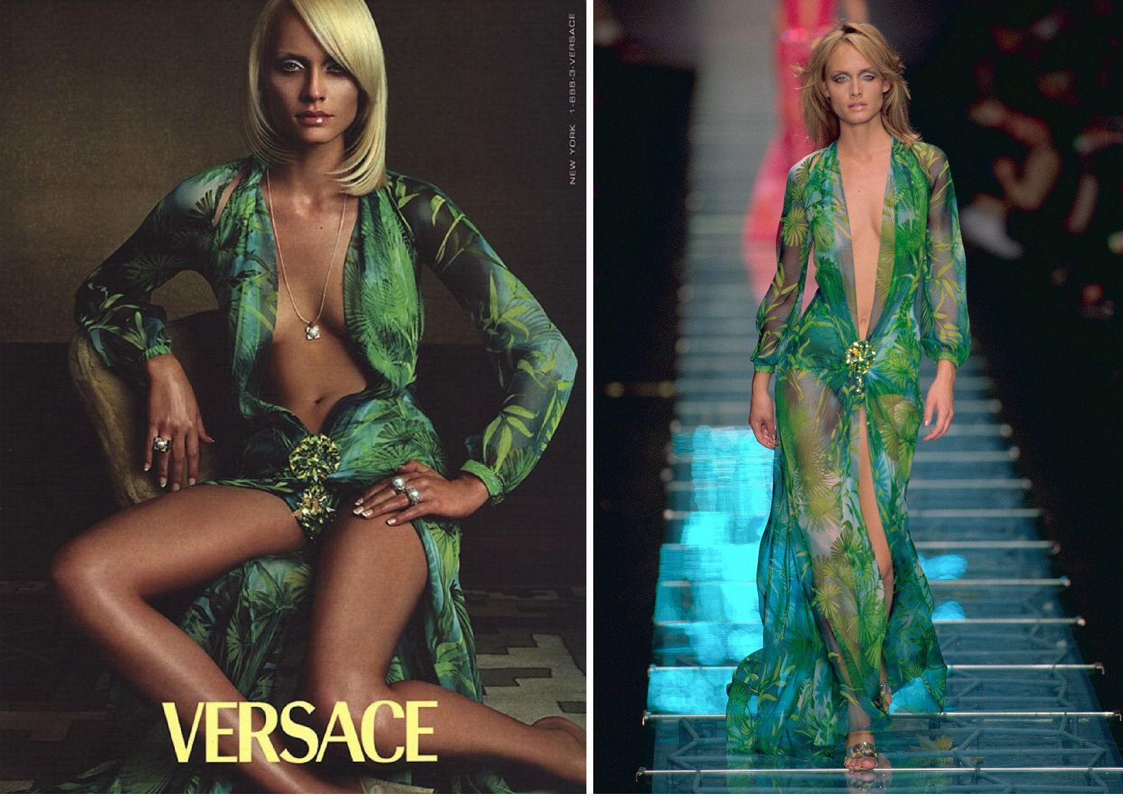 - On the occasion of the Versace Pre-Fall 2019 fashion show, Donatella decided to bring back the iconic model and brought back on the catwalk Amber Valletta who wore the same dress in 1999. The new version ditched the jungle print and opted for a rain of red, orange, blue and green hearts inspired by pop artist Jim Dine who created the motif for Gianni Versace in 1997.