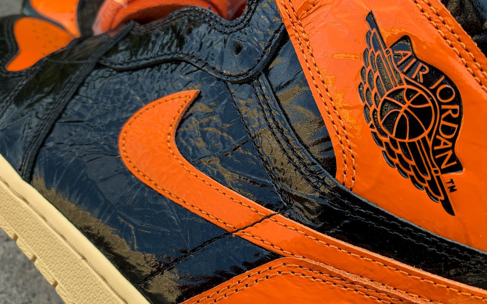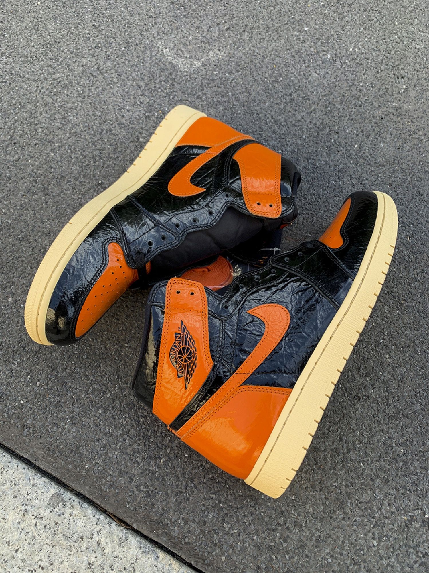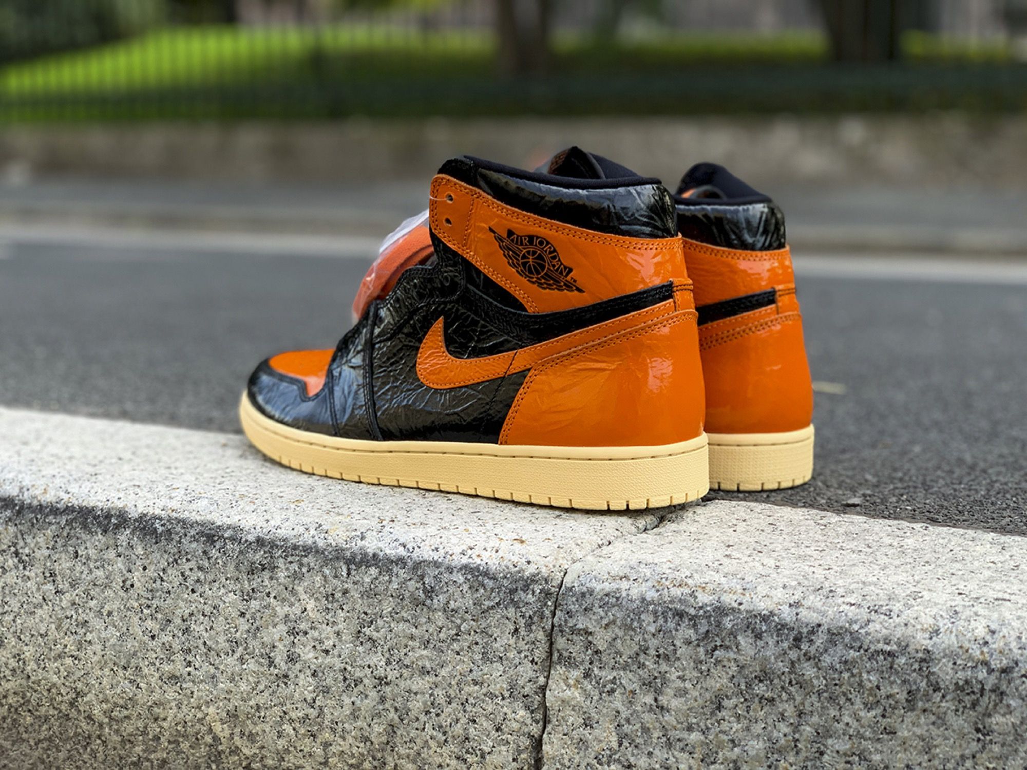 The new Nike Air Jordan 1 High OG "Shattered Backboard 3.0" has some new features compared to the original design, on all the surface of the ruffled and shiny upper better known as Patent Leather, probably inspired by the glass of the board. The first images of the AJ1 made the purists of Jordan brand turn up their noses, expecting a silhouette more faithful to the OG. The orange "Starfish" panels of the sole and heel, as well as the Swoosh, stand out against the black base. Another new feature compared to the previous two versions is the vanilla sole.