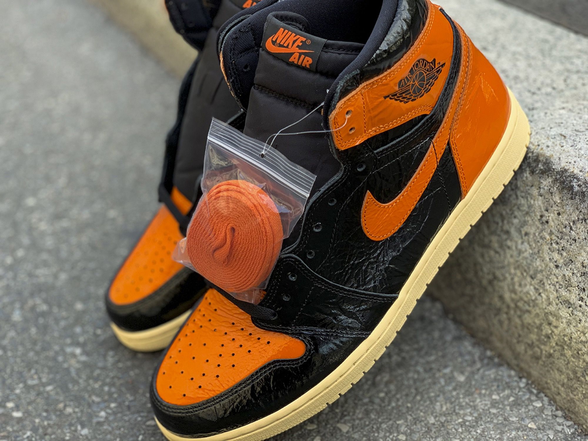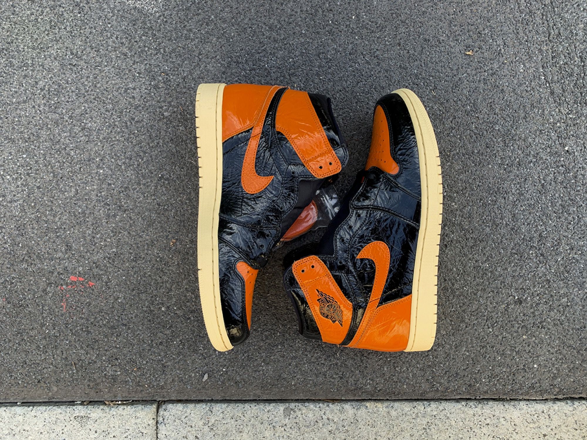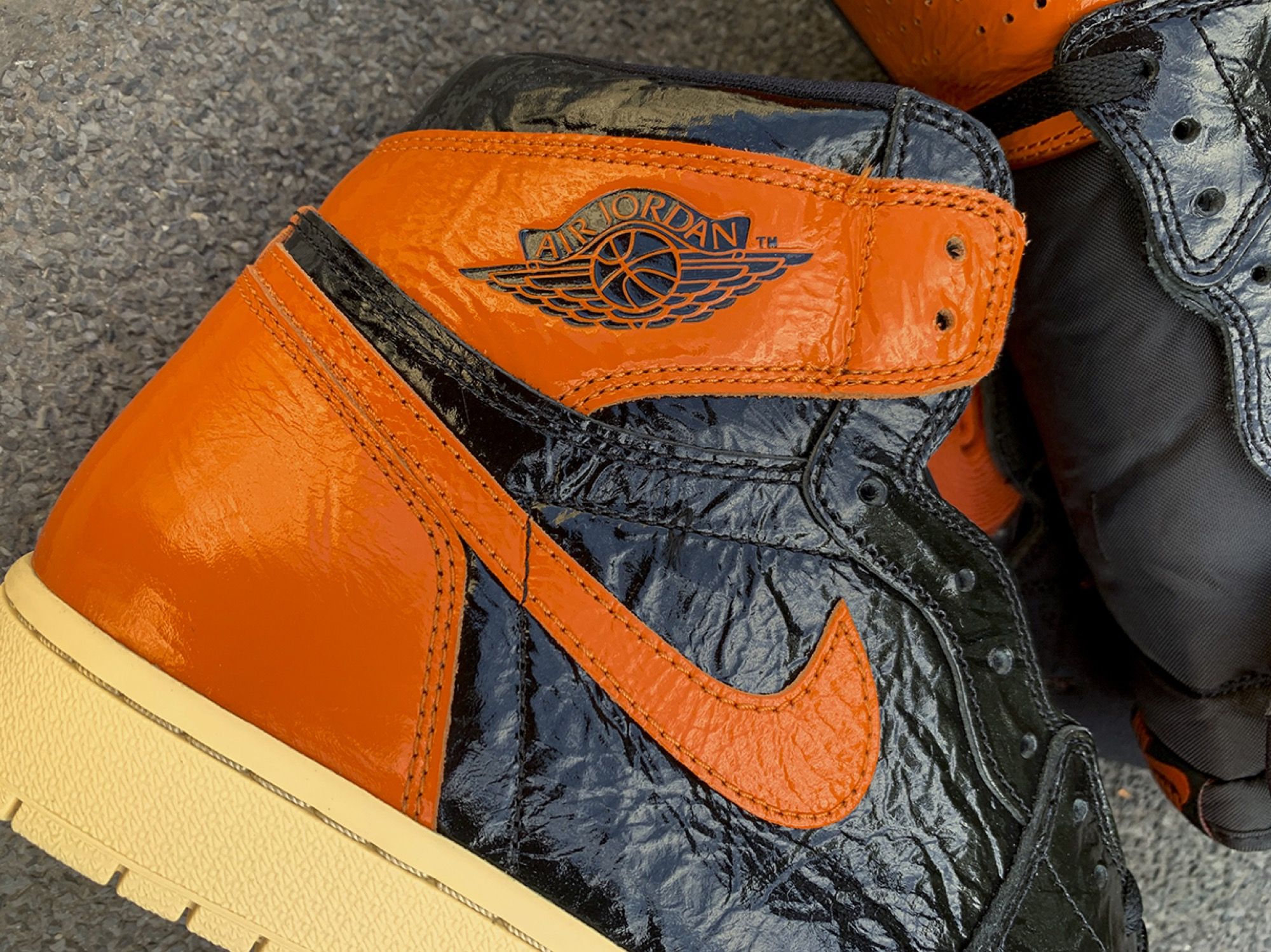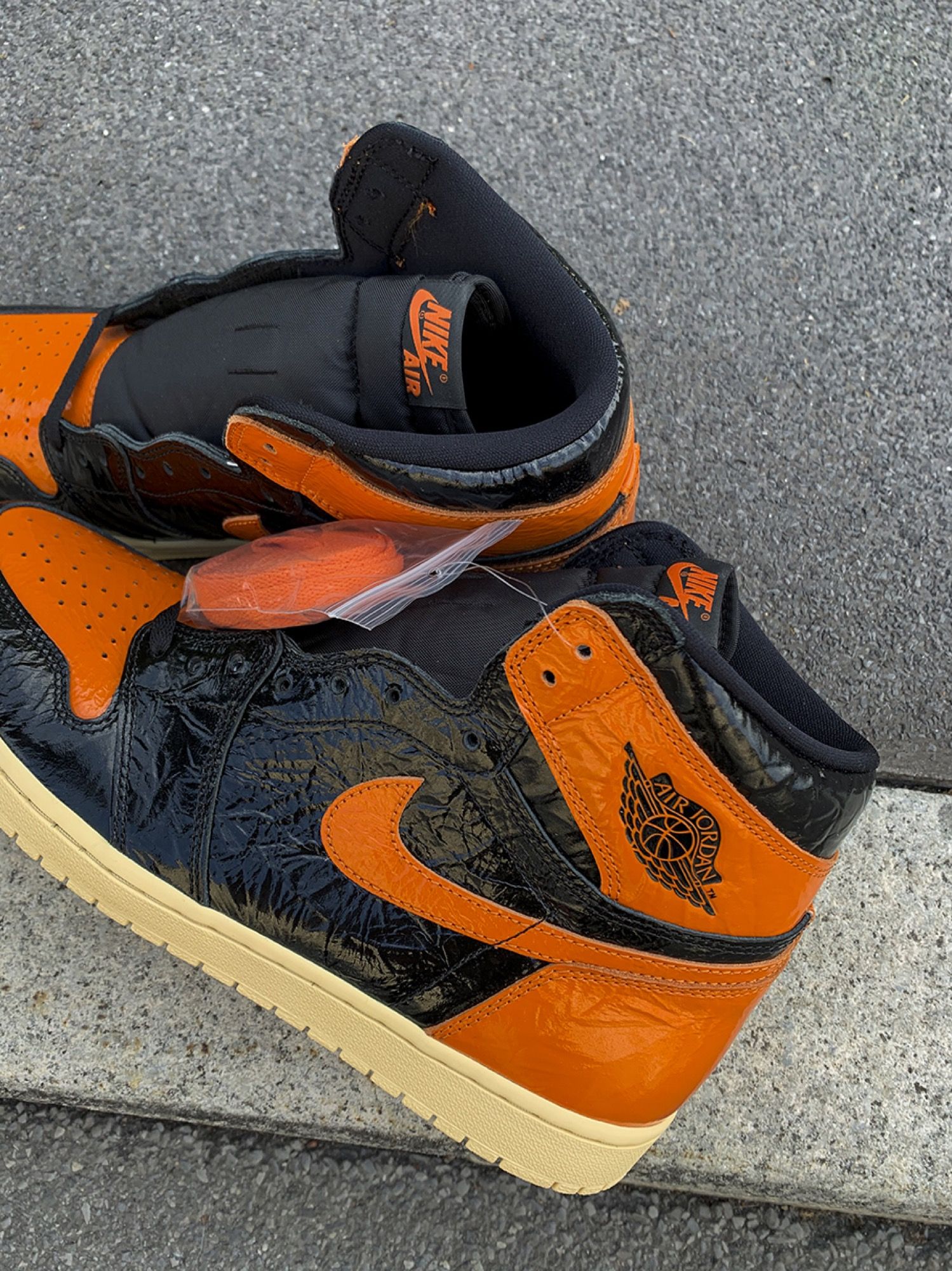 The new Nike Air Jordan 1 High OG "Shattered Backboard 3.0" has some new features compared to the original design, on all the surface of the ruffled and shiny upper better known as Patent Leather, probably inspired by the glass of the board. The first images of the AJ1 made the purists of Jordan brand turn up their noses, expecting a silhouette more faithful to the OG. The orange "Starfish" panels of the sole and heel, as well as the Swoosh, stand out against the black base. Another new feature compared to the previous two versions is the vanilla sole.
