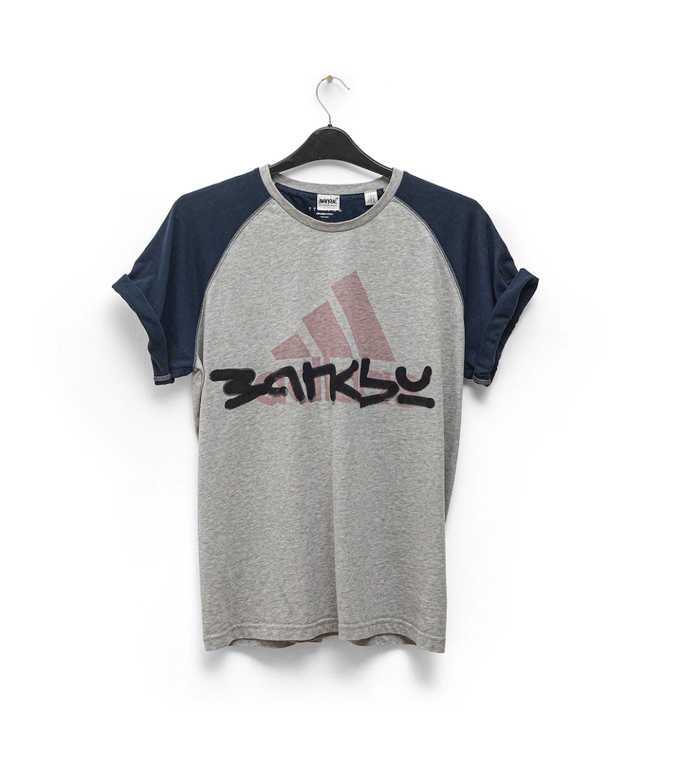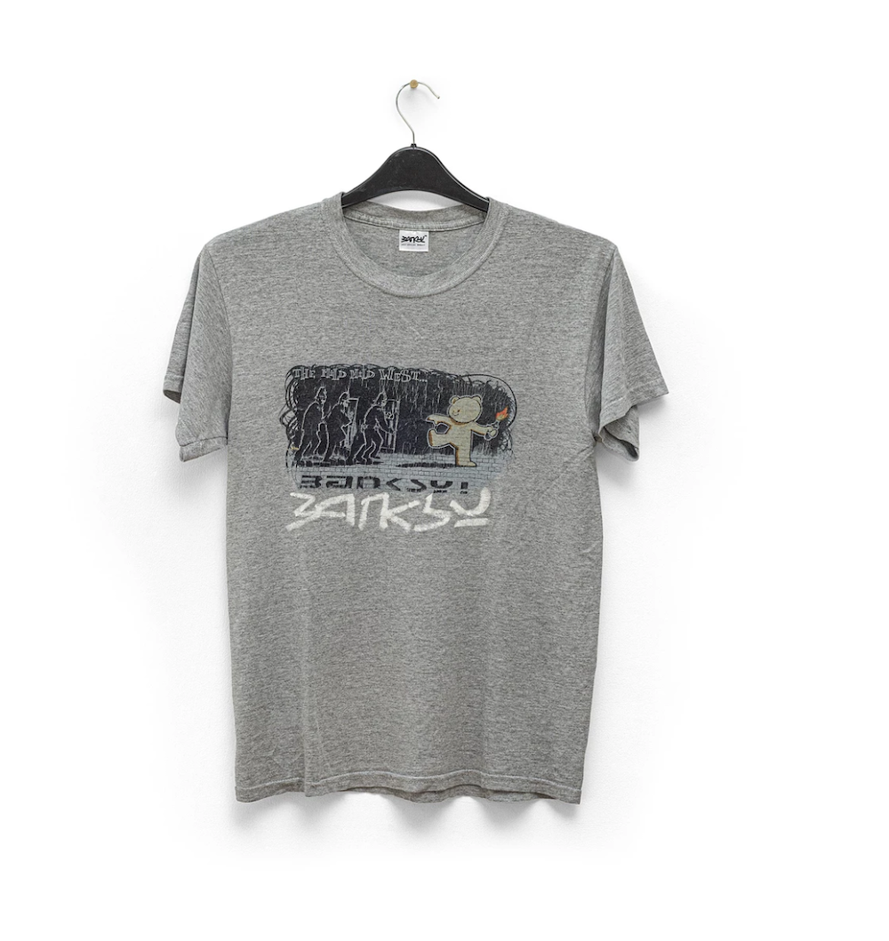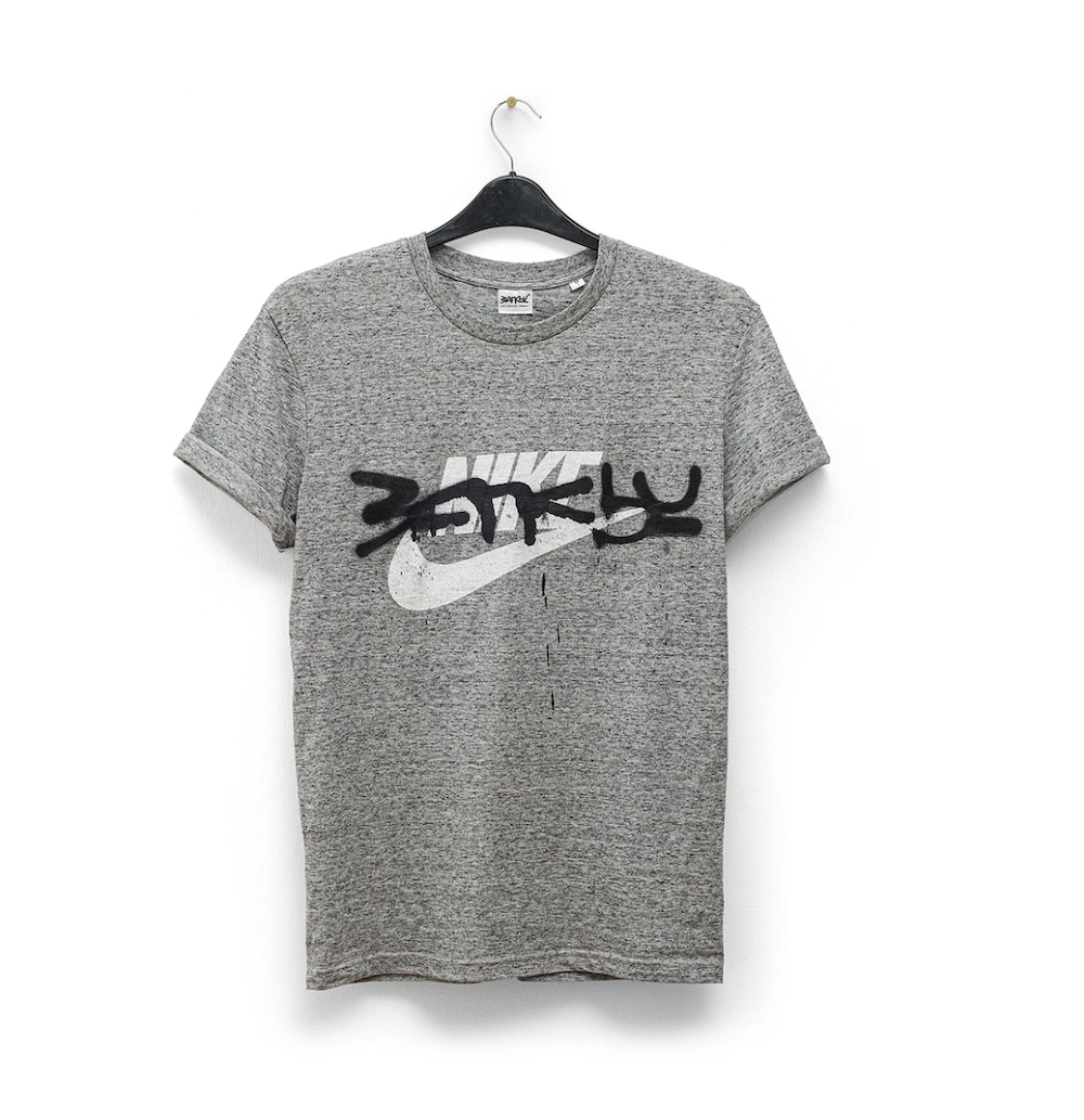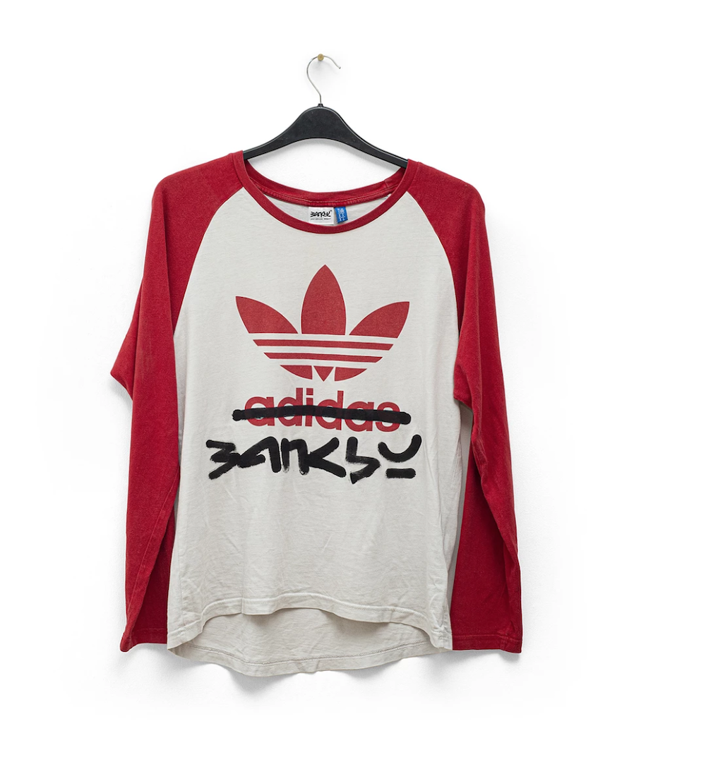 The signature that covers the Nike swoosh and the two adidas logos (trefoil and Three Stripes) was physically created by the artist with oil spray, a non-indelible painting that could stain other stuff if you wash it at the same time. Banksy's tees are immediate, dissolve and launch targeted messages, all that identify his street art.