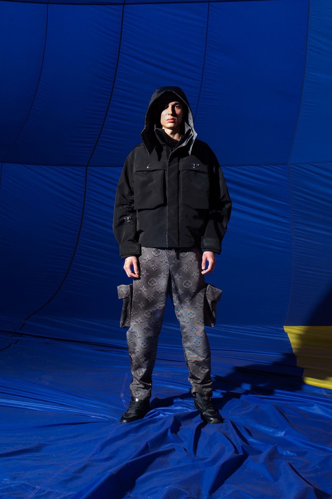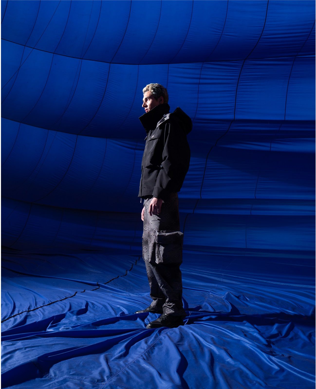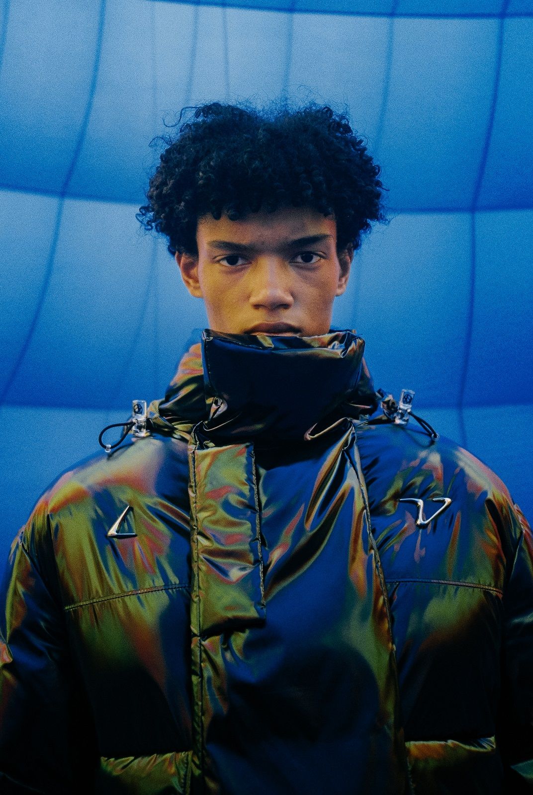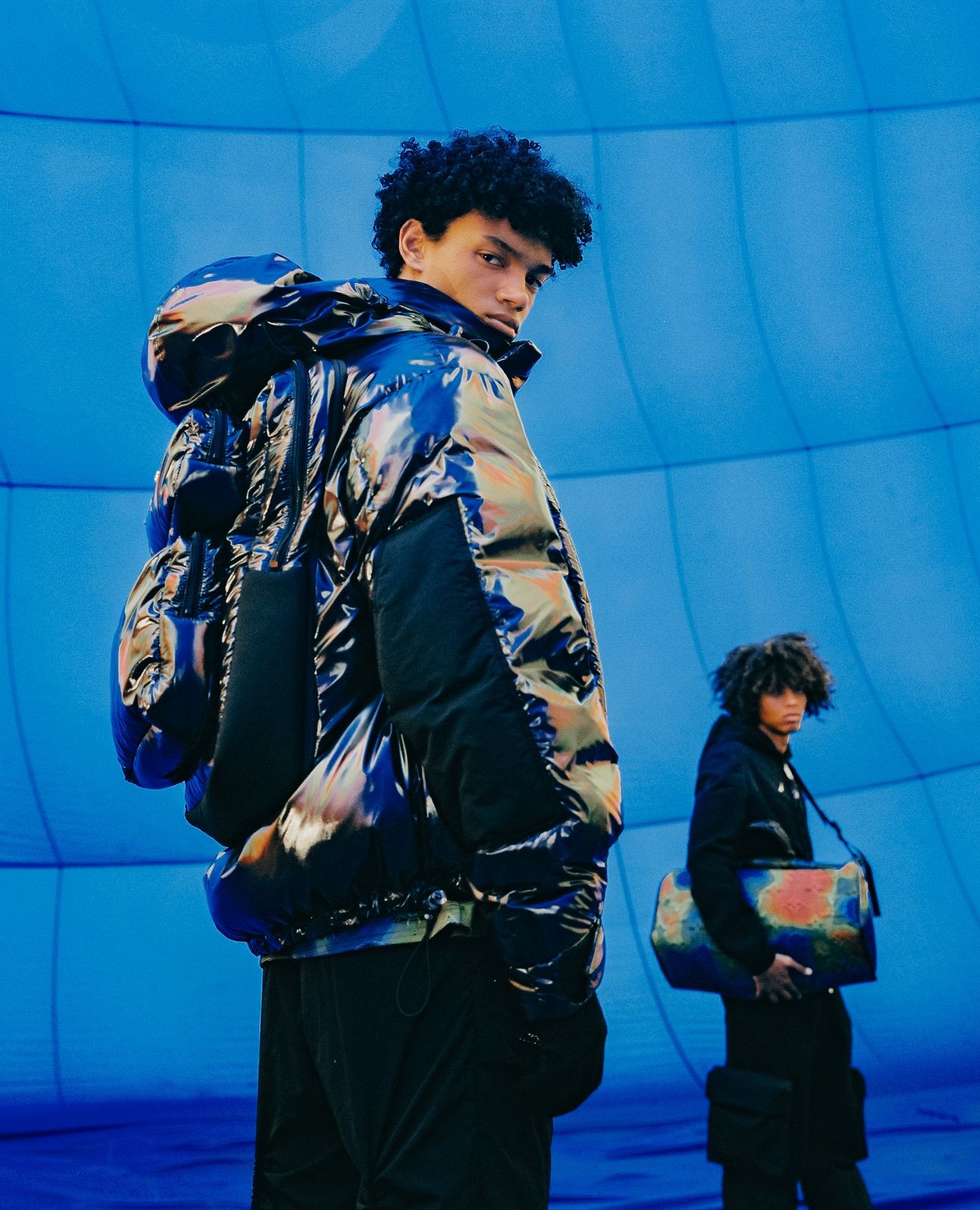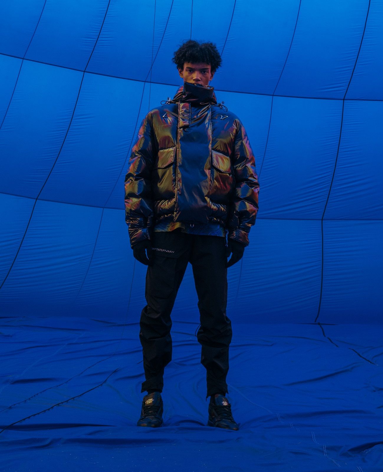 All items are water-repellent. The collection includes a puffer jacket, a military-style parka, a padded overshirt, two sneakers, military-inspired hiking boots whose upper follows the tubular structure of duvets, various poches, scarves and chain necklaces. The classic cargo pants blend with the parachuting pants and have removable pockets, the holdall can become a sleeping bag, the bucket hat can be folded and "packed" on itself. Synthetic surfaces are iridescent or black, with a glossy patina.
