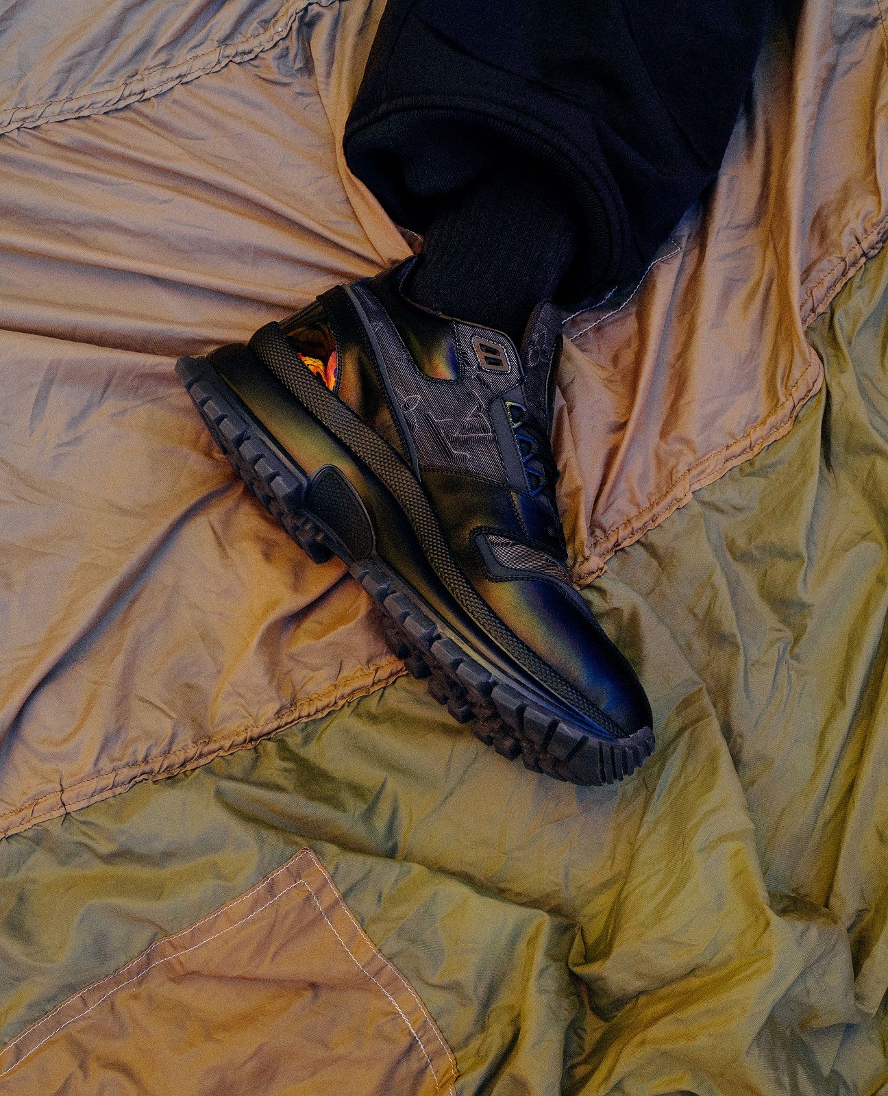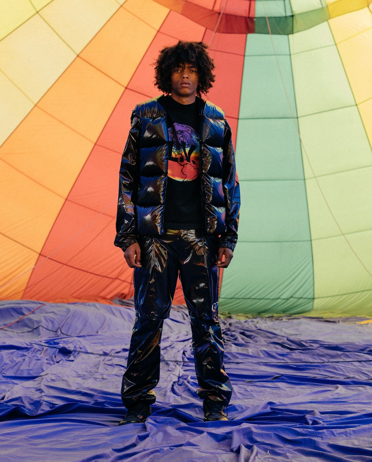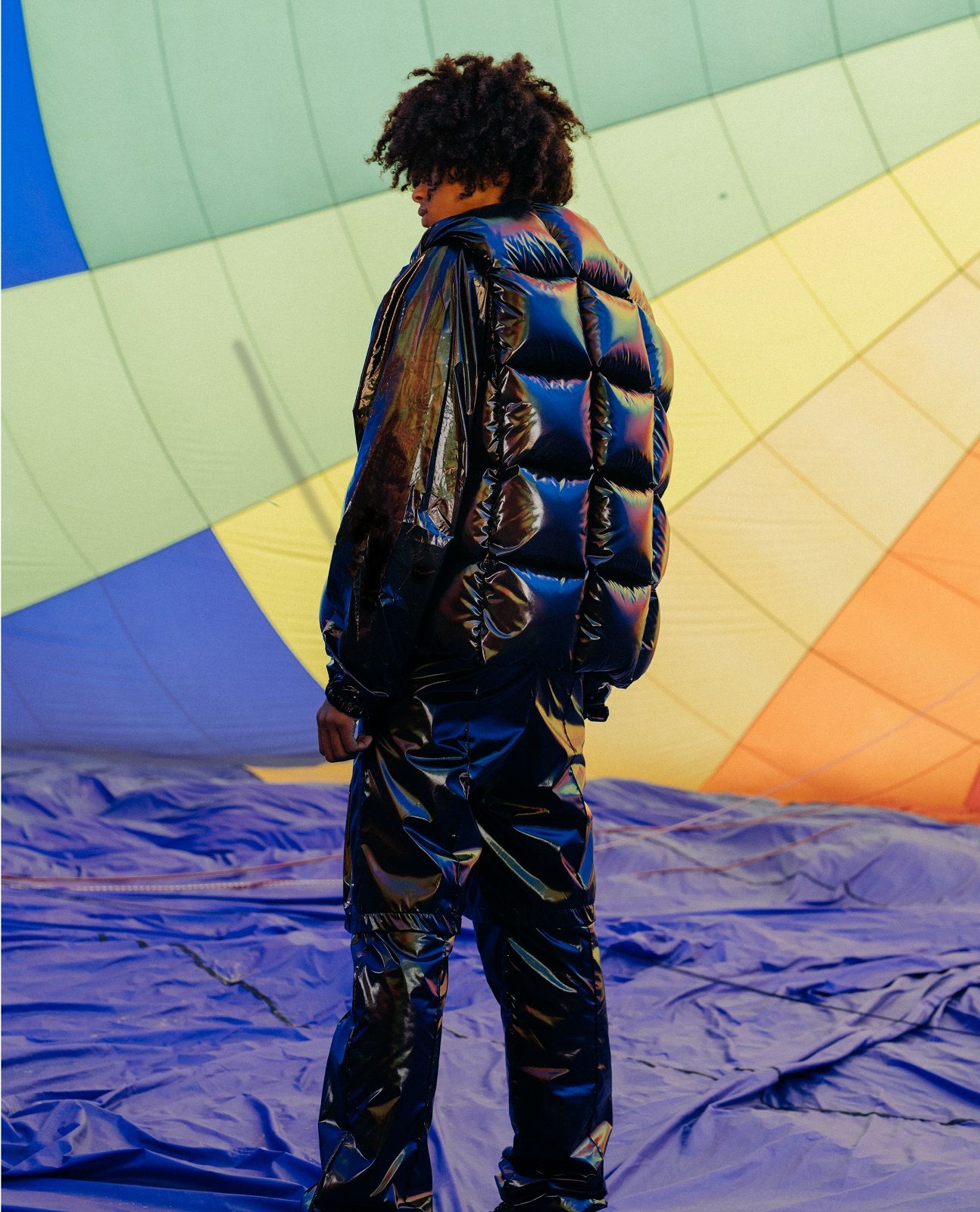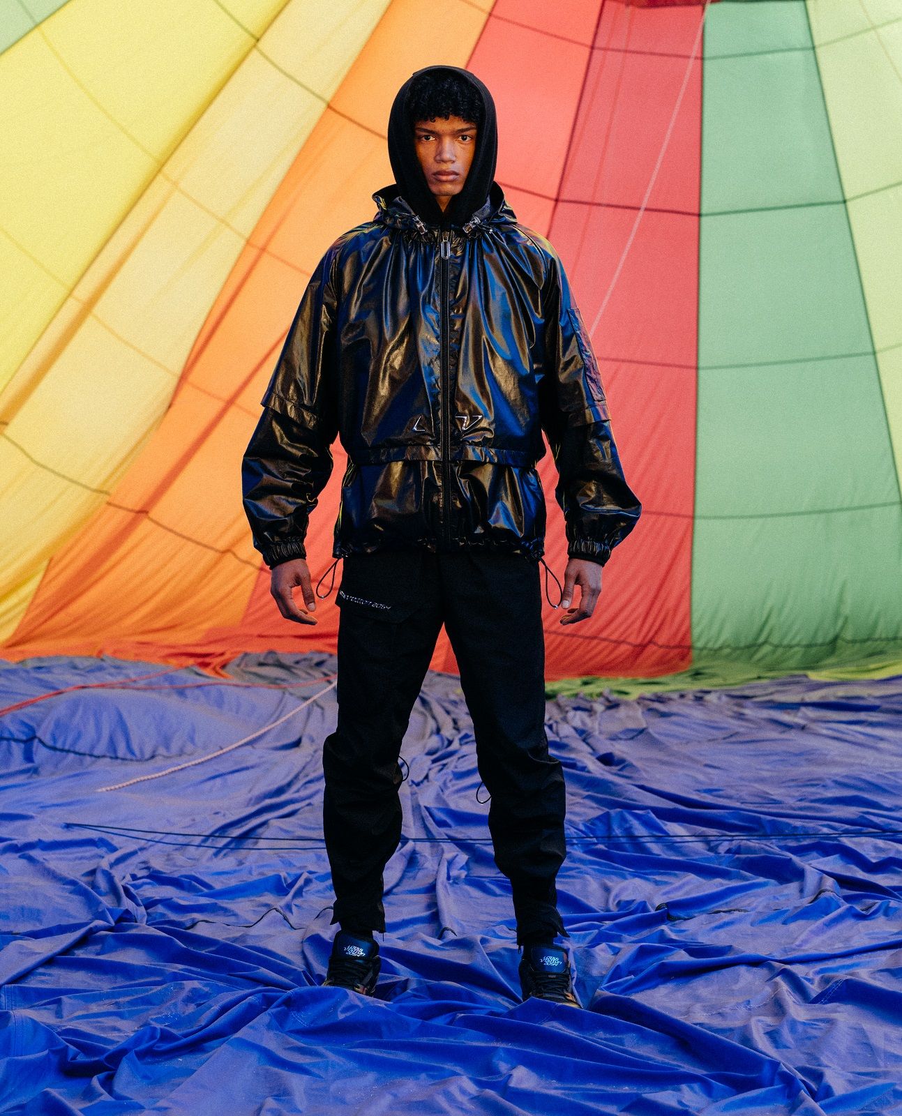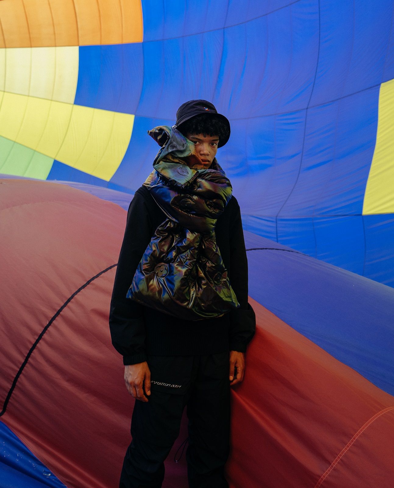 All items are water-repellent. The collection includes a puffer jacket, a military-style parka, a padded overshirt, two sneakers, military-inspired hiking boots whose upper follows the tubular structure of duvets, various poches, scarves and chain necklaces. The classic cargo pants blend with the parachuting pants and have removable pockets, the holdall can become a sleeping bag, the bucket hat can be folded and "packed" on itself. Synthetic surfaces are iridescent or black, with a glossy patina.