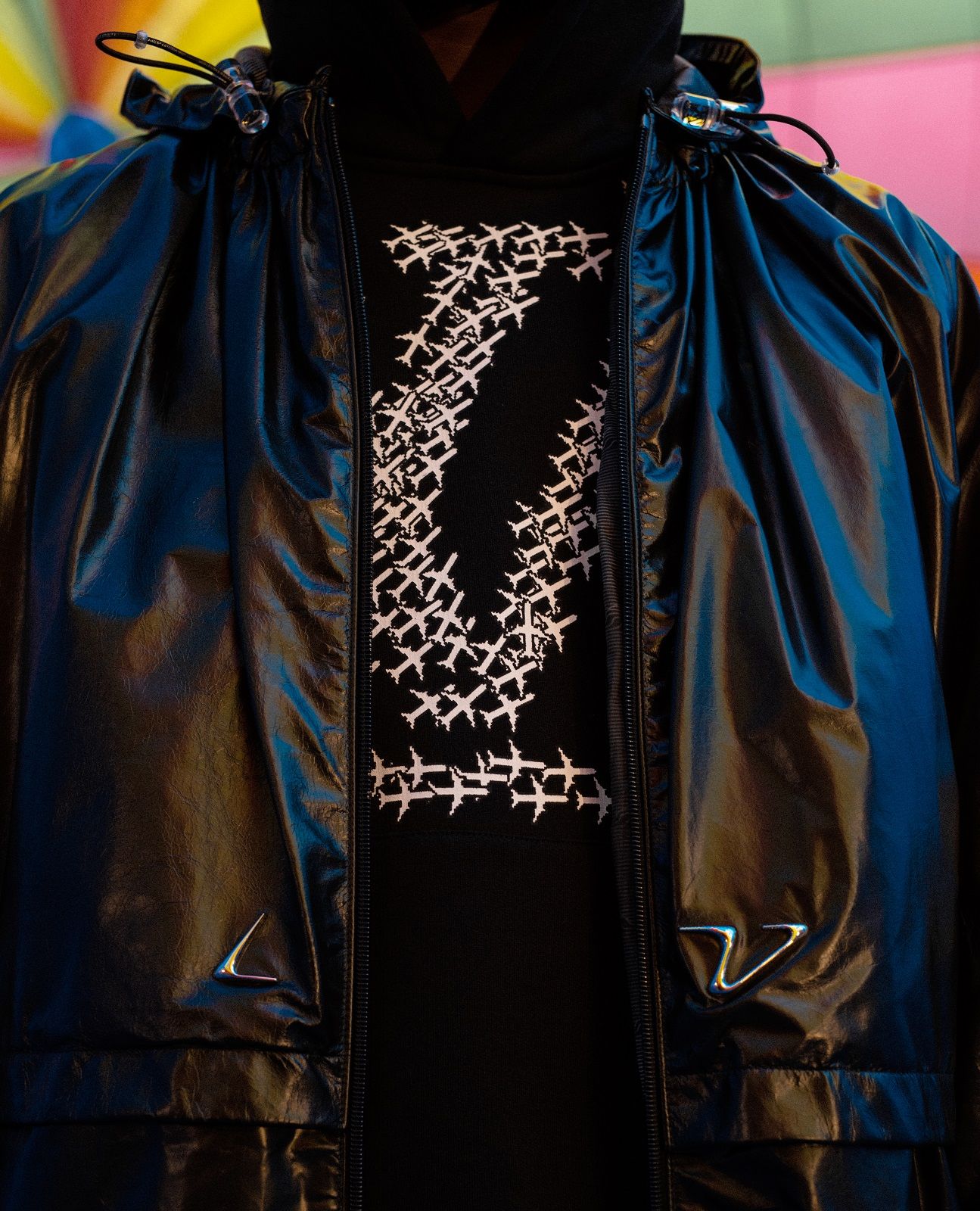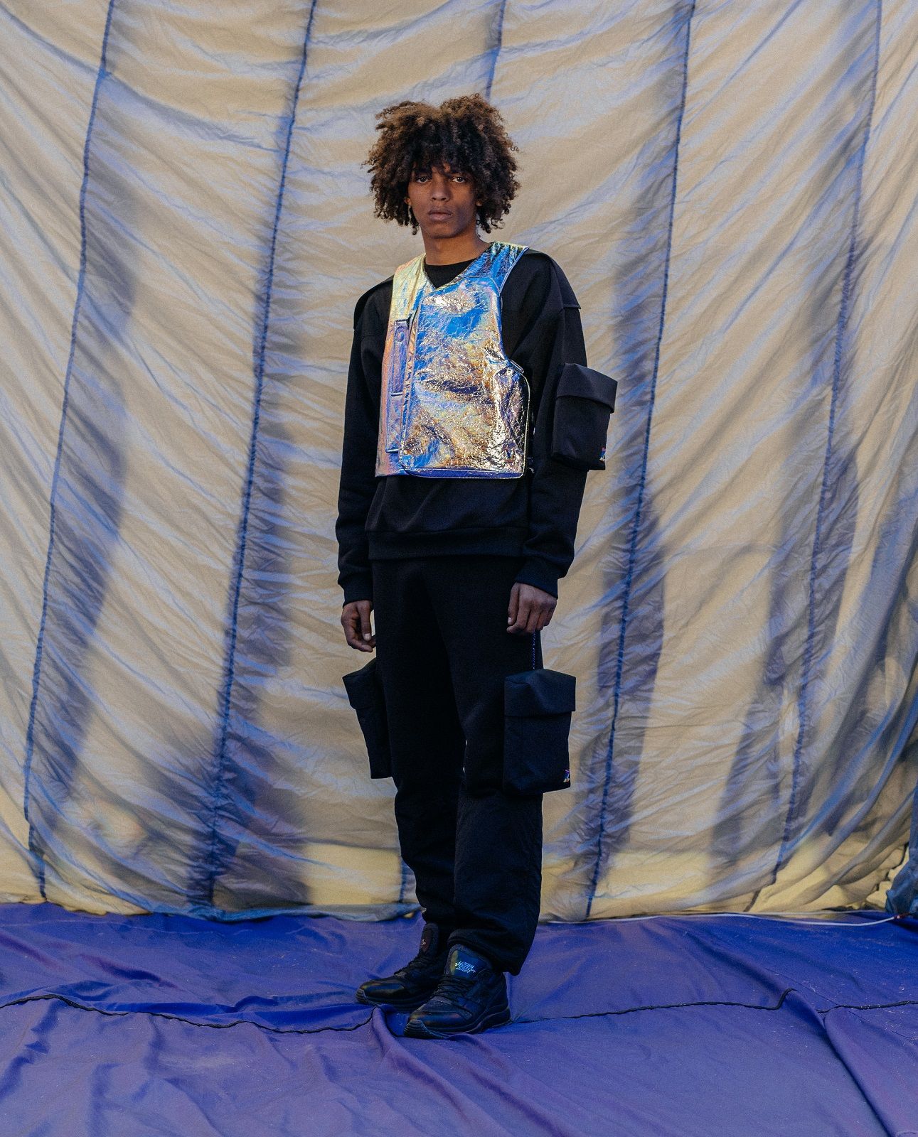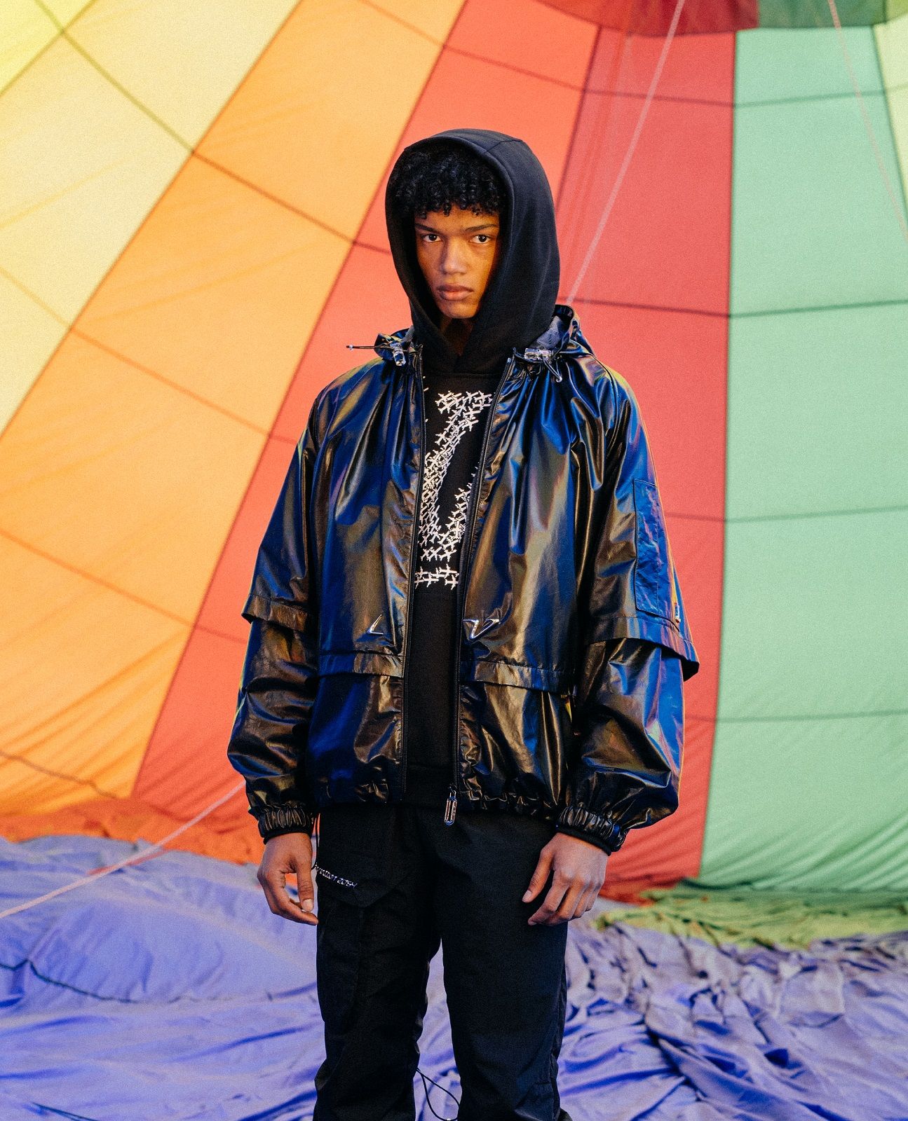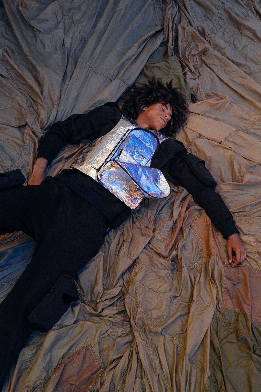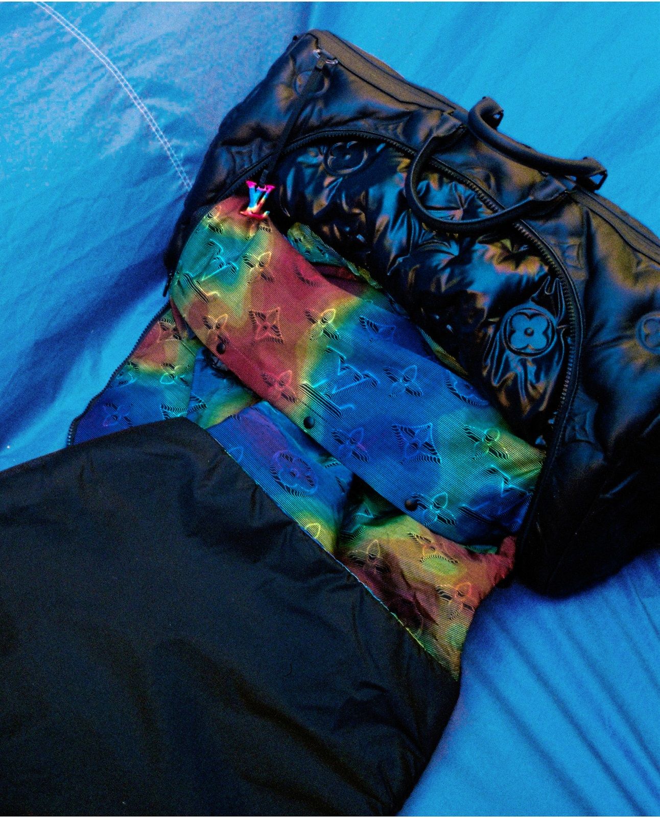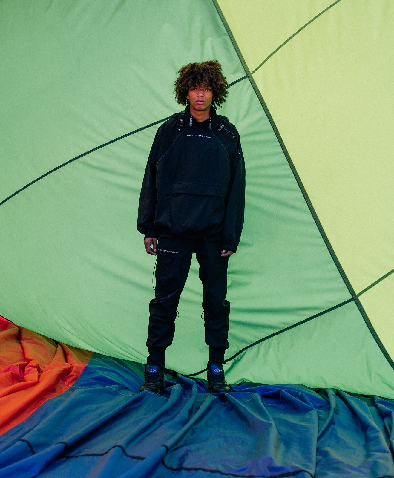 All items are water-repellent. The collection includes a puffer jacket, a military-style parka, a padded overshirt, two sneakers, military-inspired hiking boots whose upper follows the tubular structure of duvets, various poches, scarves and chain necklaces. The classic cargo pants blend with the parachuting pants and have removable pockets, the holdall can become a sleeping bag, the bucket hat can be folded and "packed" on itself. Synthetic surfaces are iridescent or black, with a glossy patina.