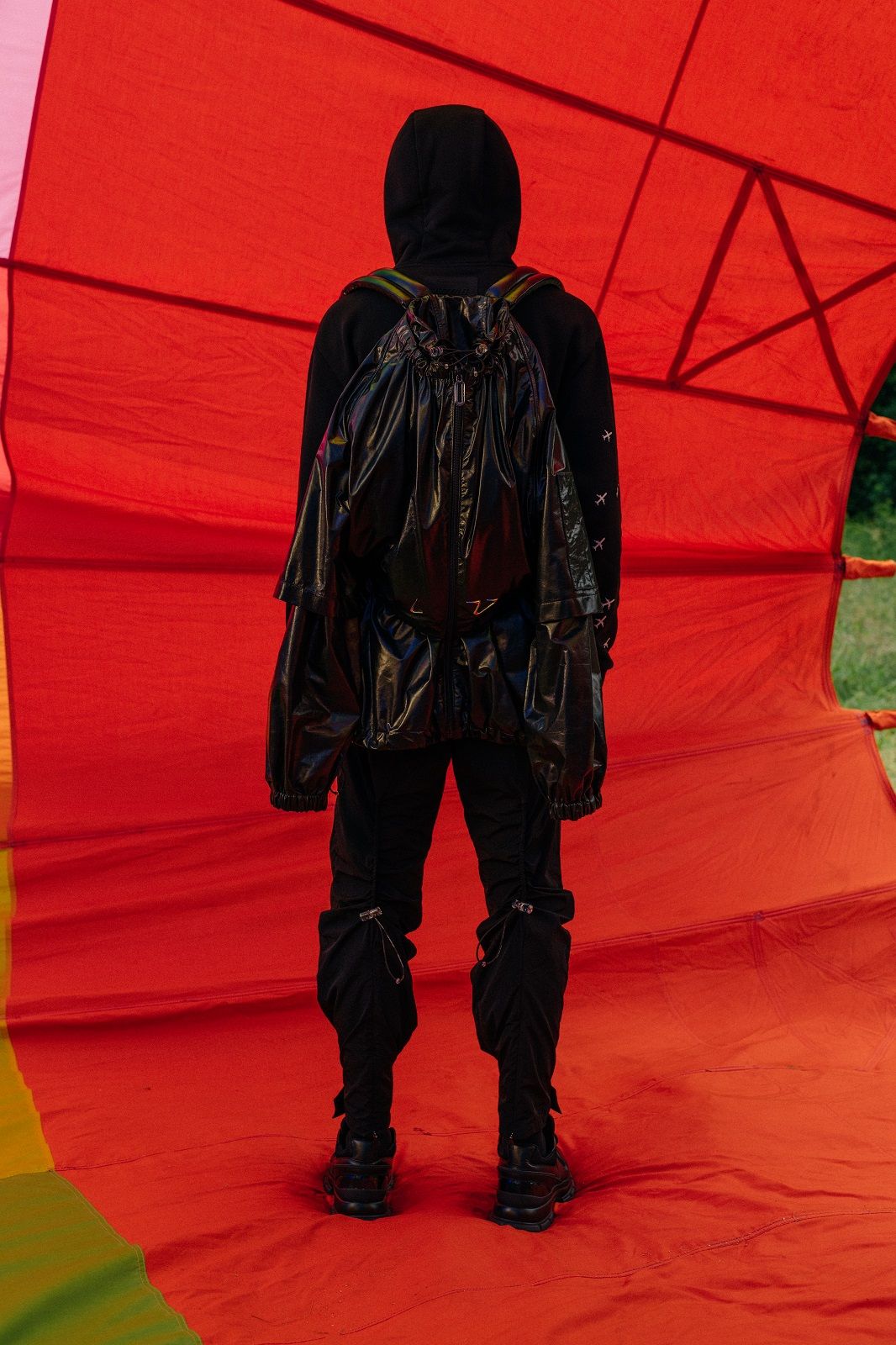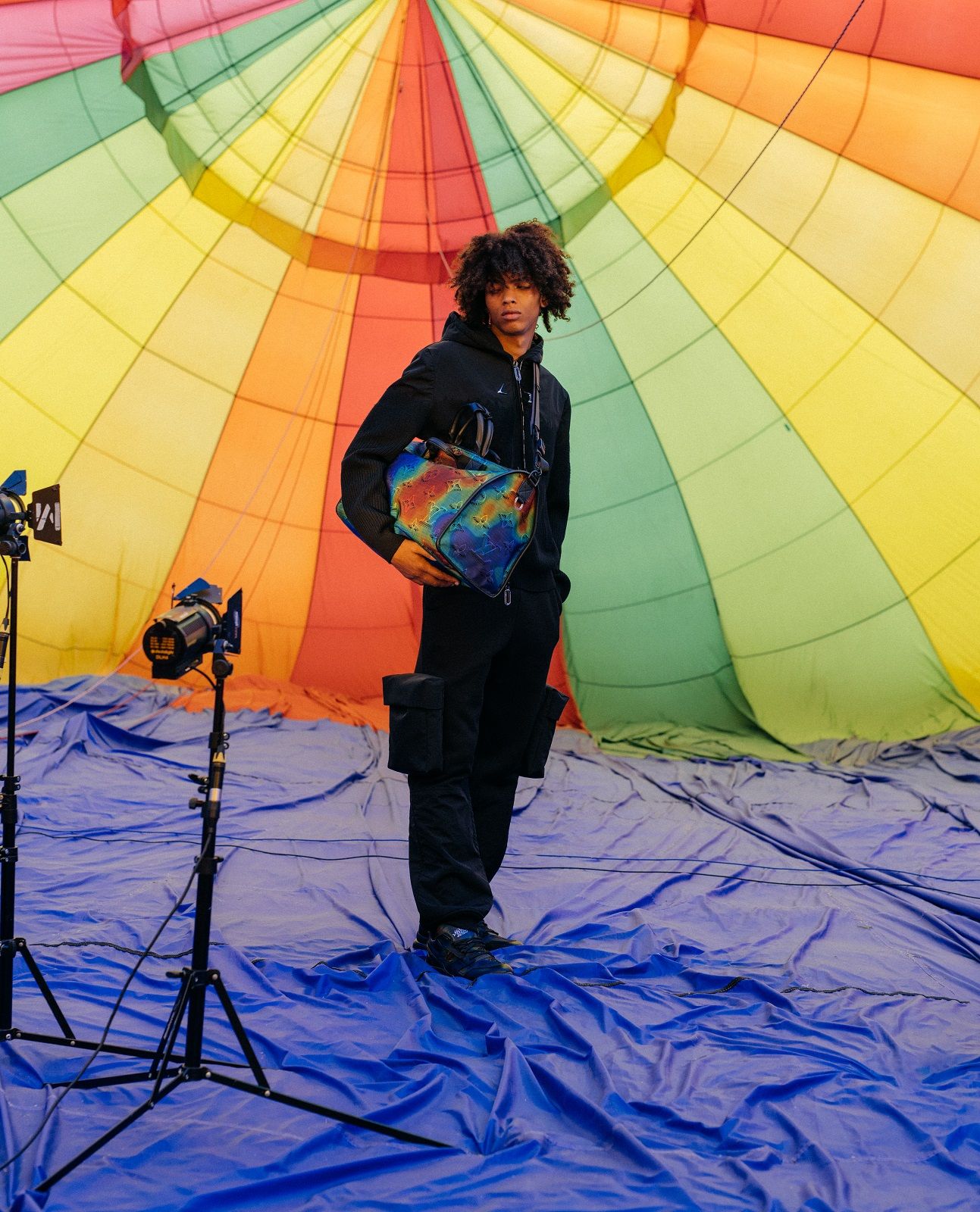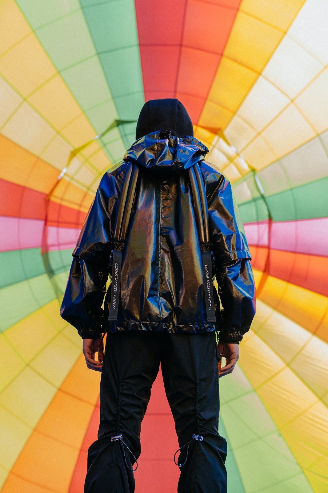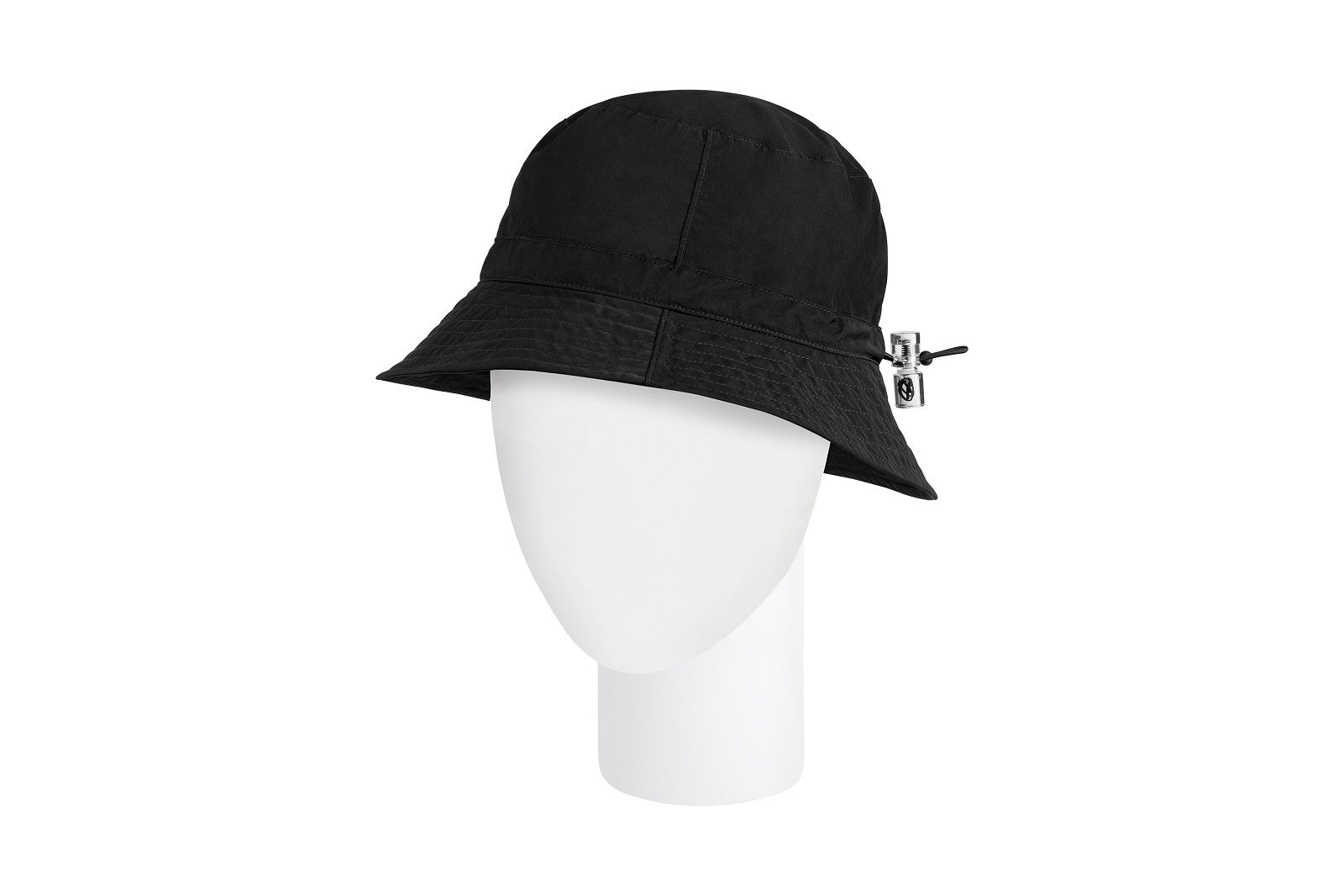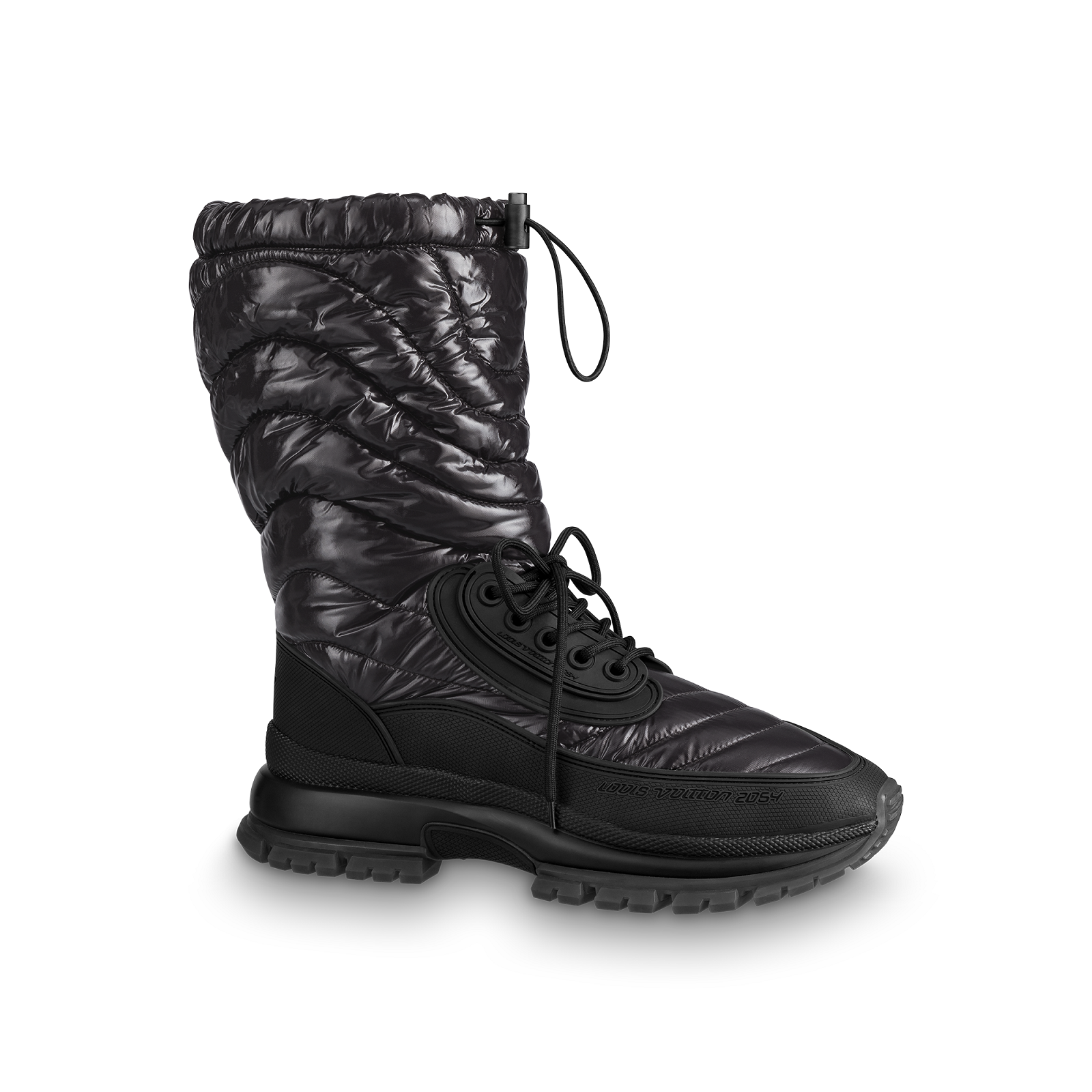 All items are water-repellent. The collection includes a puffer jacket, a military-style parka, a padded overshirt, two sneakers, military-inspired hiking boots whose upper follows the tubular structure of duvets, various poches, scarves and chain necklaces. The classic cargo pants blend with the parachuting pants and have removable pockets, the holdall can become a sleeping bag, the bucket hat can be folded and "packed" on itself. Synthetic surfaces are iridescent or black, with a glossy patina.