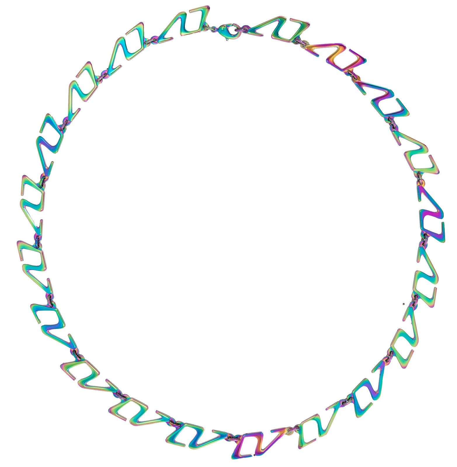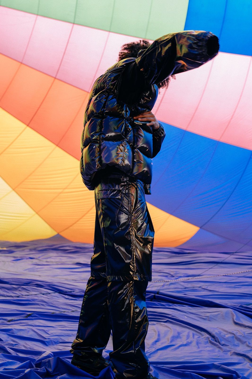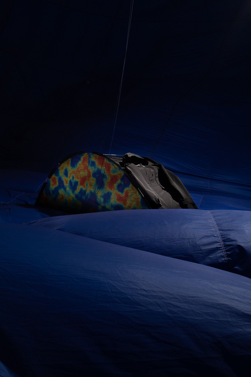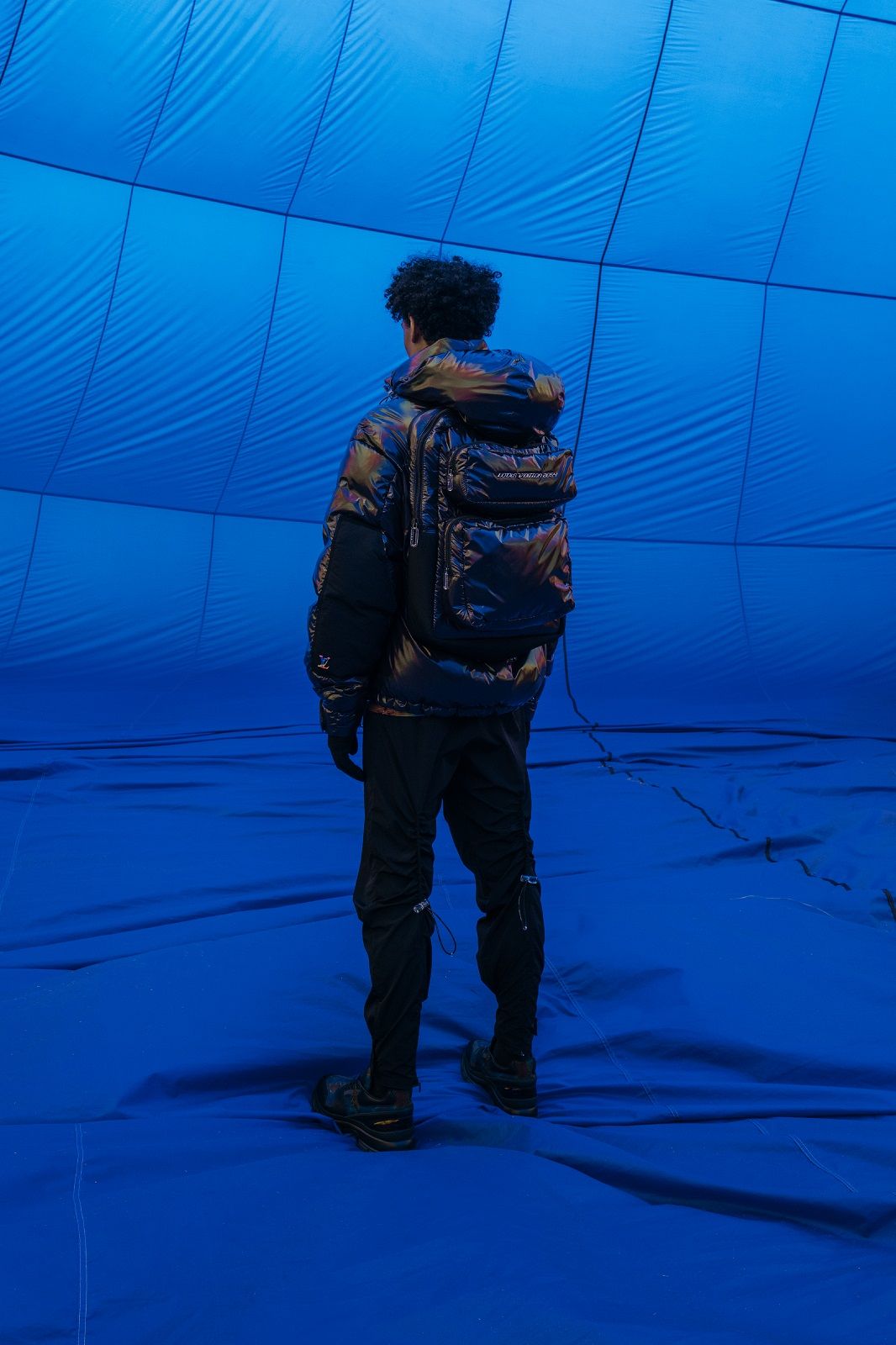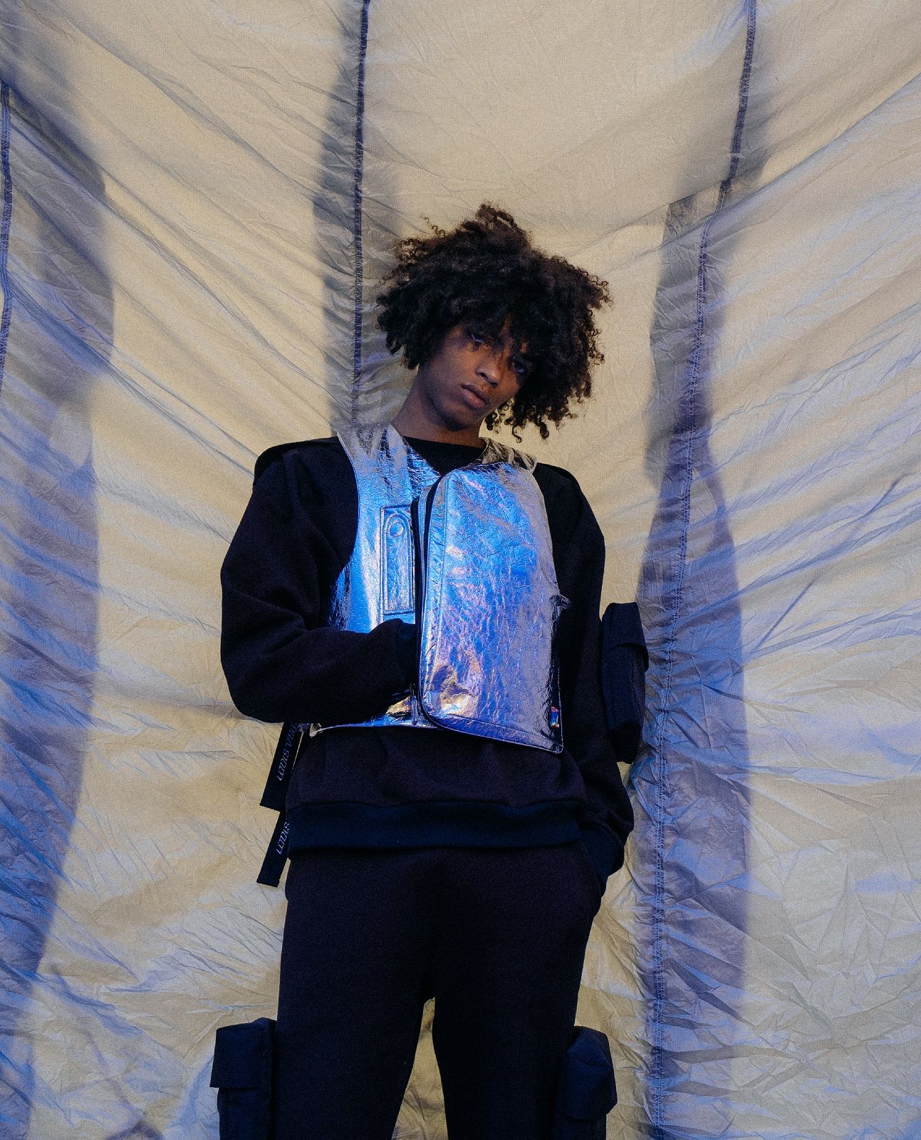 All items are water-repellent. The collection includes a puffer jacket, a military-style parka, a padded overshirt, two sneakers, military-inspired hiking boots whose upper follows the tubular structure of duvets, various poches, scarves and chain necklaces. The classic cargo pants blend with the parachuting pants and have removable pockets, the holdall can become a sleeping bag, the bucket hat can be folded and "packed" on itself. Synthetic surfaces are iridescent or black, with a glossy patina.
