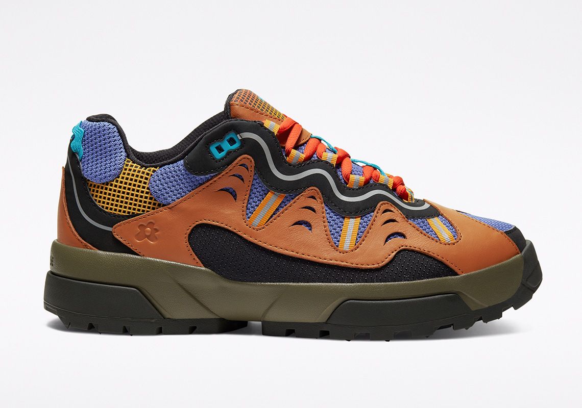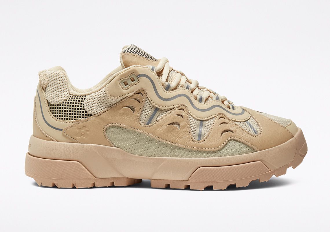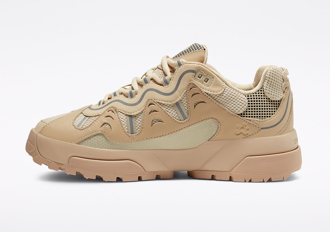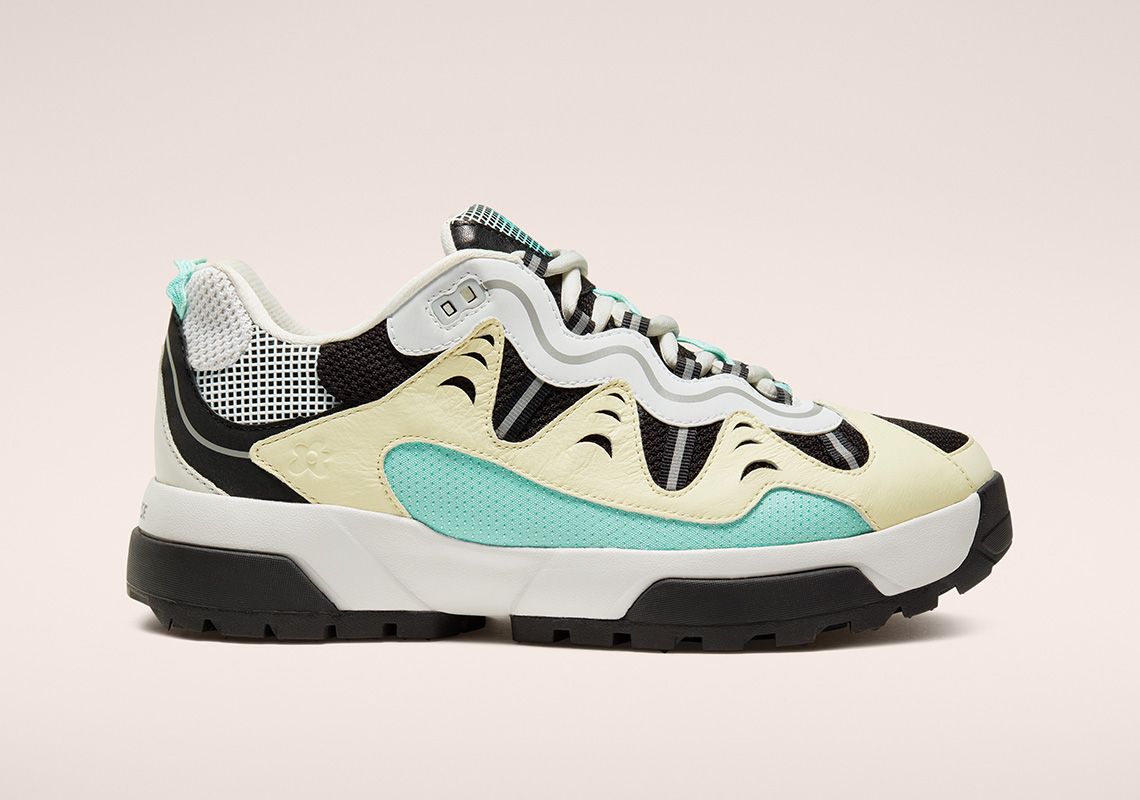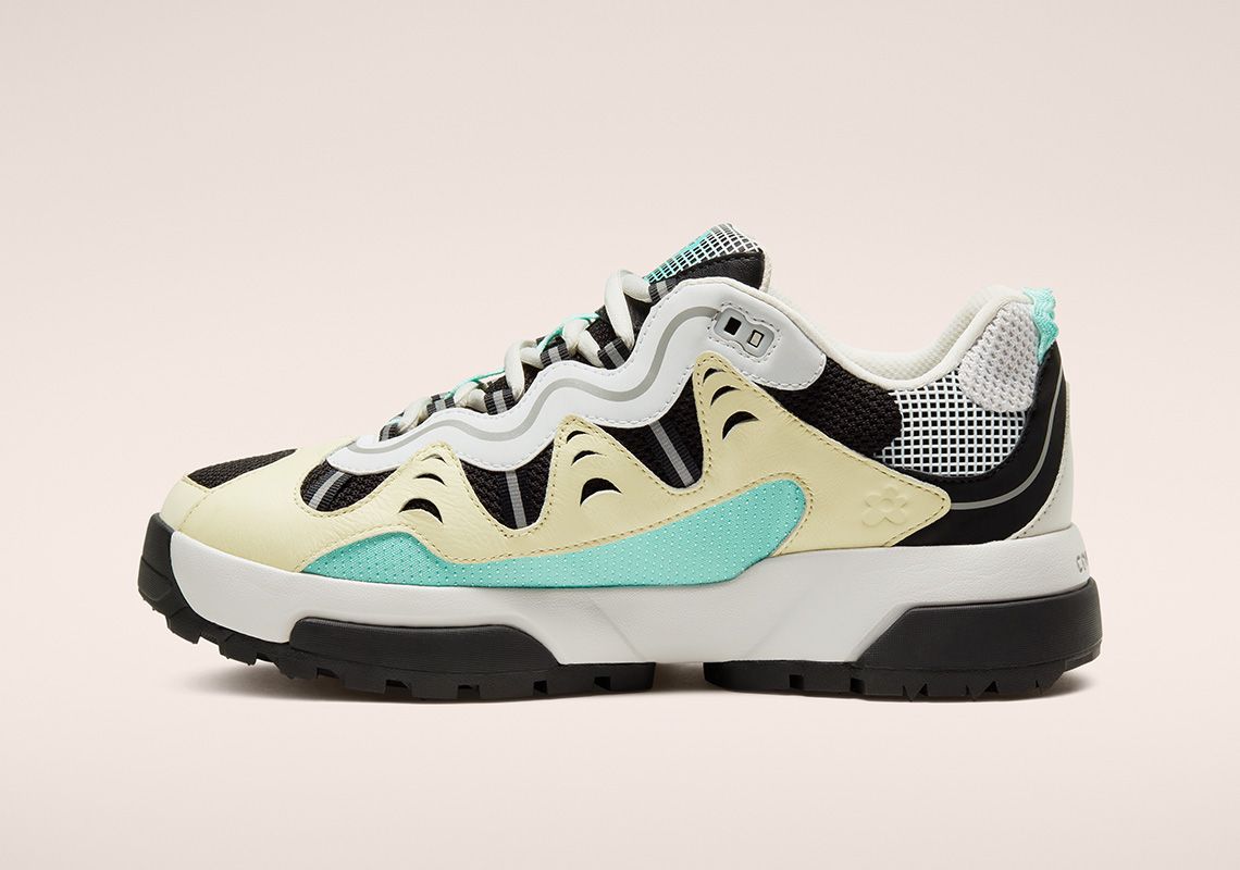 The Gianno is a hybrid between the chunky silhouette of the typical dad shoe and the composite and multilayered aesthetics of the trekking shoe. It comes in three colorways: Ox White, Cuban Sand and Bright Concord. The leather overlays give the upper dynamism and aggressiveness and contrast with the mesh elements, the grid decorations and the reflective stripes. The branding is discreet: on the tongue and on the upper are present only the logos of the two brands without writing, while the name Converse is engraved on the heel. The midsole is double and has two different colors in each colorway. Converse's design director, Matt Sleep, said:
