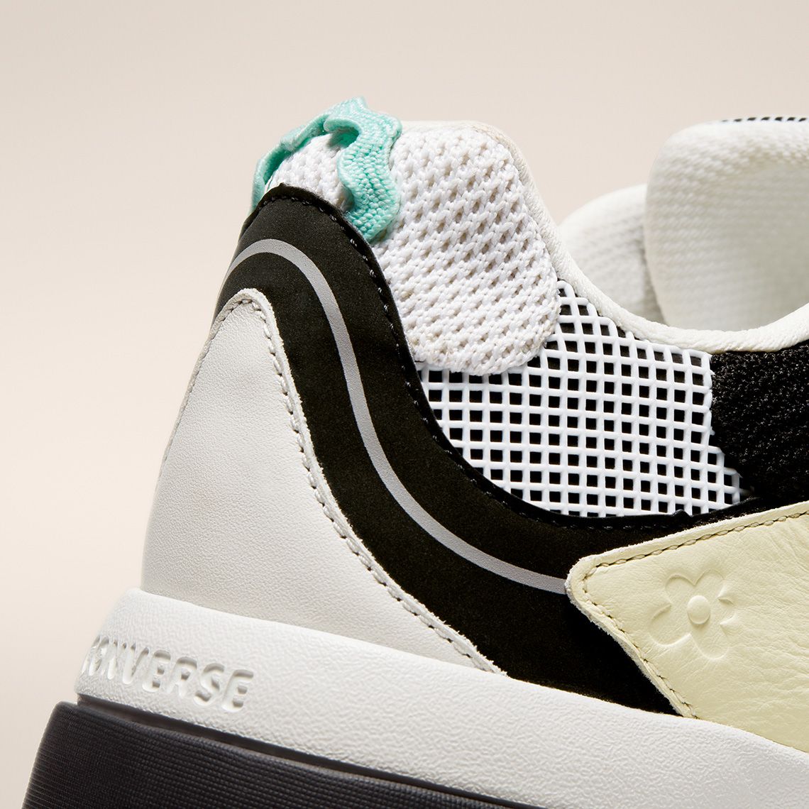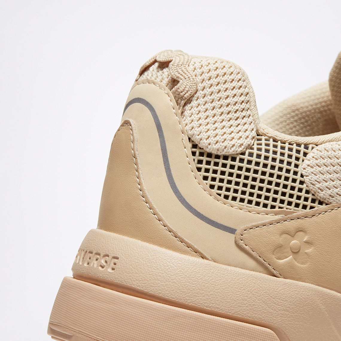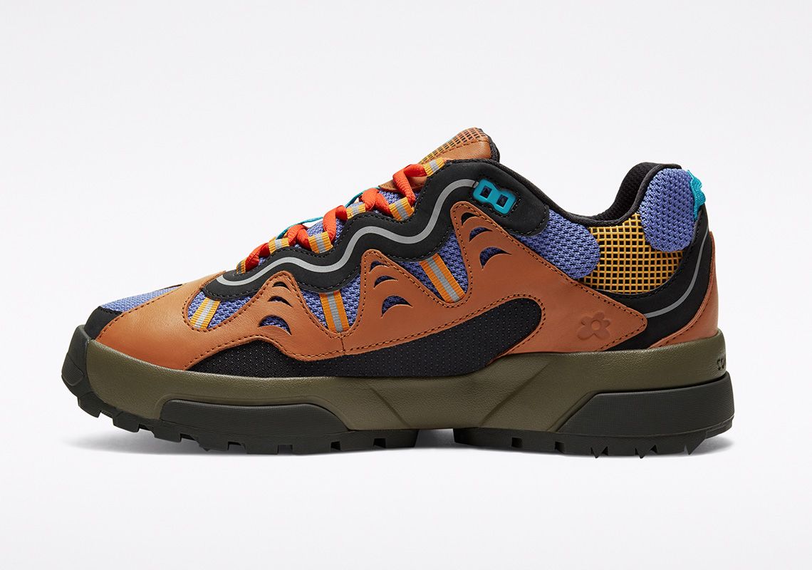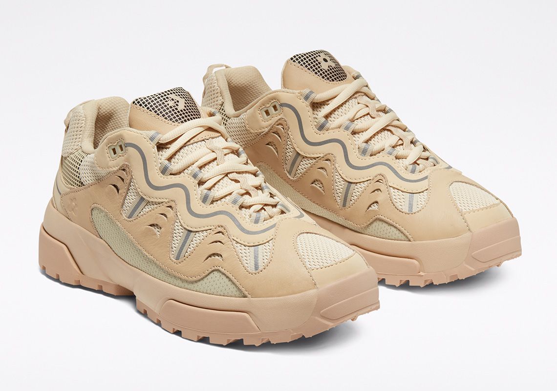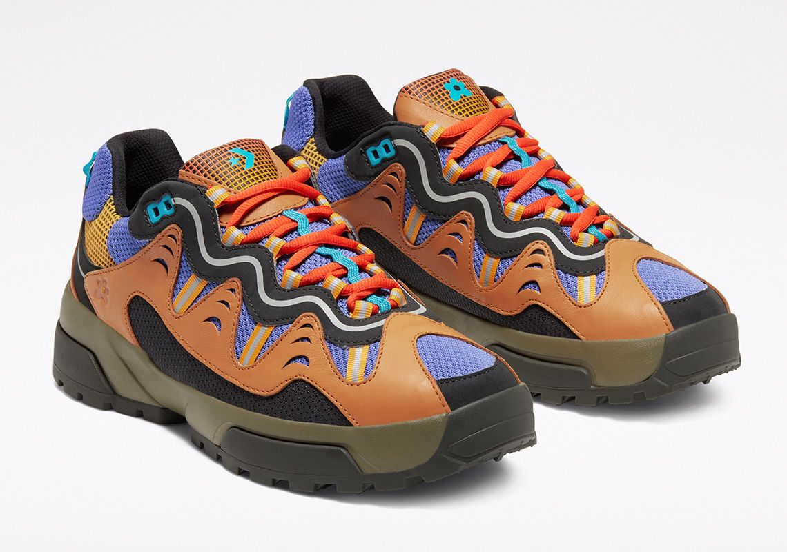 The Gianno is a hybrid between the chunky silhouette of the typical dad shoe and the composite and multilayered aesthetics of the trekking shoe. It comes in three colorways: Ox White, Cuban Sand and Bright Concord. The leather overlays give the upper dynamism and aggressiveness and contrast with the mesh elements, the grid decorations and the reflective stripes. The branding is discreet: on the tongue and on the upper are present only the logos of the two brands without writing, while the name Converse is engraved on the heel. The midsole is double and has two different colors in each colorway. Converse's design director, Matt Sleep, said: