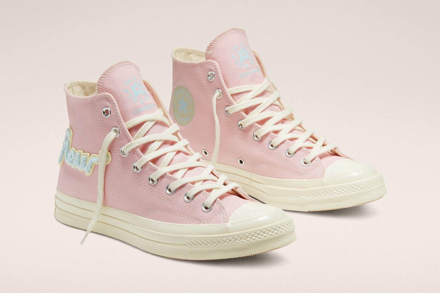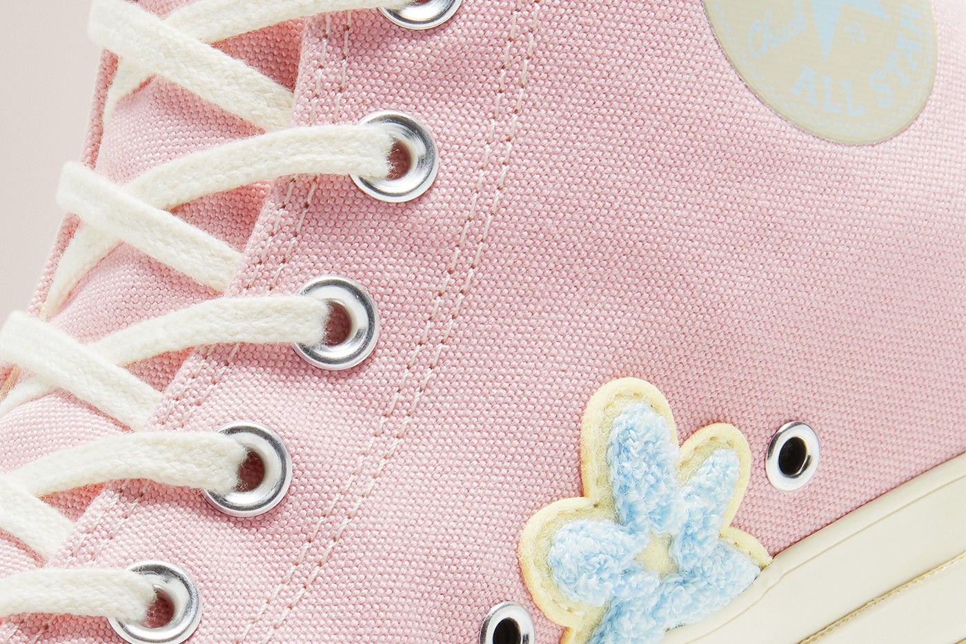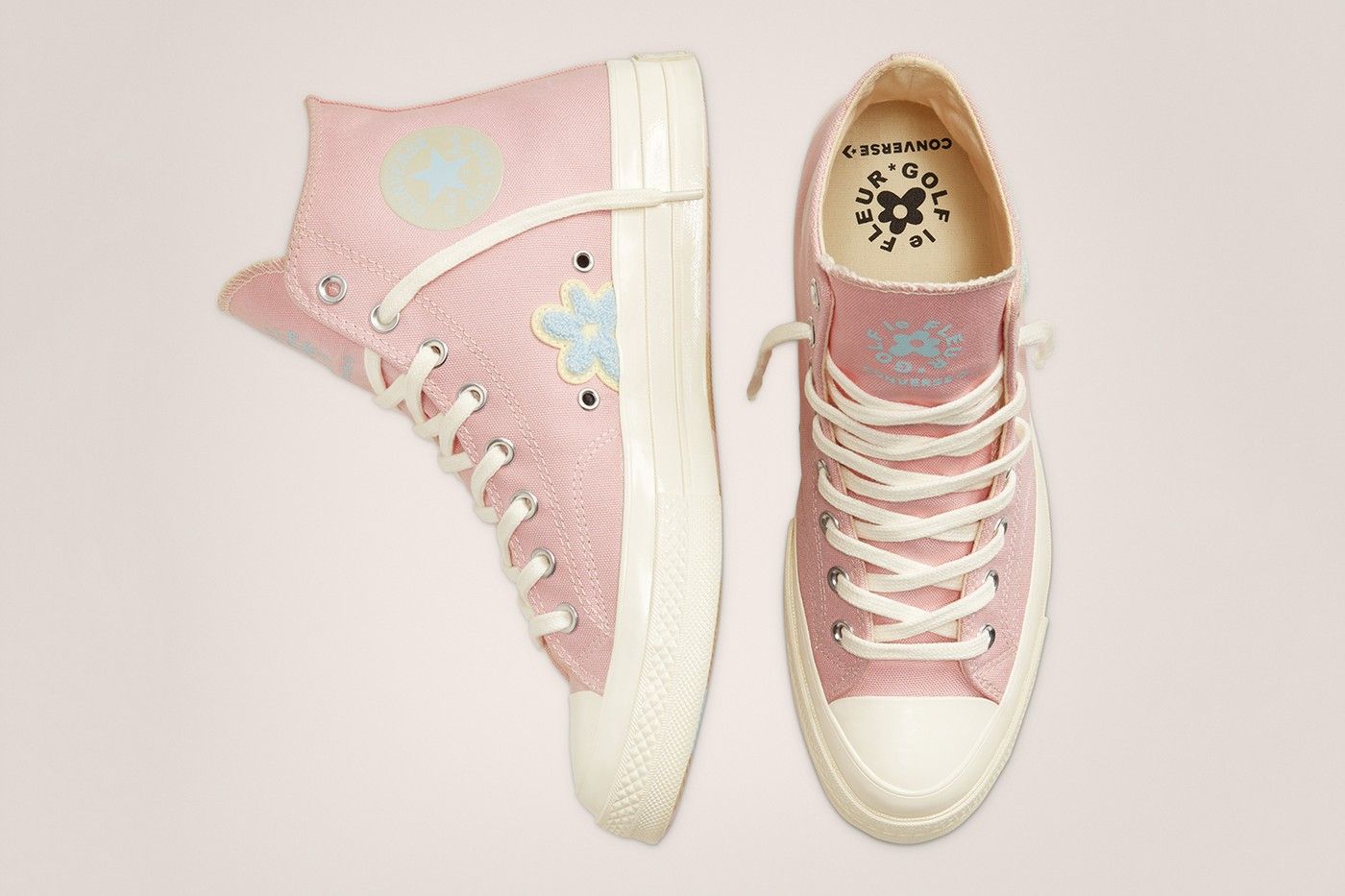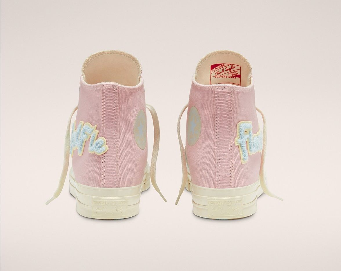 Together with the "Gianno", Converse will also make available a second collab, inspired by the color palette of the Igor album, named GOLF the FLEUR * x Converse "Chenille" Chuck 70. This additional model has a more classic design more in line with previous collaborations. On the classic upper of Chuck 70, colored in pale pink, is added the branding of Golf in the form of patches in yellow and blue chenille. The Converse branding is present on the inner side of each shoe and, together with Golf's, on the tongue.