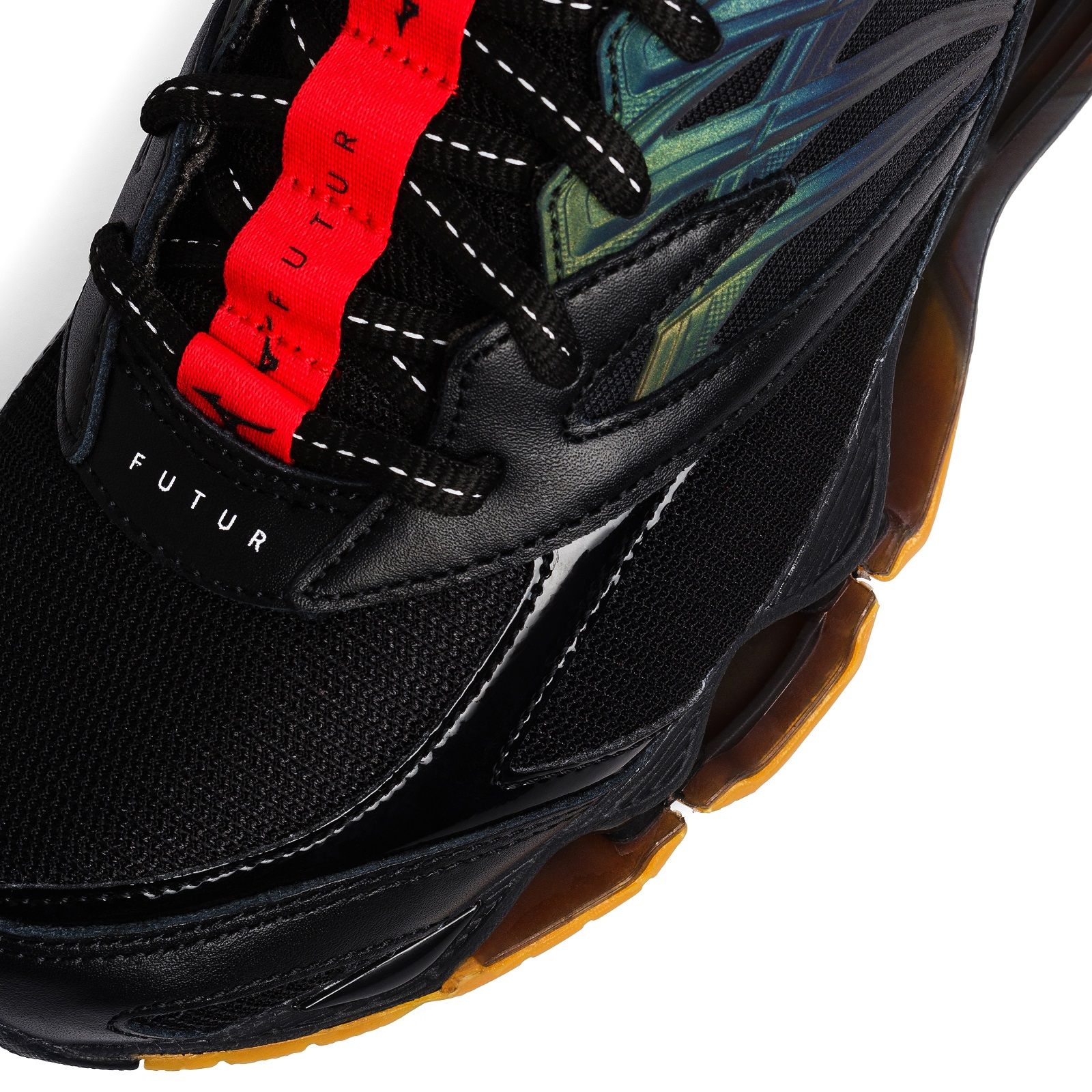 The centerpiece of the capsule is the Wave Prophecy FUTUR sneaker. The midsole of the sneaker is characterized by the Mizuno Infinity Wave support system, which was originally designed for running. It is a light thermoplastic material capable of absorbing any shock and above all maintaining a complete balance of the foot. In the version co-signed with FUTUR, it acquires a reflective motif on the side of the upper and iridescent details. In the black colorway, the red band on the tongue creates a color contrast with the rest of the upper, along with the orange outsole. The white one, on the other hand, has yellow contrastive elements. A plaque on the heel of each shoe bears the inscription 2019, a reference to the fifth anniversary of FUTUR.