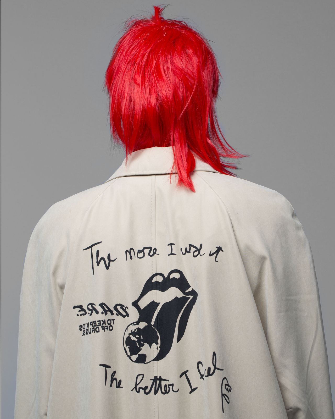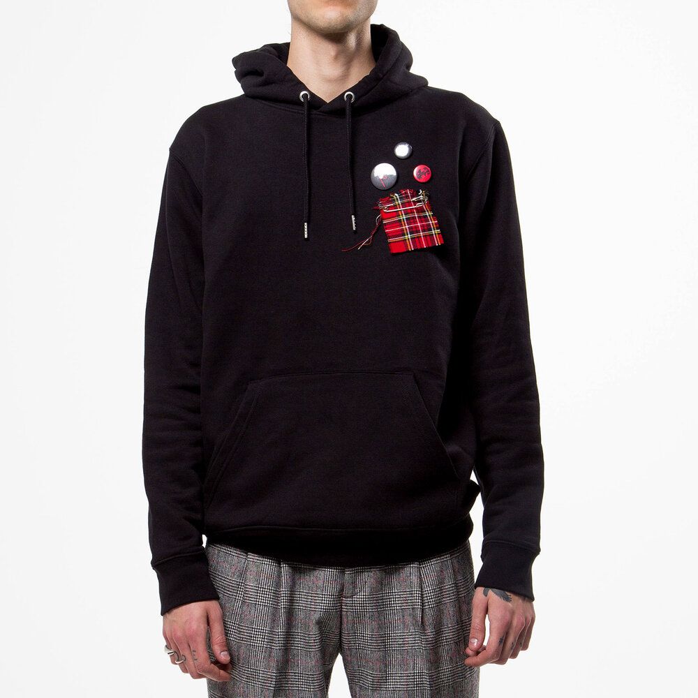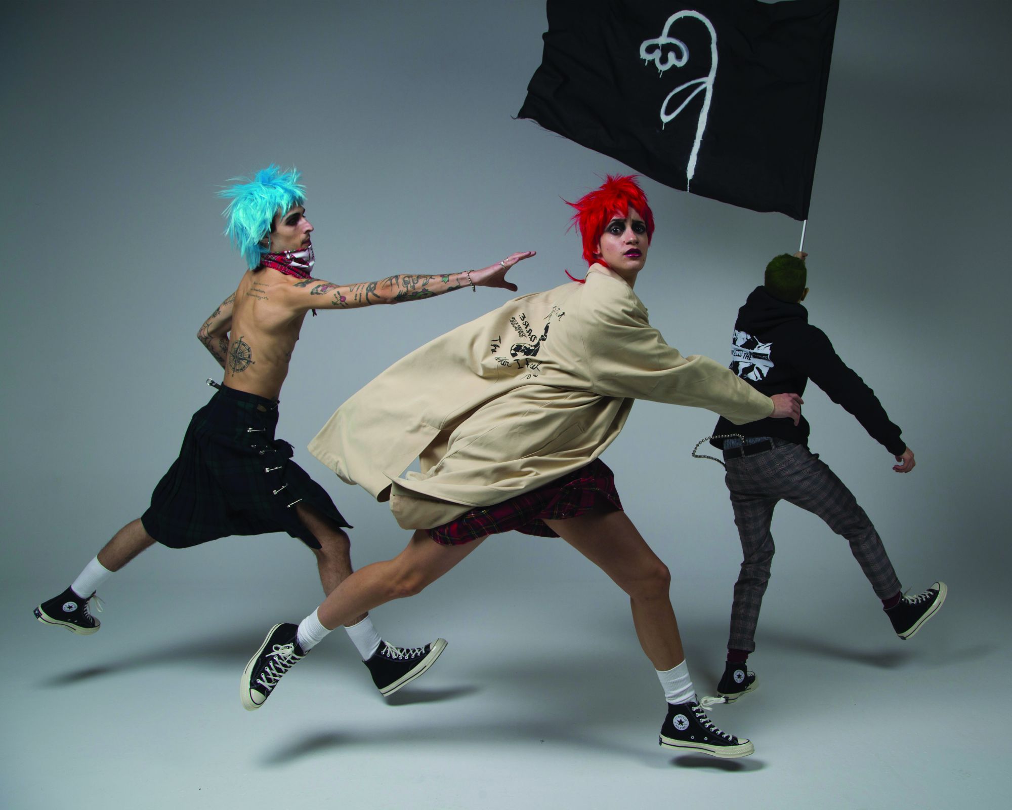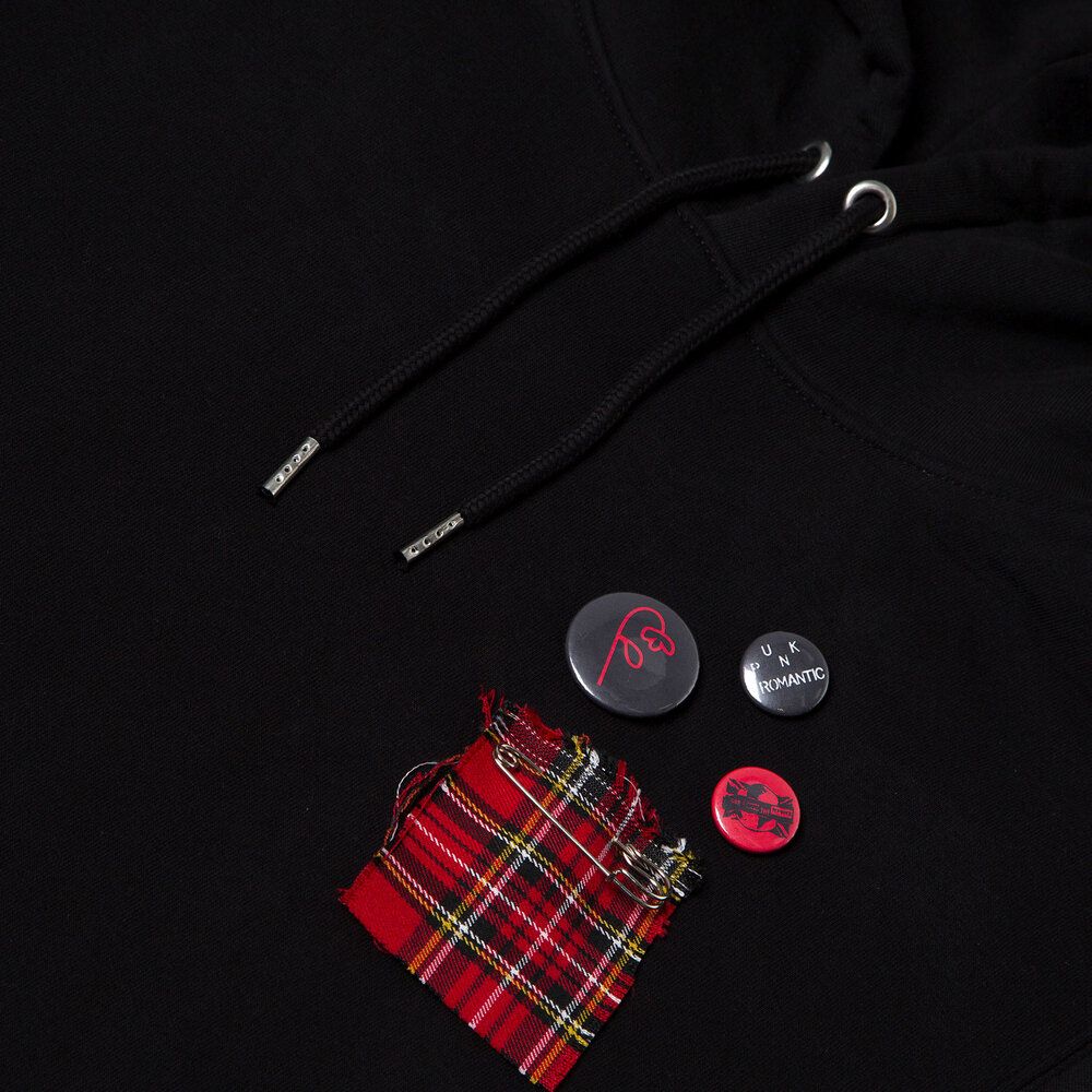The capsule consists of a hoodie, a trench coat and two bandanas. The Vicious hoodie is decorated with various pins, including an insert of tartan fabric pinned to the fabric via a nanny brooch. The same decoration returns in the Trench D.A.R.E. to which a graphic print in the style of graffiti on the back is added. The two tartan bandanas are also decorated with pins and a white print, always in graffiti style.