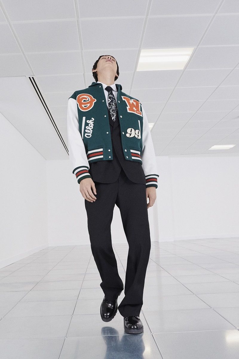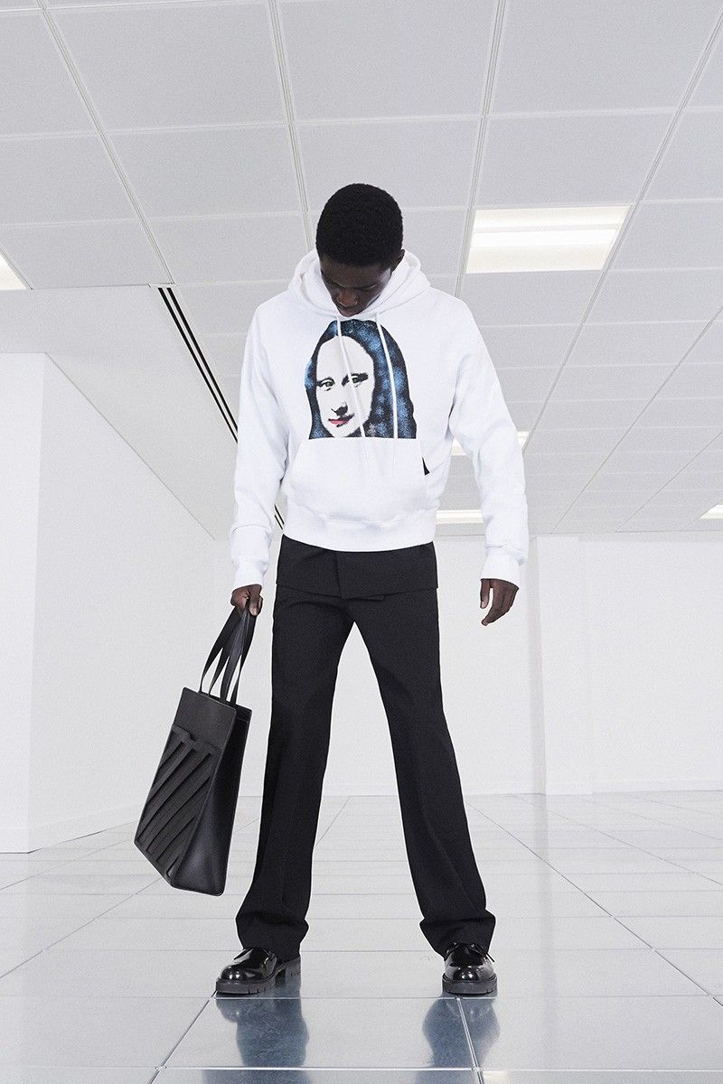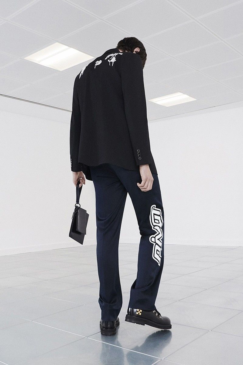 The graphics are smaller, the cross arrows are reduced and transformed into metal items such as buckles, bracelets and pendants. The "Pivot" print appears printed on the trousers along with the number "'99", a reference to the young man of the designer who, at that time, was 19 years old, and the surname Abloh embroidered on the varsity jacket. The sporting inspirations also appear reduced, reworked in the form of tight varsity jacket and t-shirts, along with the garments that more closely recall the previous streetwear style, such as printed sweatshirts and t-shirts, patchwork jeans and decorated knitwear.