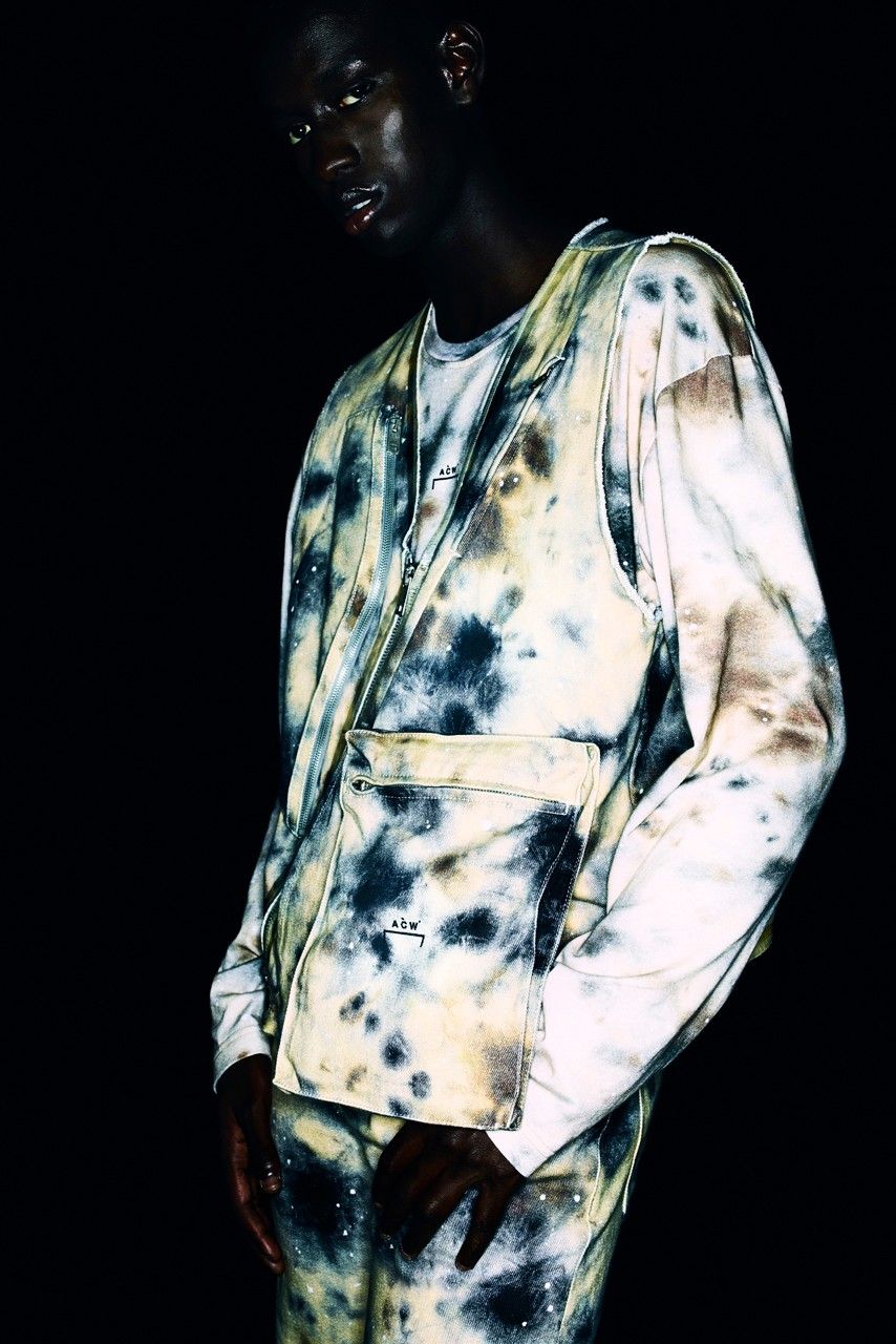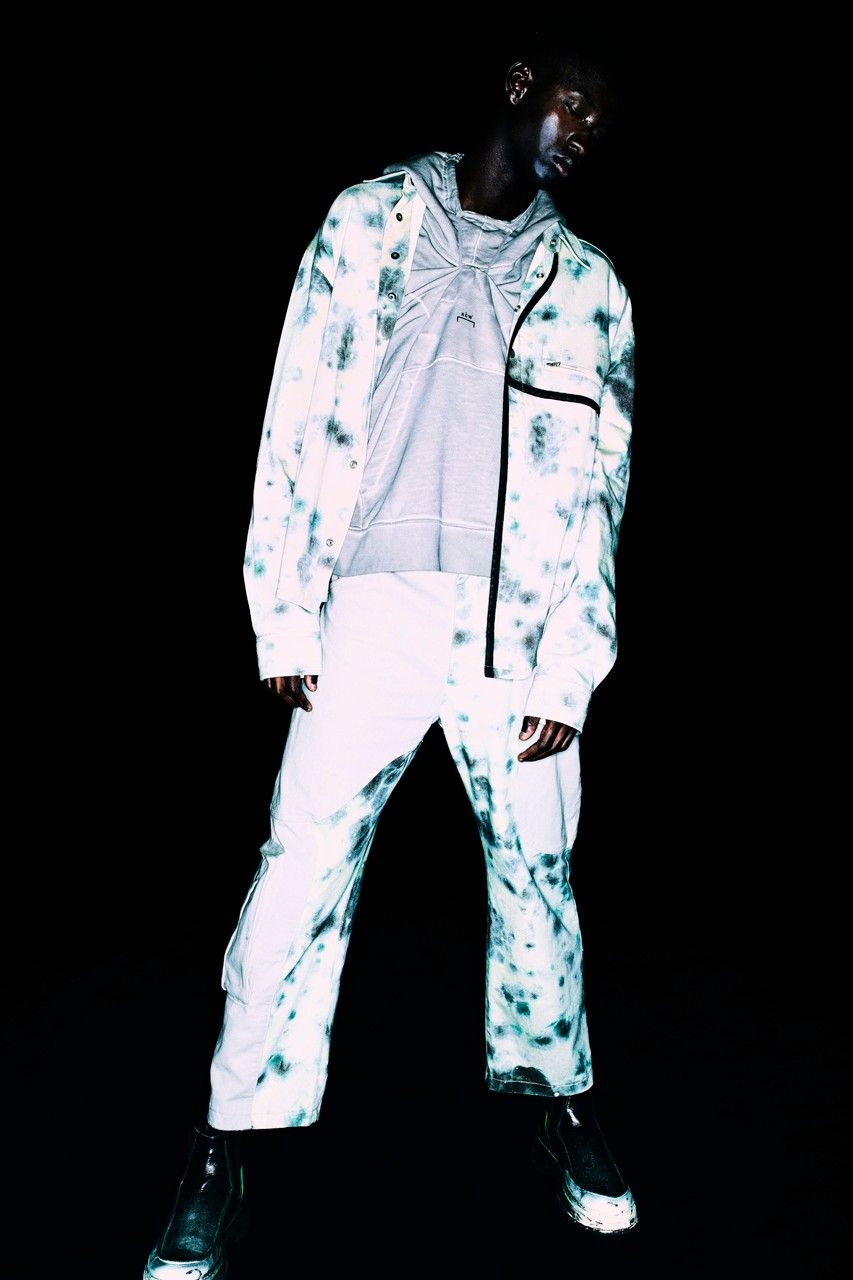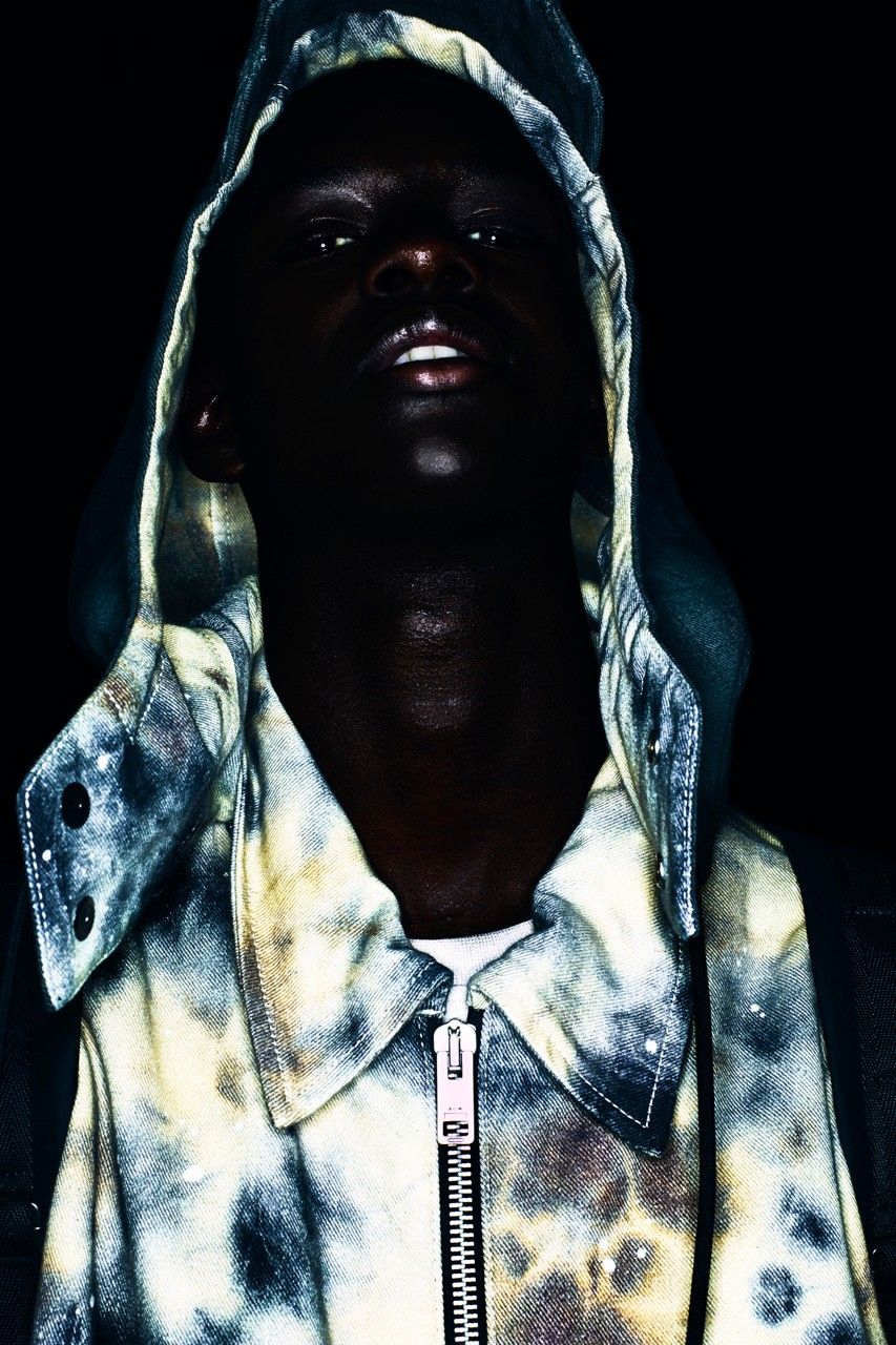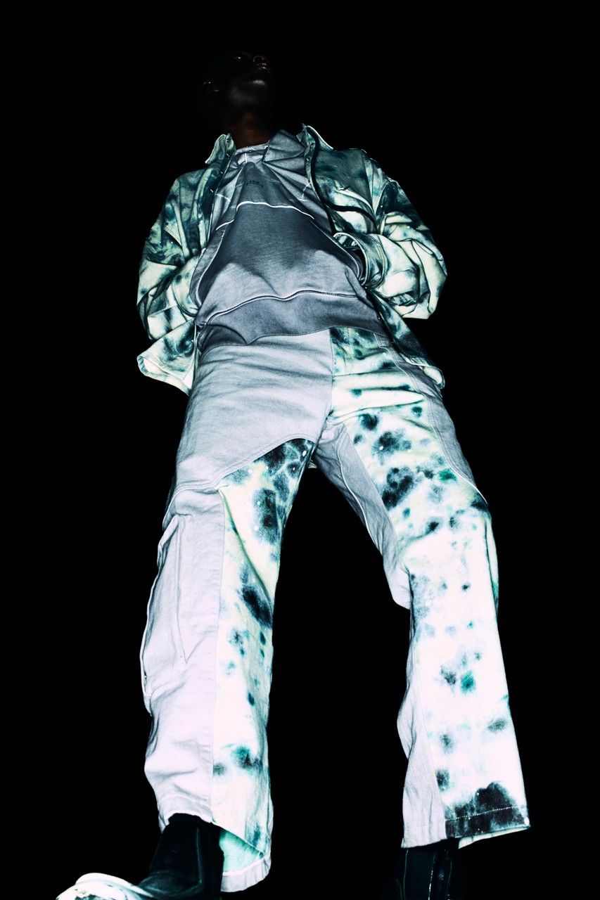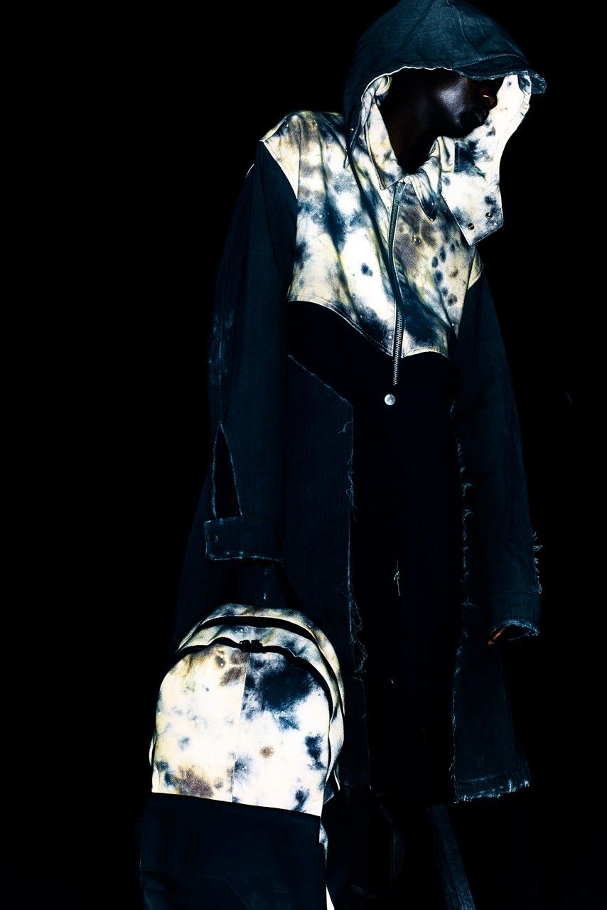 The capsule includes outerwear, t-shirts, hoodie, trousers and accessories. All garments represent a hybrid between Samuel Ross's conceptual and highly geometric design and the historical distressing techniques for which Diesel is well-known. The denim fabric mixes with the memory nylon in deconstructed pieces on which a white tye-dye pattern is the protagonist, along with translucent details and dévoré fabrics. Ross' dynamic design enriches classic workwear garments with patchwork constructions, cargo pockets and oblique or corner zips while the distressing technique is used to decorate insert hems and accessories.