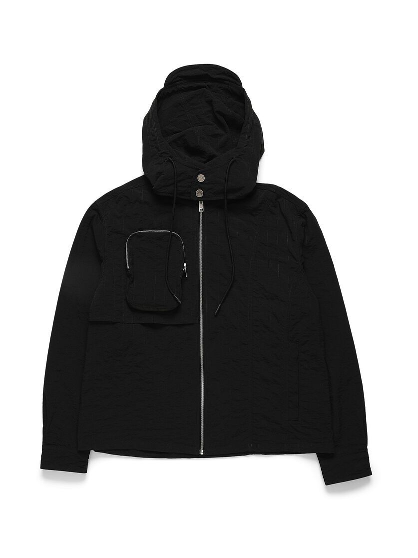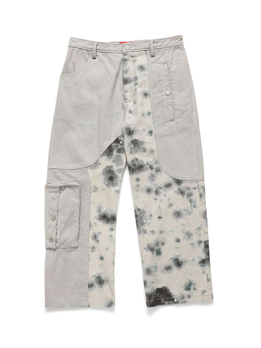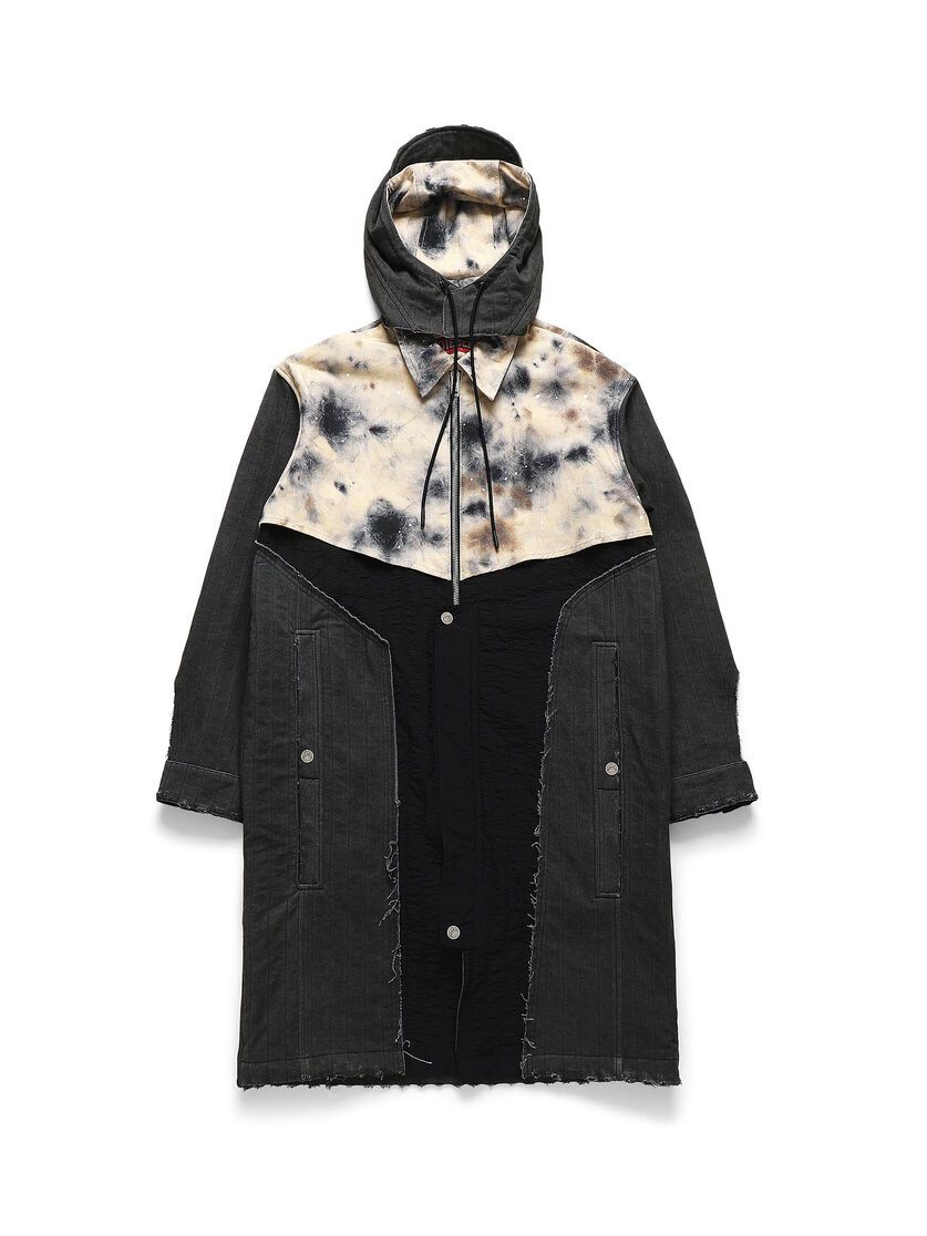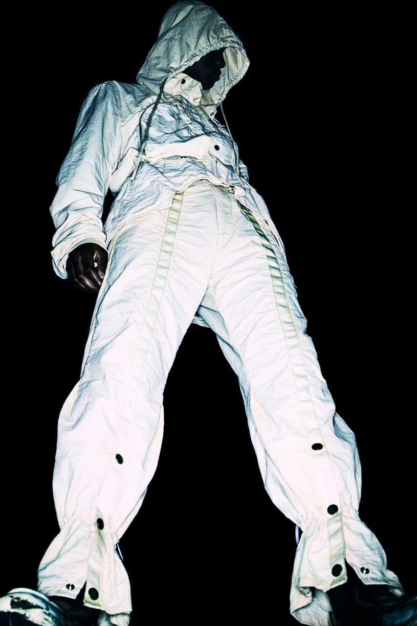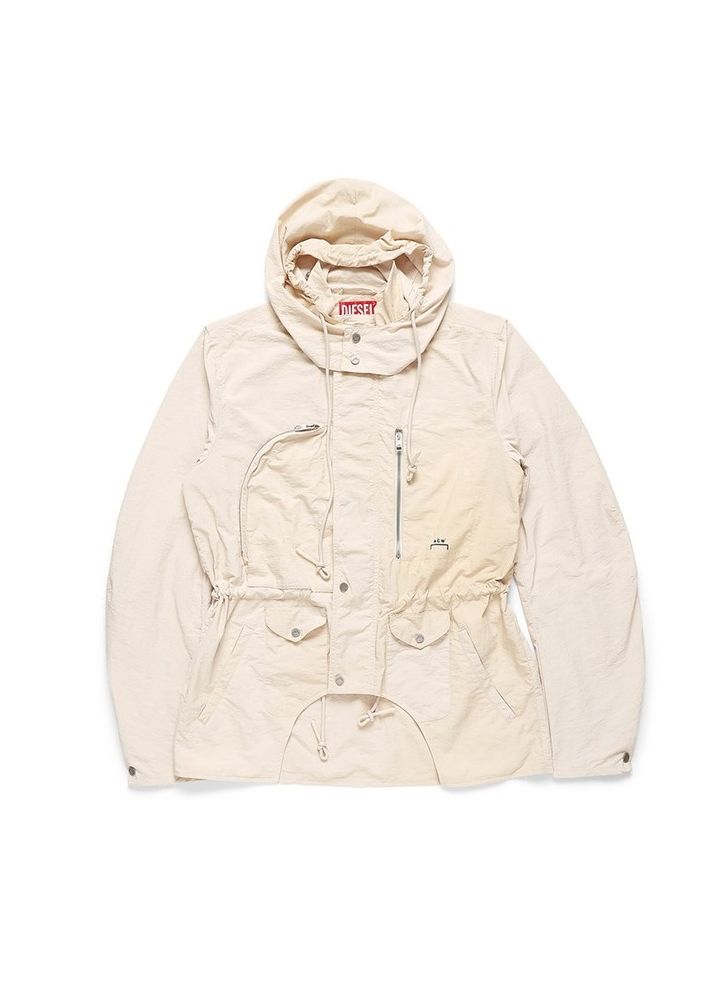 The capsule includes outerwear, t-shirts, hoodie, trousers and accessories. All garments represent a hybrid between Samuel Ross's conceptual and highly geometric design and the historical distressing techniques for which Diesel is well-known. The denim fabric mixes with the memory nylon in deconstructed pieces on which a white tye-dye pattern is the protagonist, along with translucent details and dévoré fabrics. Ross' dynamic design enriches classic workwear garments with patchwork constructions, cargo pockets and oblique or corner zips while the distressing technique is used to decorate insert hems and accessories.