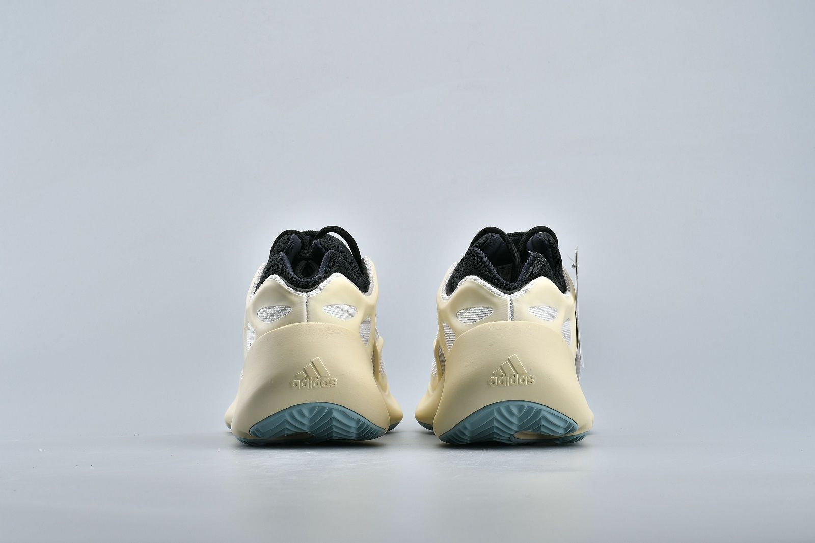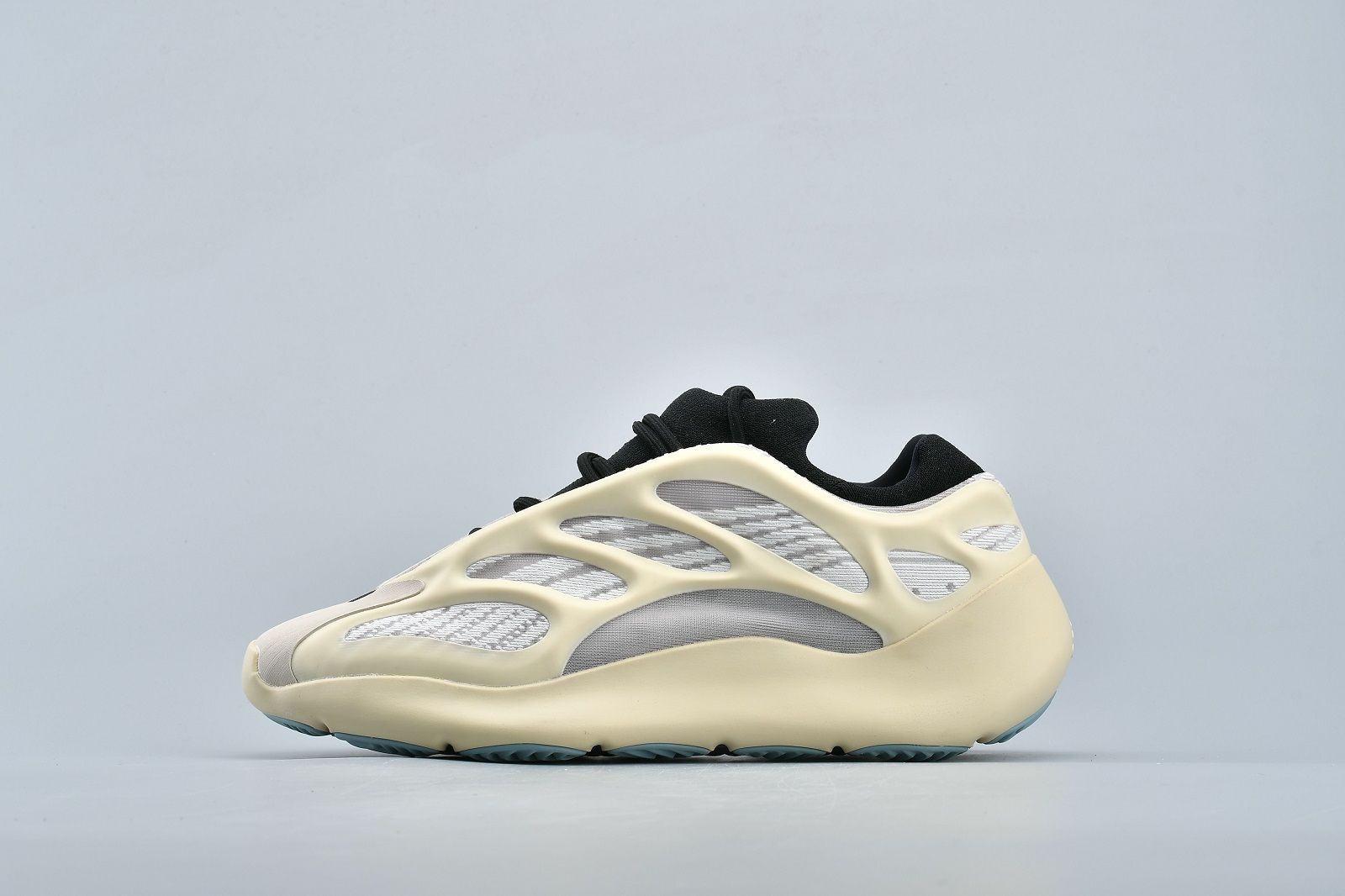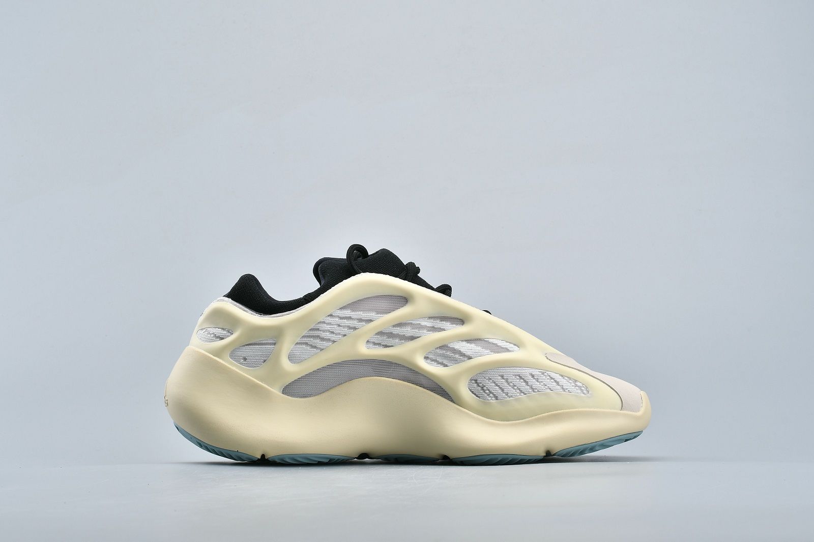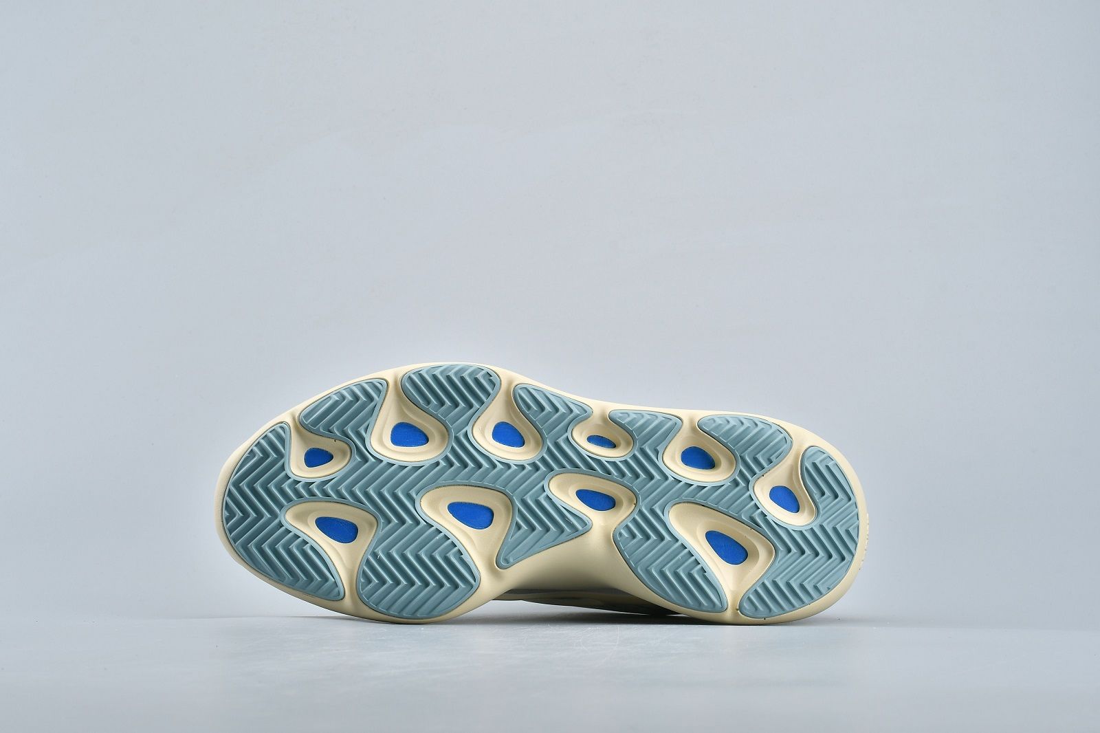 The main change from previous models of the Yeezy 700 is the white cage overlay that covers the mesh base of the upper, which becomes phosphorescent in the dark and gives a new softness to the silhouette. Another change, more subtle, is seen in the tongue, whose black contrasts with the light shades of the shoe, and which possesses a more tapered shape than the previous models. Another color note is given by the blue outer sole. In addition, this sneaker is the first one that does not use adidas Boost technology.