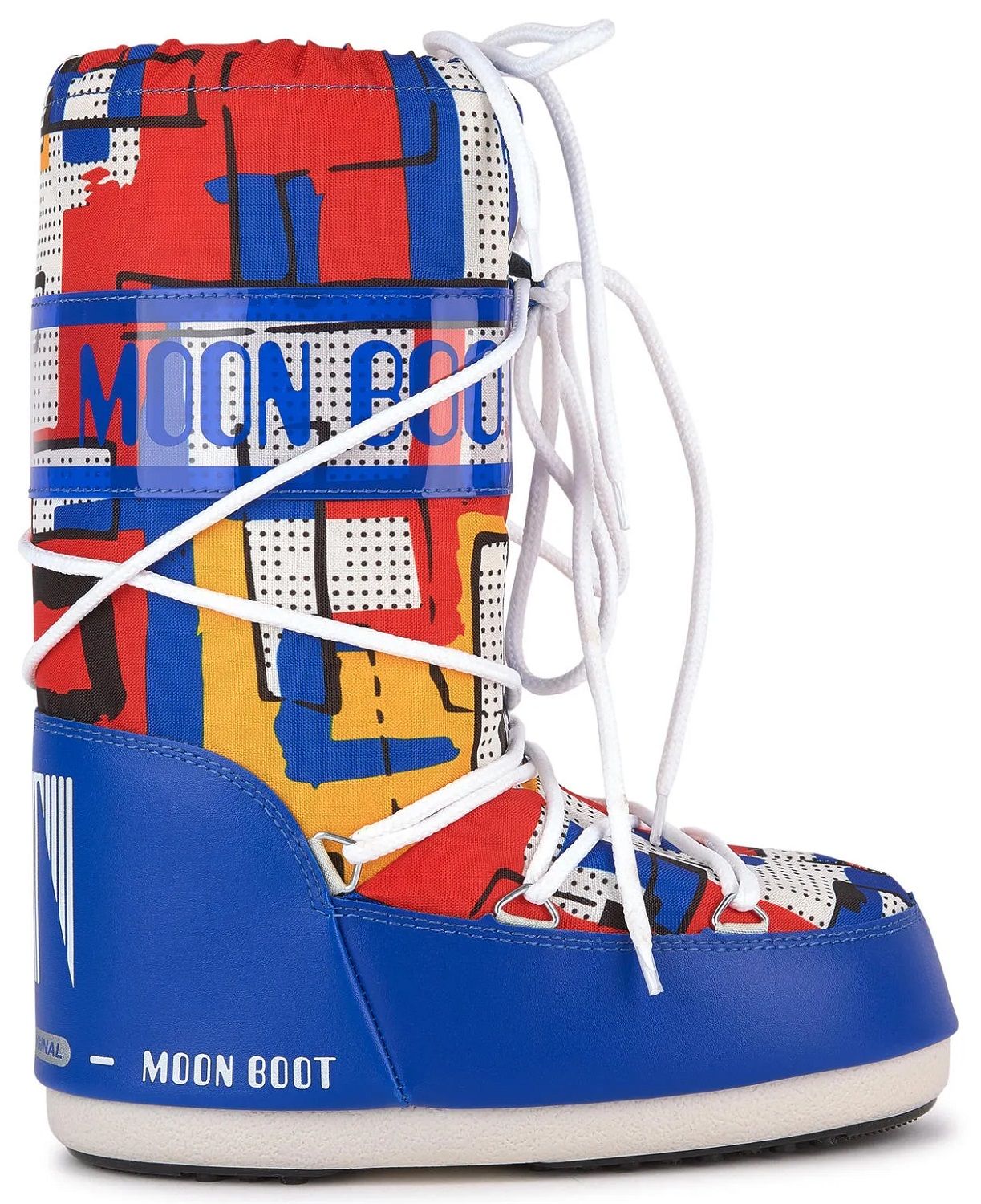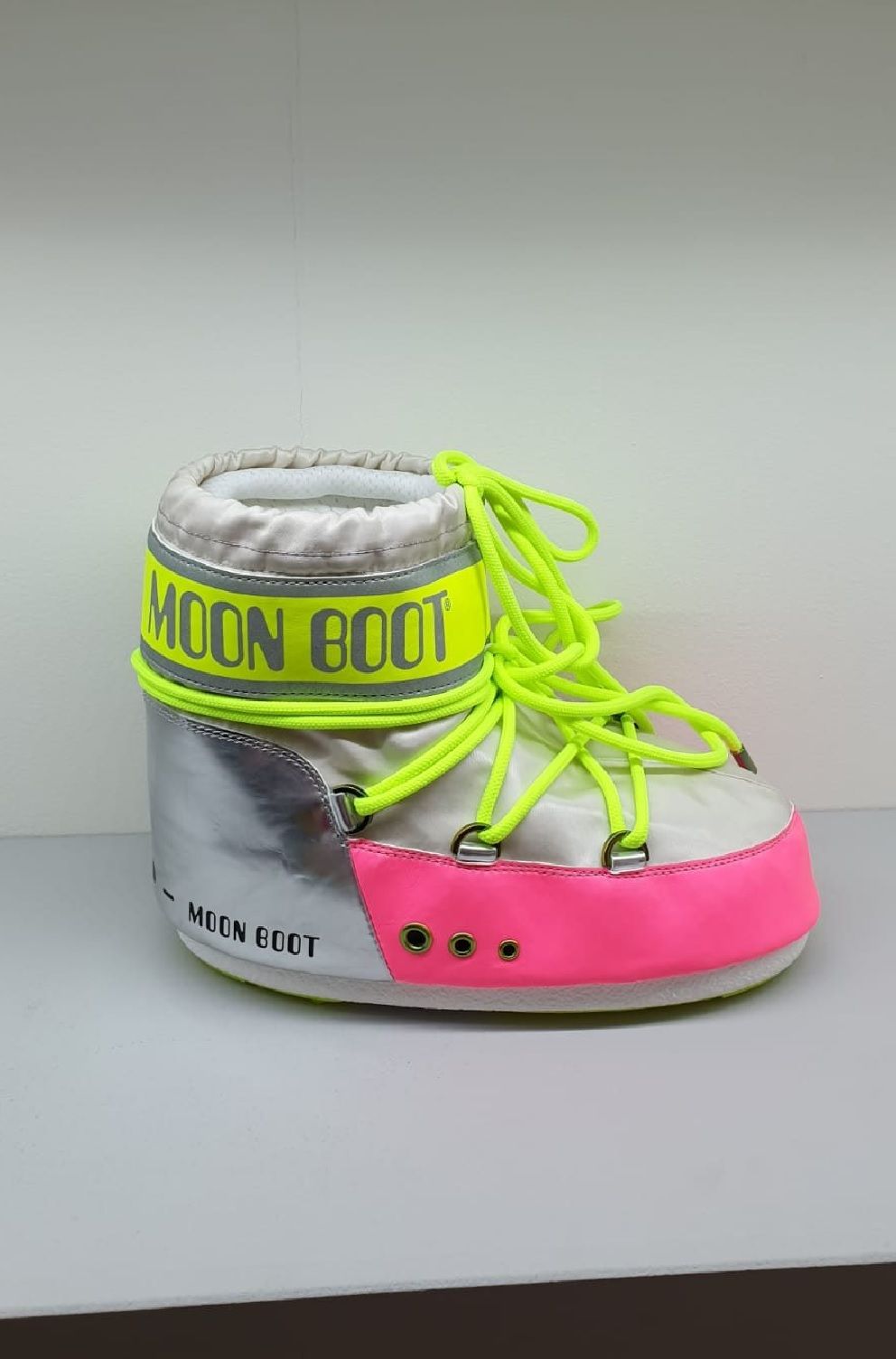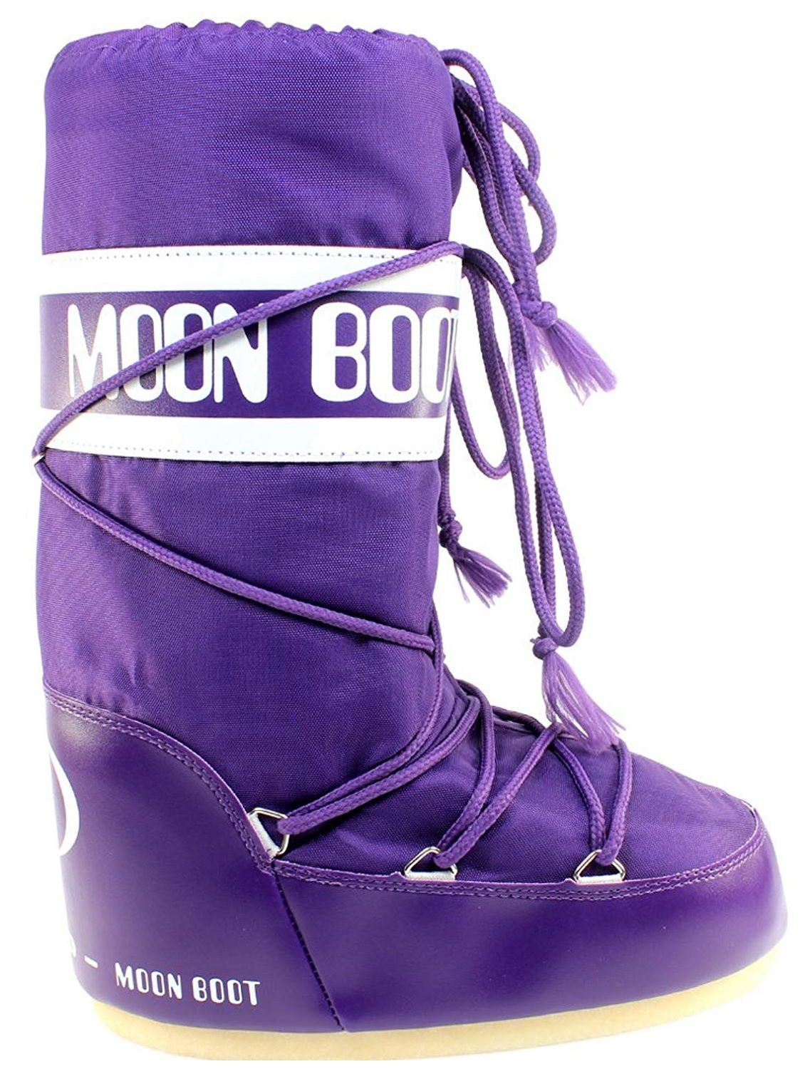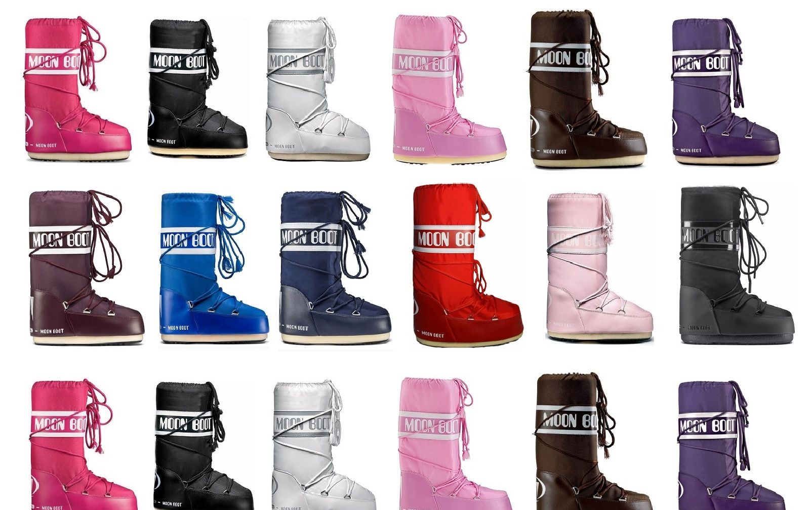 Moon Boots are basic, funny, low cost, unisex, characterized by waterproof nylon outer lining, foam rubber as thermal insulation, oval and non-slip sole and decorated with a large inscription on the neck of the shoe. Moreover, a great innovation for a pair of after-ski boots, they are colorful. Over the years, many different versions have been made: purple, green, yellow, rainbow, with ladybugs, with butterflies, glitter, with prints inspired by pop art or abstract art, tribute to Star Wars, animalier, hairy, ... Many of these are the result of capsule collections with other brands such as Jeremy Scott, Bourbonese, Jimmy Choo, MSGM, Moncler, 10 Corso Como.