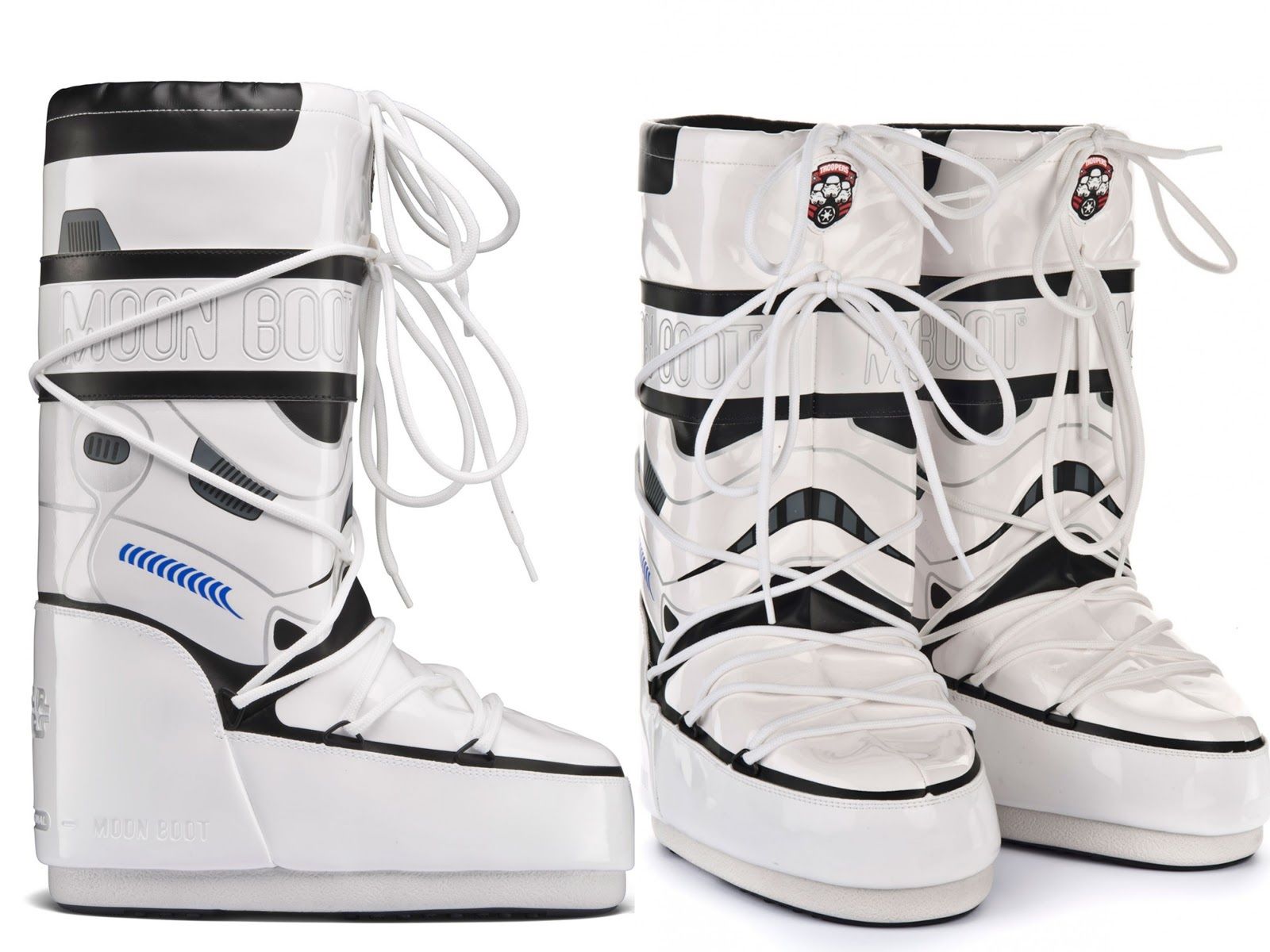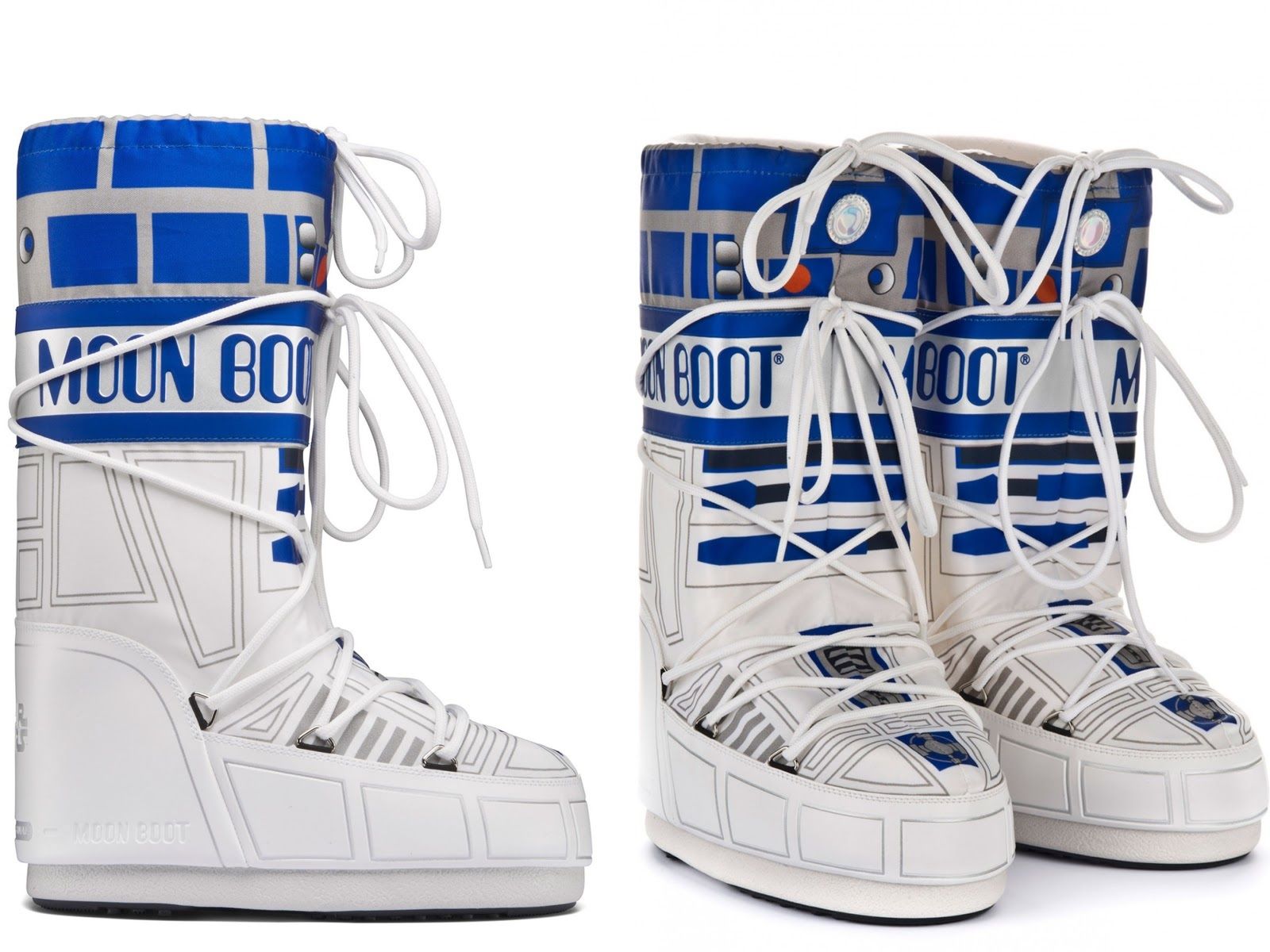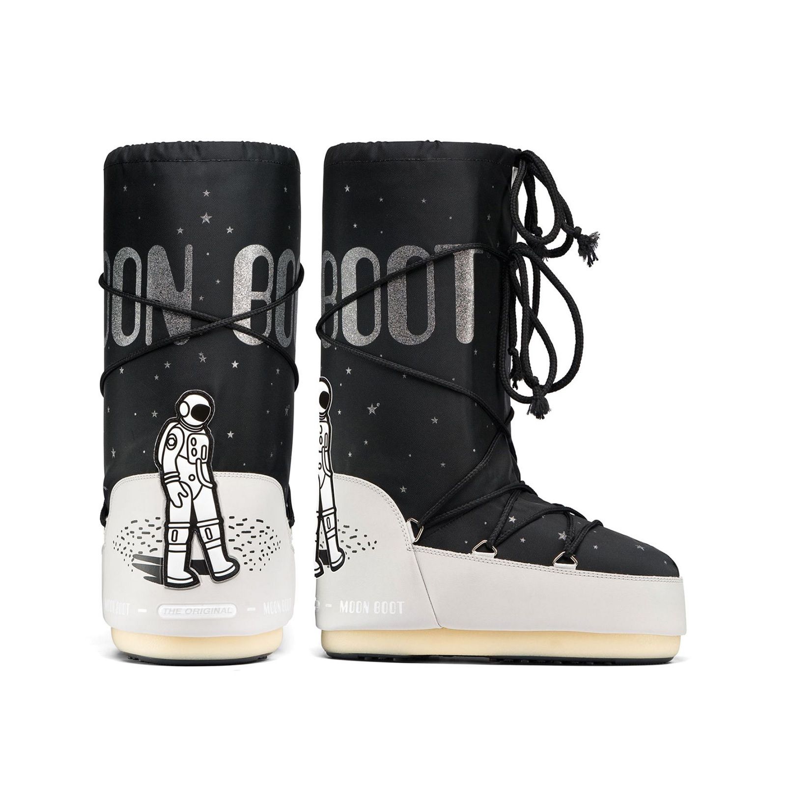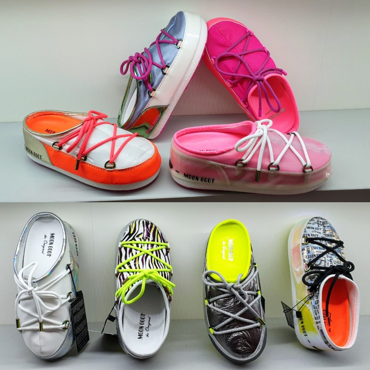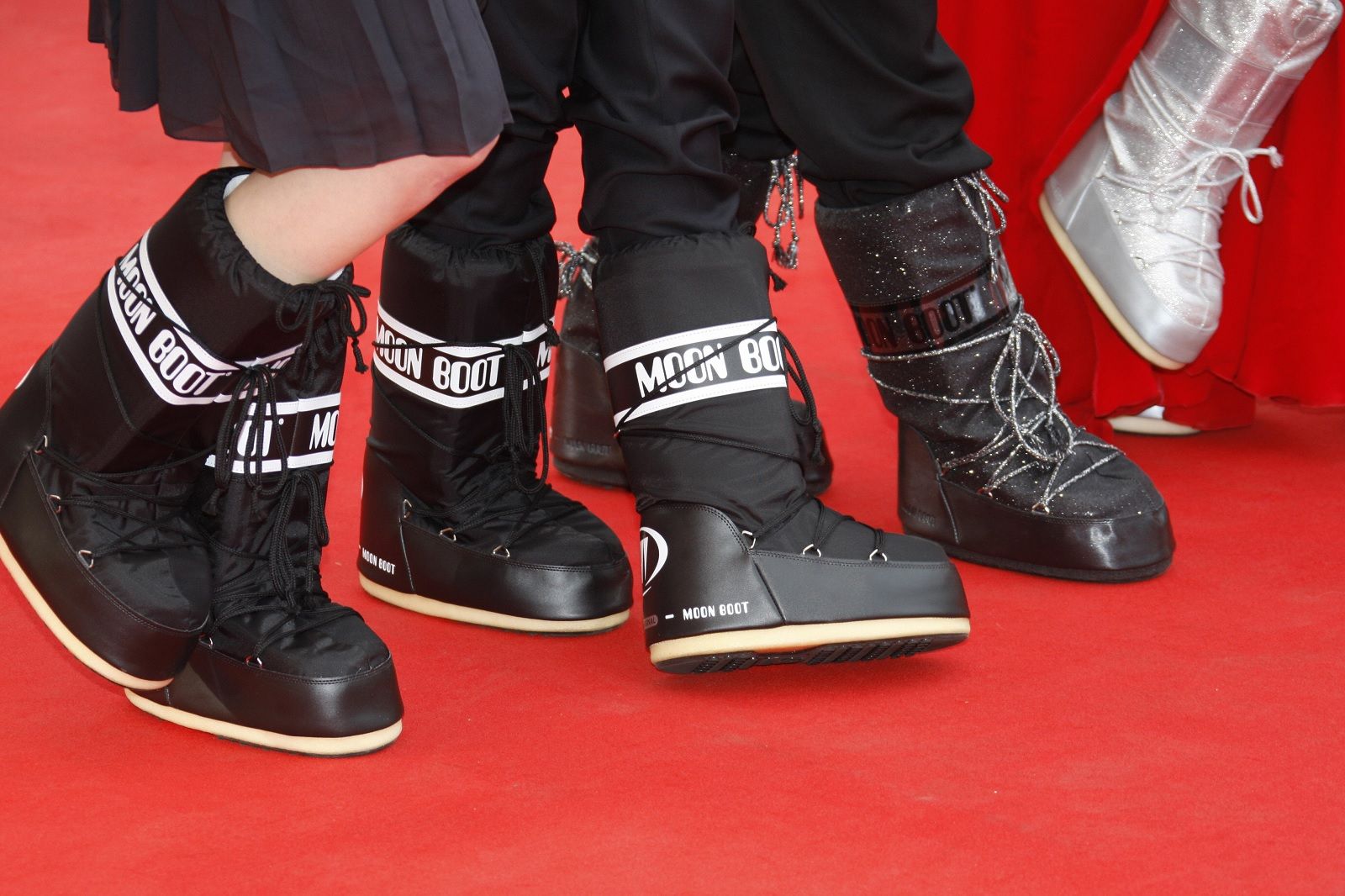 Moon Boots are basic, funny, low cost, unisex, characterized by waterproof nylon outer lining, foam rubber as thermal insulation, oval and non-slip sole and decorated with a large inscription on the neck of the shoe. Moreover, a great innovation for a pair of after-ski boots, they are colorful. Over the years, many different versions have been made: purple, green, yellow, rainbow, with ladybugs, with butterflies, glitter, with prints inspired by pop art or abstract art, tribute to Star Wars, animalier, hairy, ... Many of these are the result of capsule collections with other brands such as Jeremy Scott, Bourbonese, Jimmy Choo, MSGM, Moncler, 10 Corso Como.