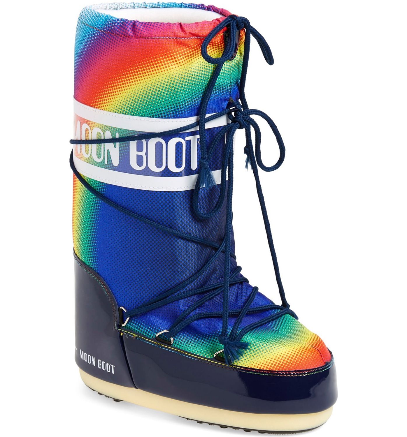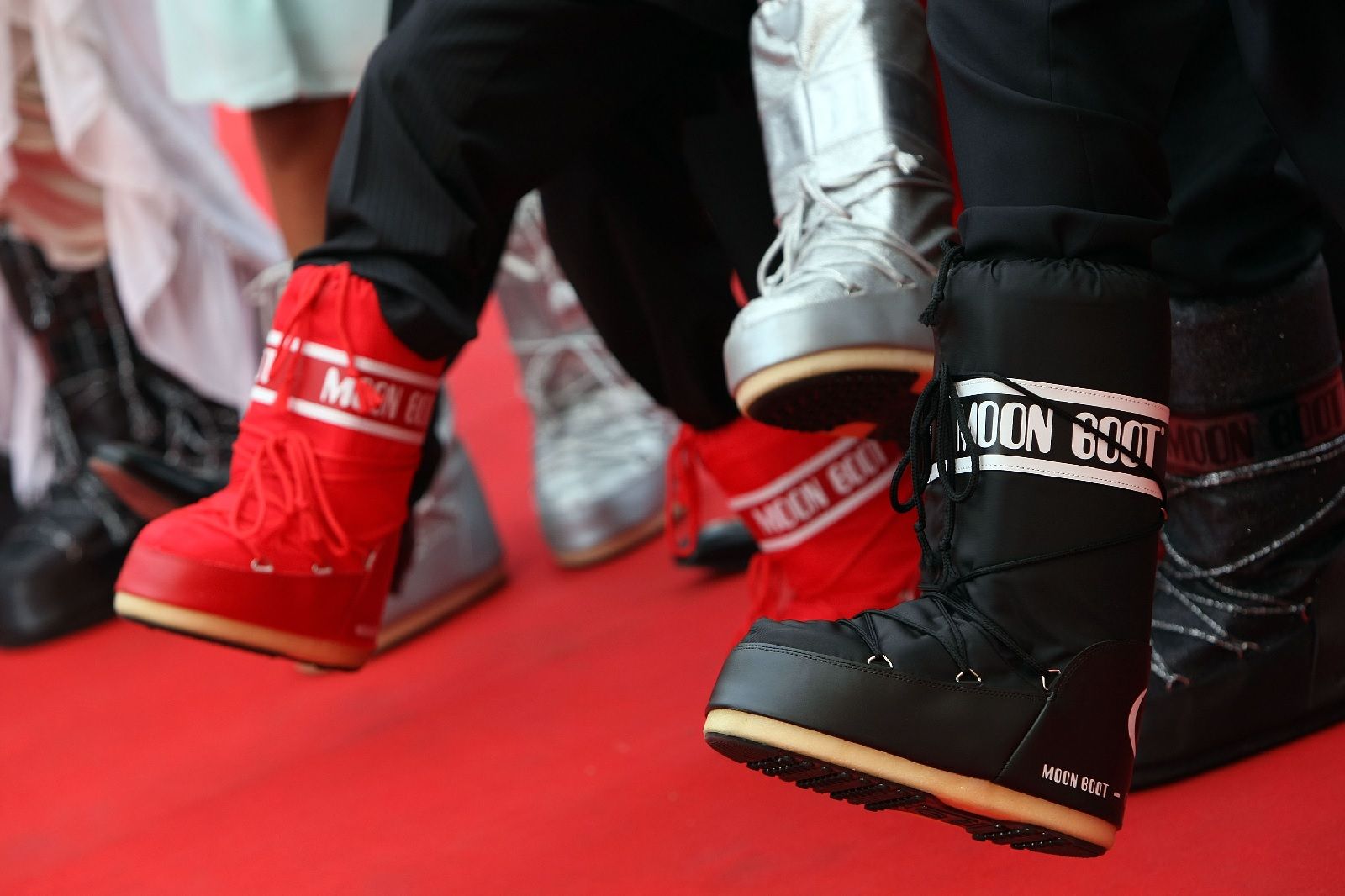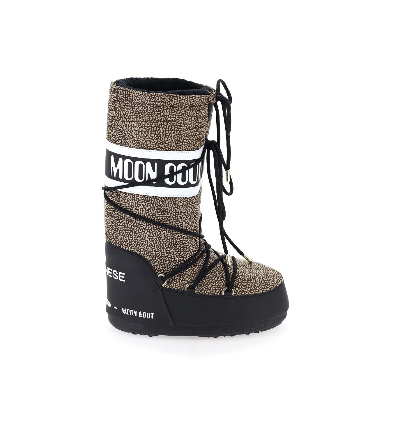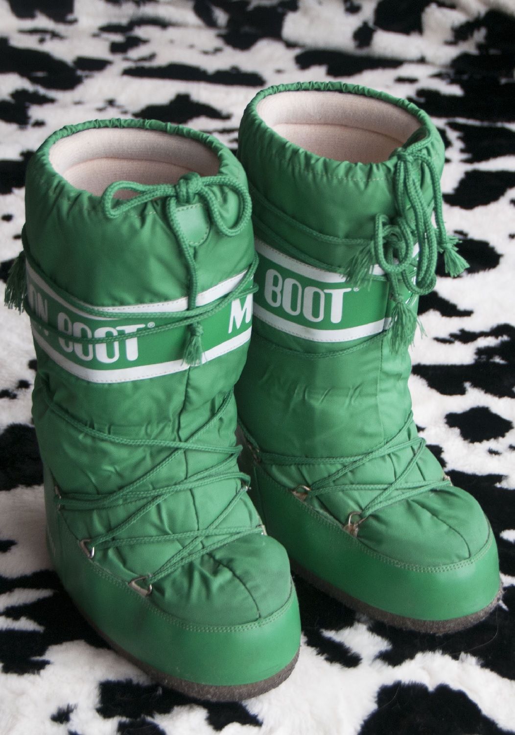 Moon Boots are basic, funny, low cost, unisex, characterized by waterproof nylon outer lining, foam rubber as thermal insulation, oval and non-slip sole and decorated with a large inscription on the neck of the shoe. Moreover, a great innovation for a pair of after-ski boots, they are colorful. Over the years, many different versions have been made: purple, green, yellow, rainbow, with ladybugs, with butterflies, glitter, with prints inspired by pop art or abstract art, tribute to Star Wars, animalier, hairy, ... Many of these are the result of capsule collections with other brands such as Jeremy Scott, Bourbonese, Jimmy Choo, MSGM, Moncler, 10 Corso Como.