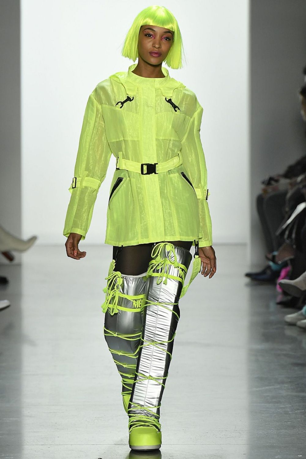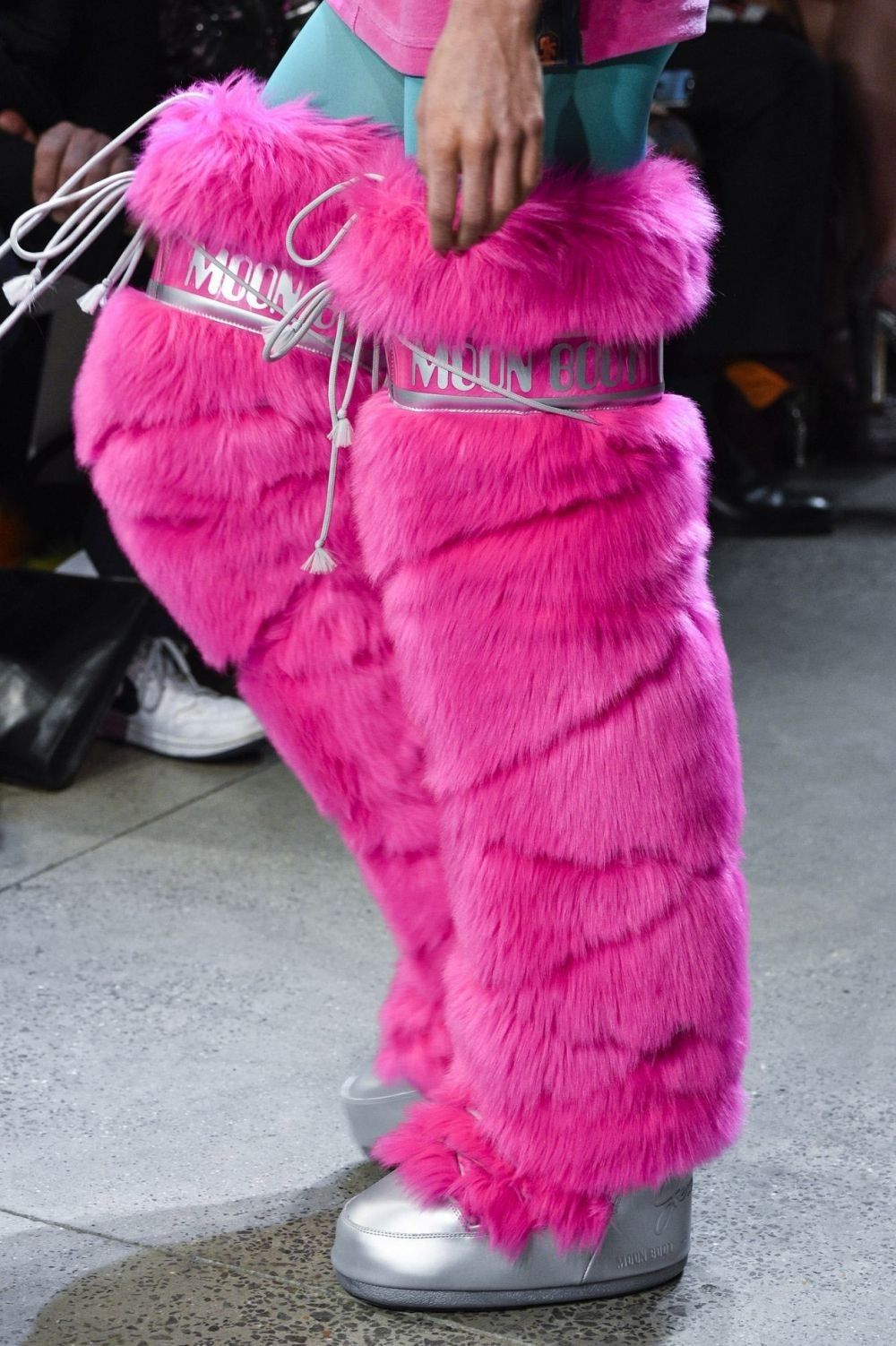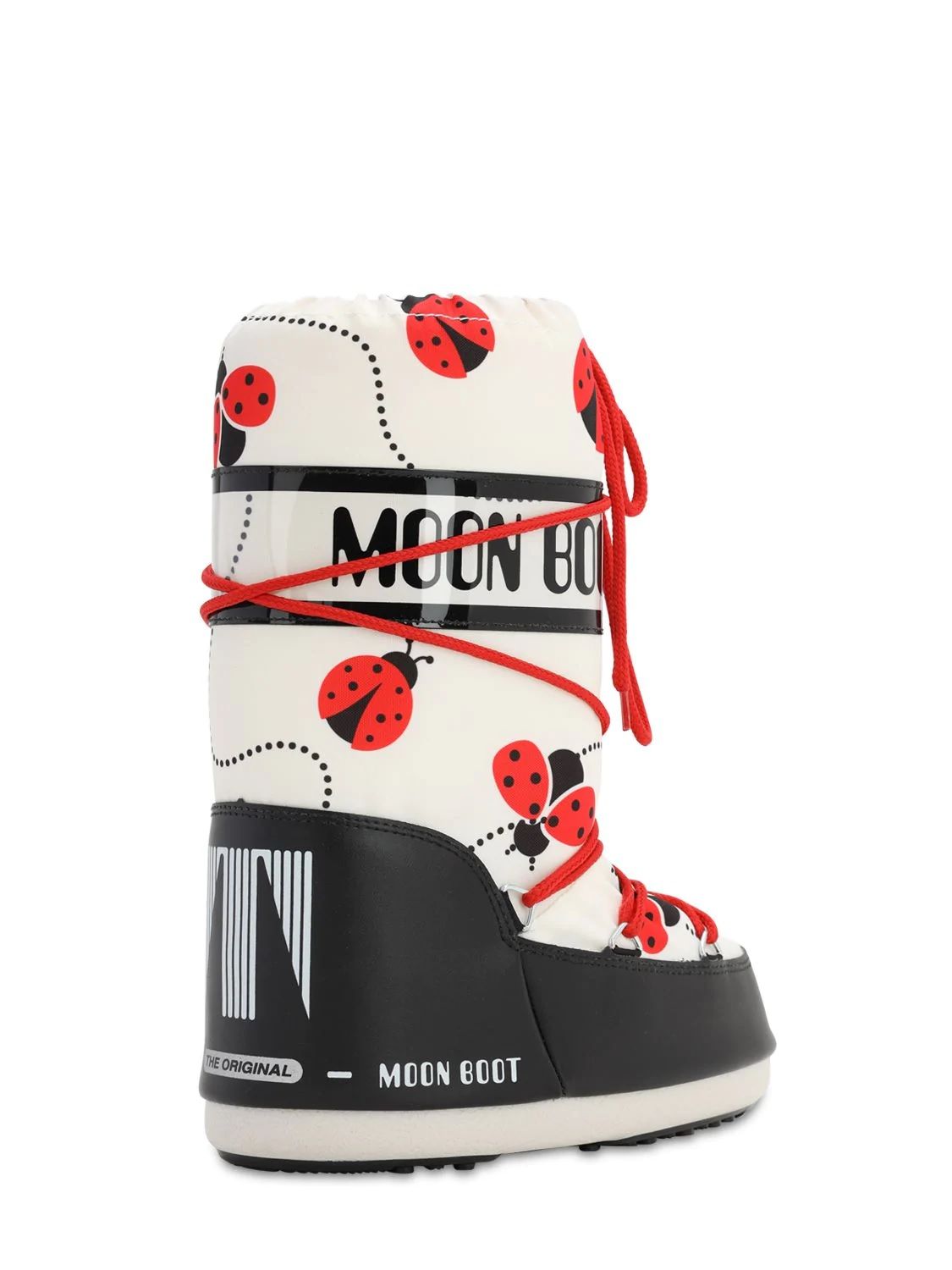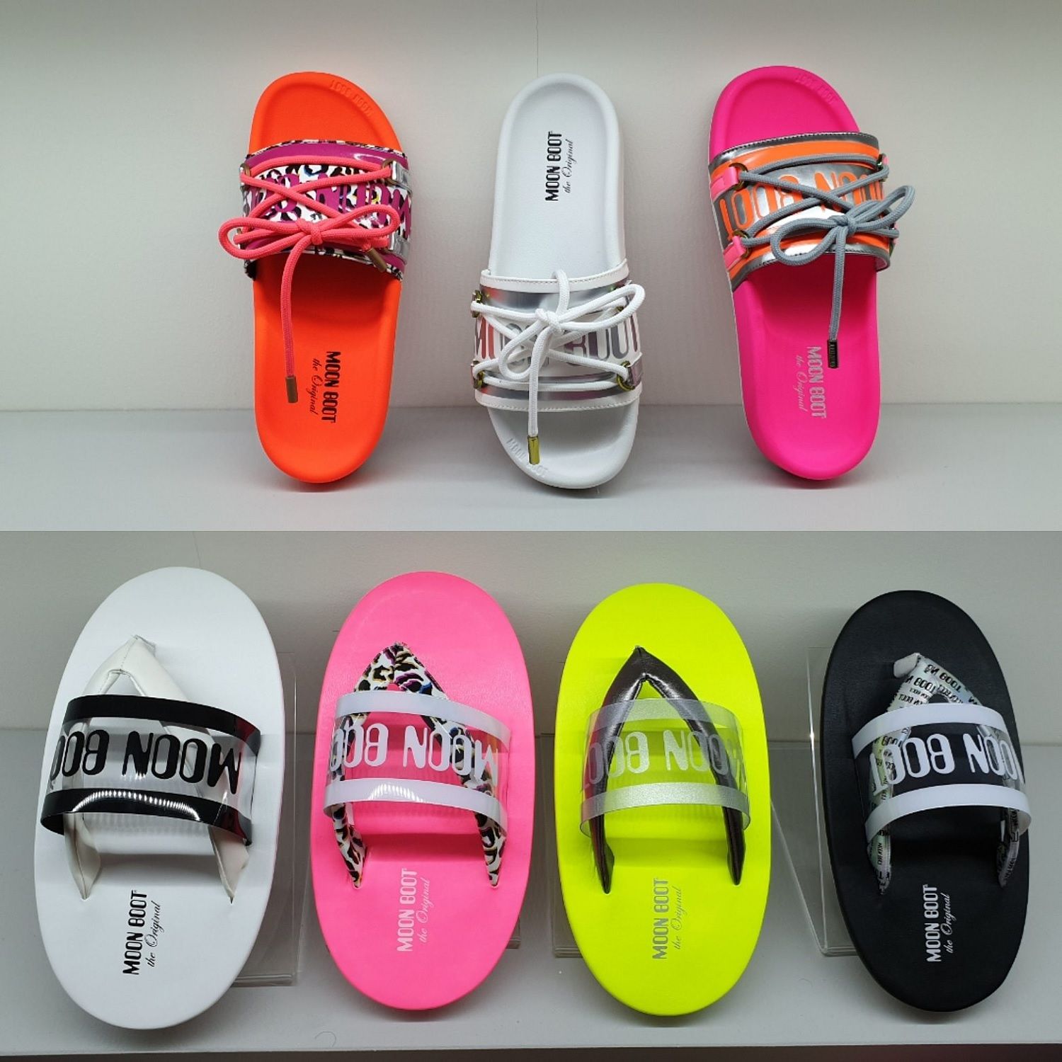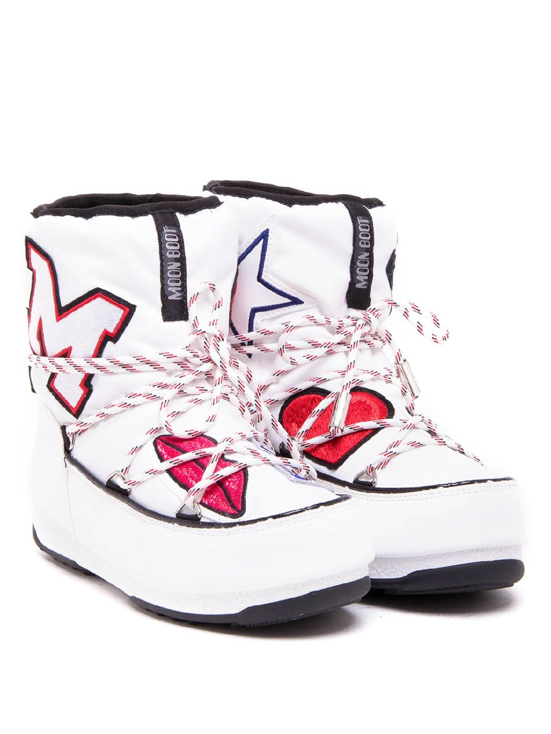 Moon Boots are basic, funny, low cost, unisex, characterized by waterproof nylon outer lining, foam rubber as thermal insulation, oval and non-slip sole and decorated with a large inscription on the neck of the shoe. Moreover, a great innovation for a pair of after-ski boots, they are colorful. Over the years, many different versions have been made: purple, green, yellow, rainbow, with ladybugs, with butterflies, glitter, with prints inspired by pop art or abstract art, tribute to Star Wars, animalier, hairy, ... Many of these are the result of capsule collections with other brands such as Jeremy Scott, Bourbonese, Jimmy Choo, MSGM, Moncler, 10 Corso Como.