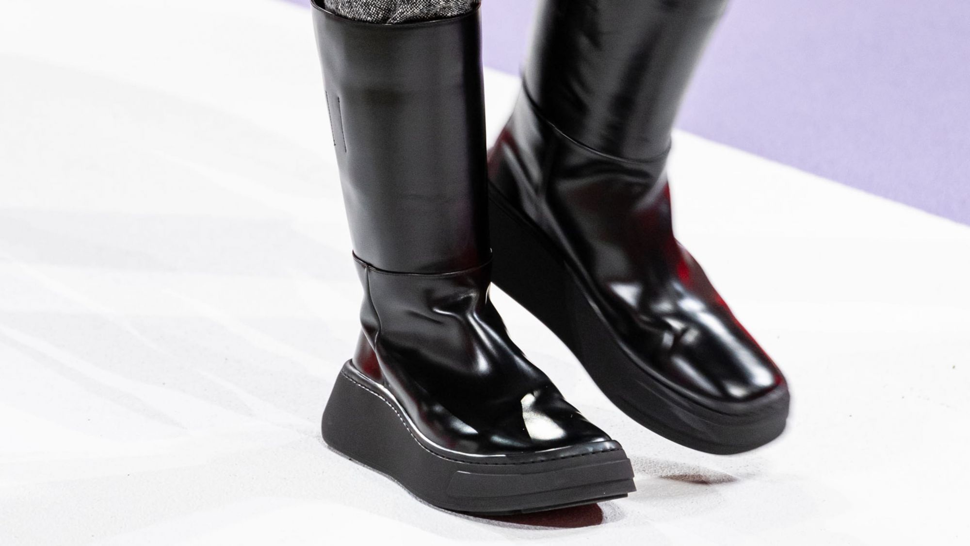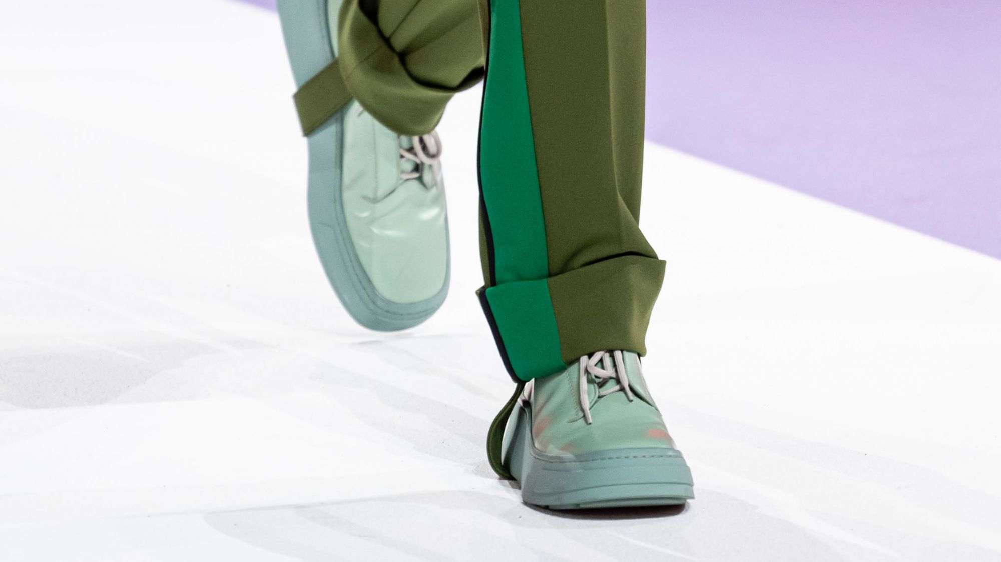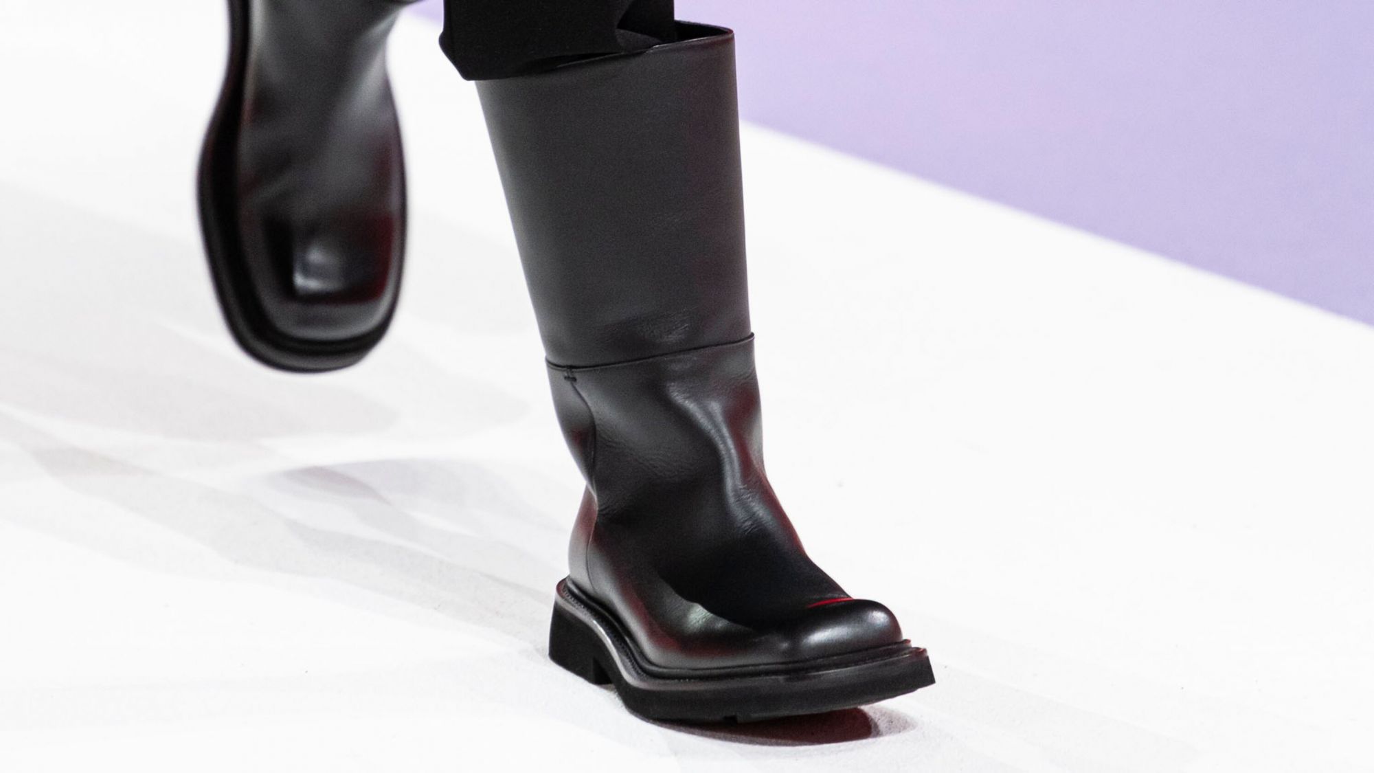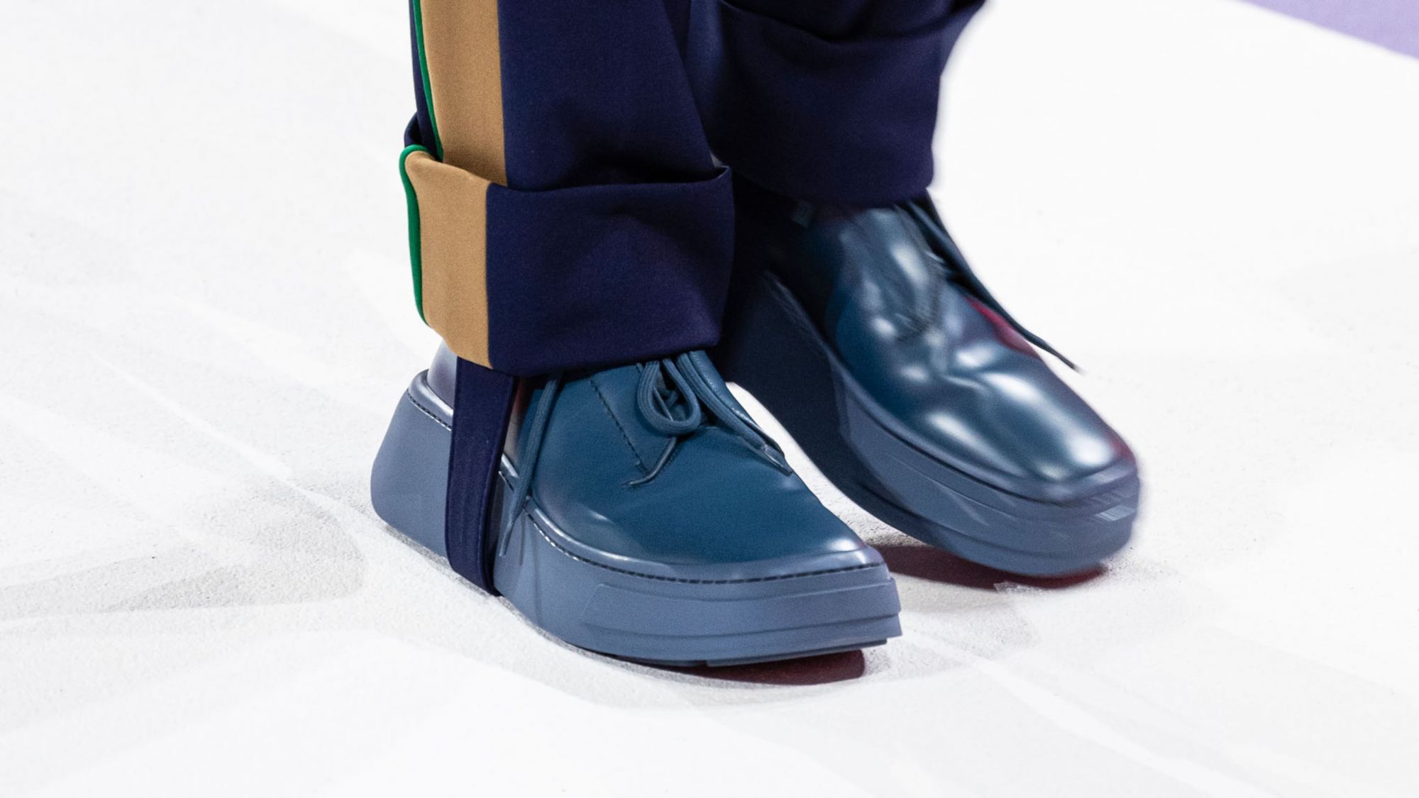 Another sneaker that has been spotted is a minimalistic version of the Derby Sneaker, made of brushed leather, with a flashy platform sole and a lace system in which the eyelets are hidden by a layer of leather, present in a blue colorway, a black and a one mint green. The oversized leather boots that dominated most of the looks, however, seem to be a luxury iteration of the classic Wellington Boot.