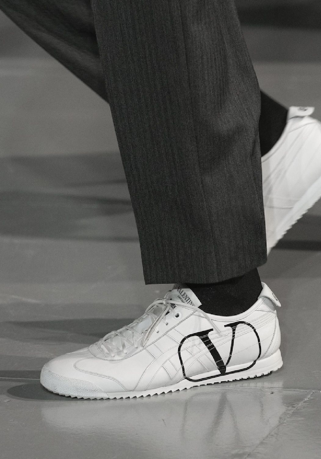 Piccioli reworked one of the most iconic models of the Japanese brand: Mexico 66 SD. The shoe, which debuted during the 1968 Summer Olympics in Mexico and became so popular that it was worn by Bruce Lee and Uma Thurman in Kill Bill, now gets a minimalist design. The sneaker is made special by Valentino V logo hand-printed on the side over the Onitsuka Tiger stripes, and by an additional co-branded logo on the shoe-tongue and insole. The midsole features superior cushioning and a durable, non-slip outersole. On the catwalk, it was revealed only the white version, but the collection will also include neon orange, pink and yellow. The collaboration will be officially launched in summer 2020, when it will be available in selected Valentino boutiques around the world and on valentino.com. An edition in the Japanese brand's tricolor shades of white, red and blue will also be sold in selected Onitsuka Tiger stores and online on onitsukatiger.com.