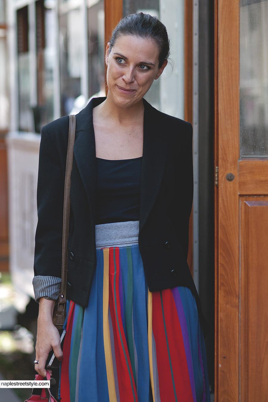 Lo start-up con Fendi alle ore 11.30. Look spaziale nel senso puro del termine. Una donna aliena trasferita sulla terra; una mutante vestita di quotidianità. Tagli che ricordano ovviamente i mitici anni '70 sapientemente miscelati a righe di colori alterni (bianco e giallo/bianco e polvere).