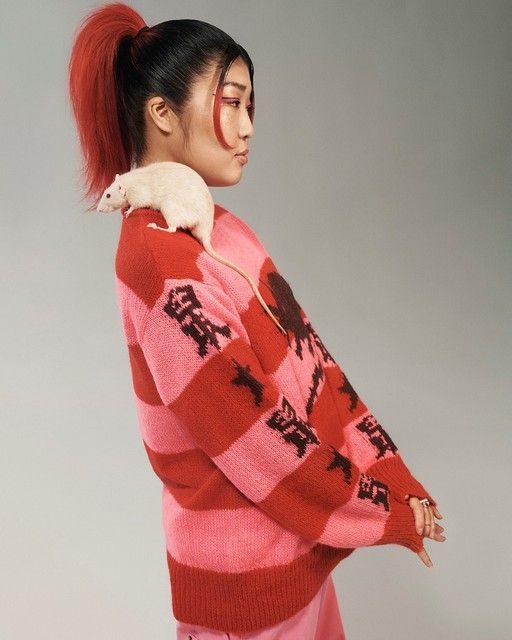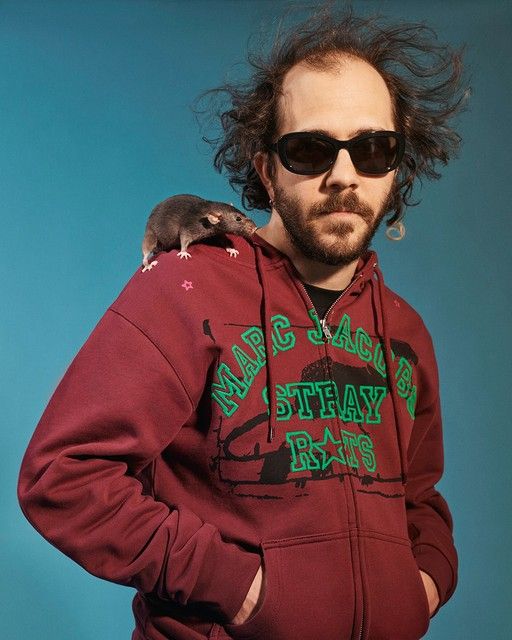 In addition to the brand name and the occasion of the Chinese Year of the Mouse, the collection also refers to the "Stinky Rat" line created by Jacobs in 2000. The capsule consists of four pieces: a t-shirt, a hoodie and two sweaters with a grunge inspiration. The most interesting piece is also the one worn by Ocean in the lookbook, namely acid green and purple Grunge Sweater.